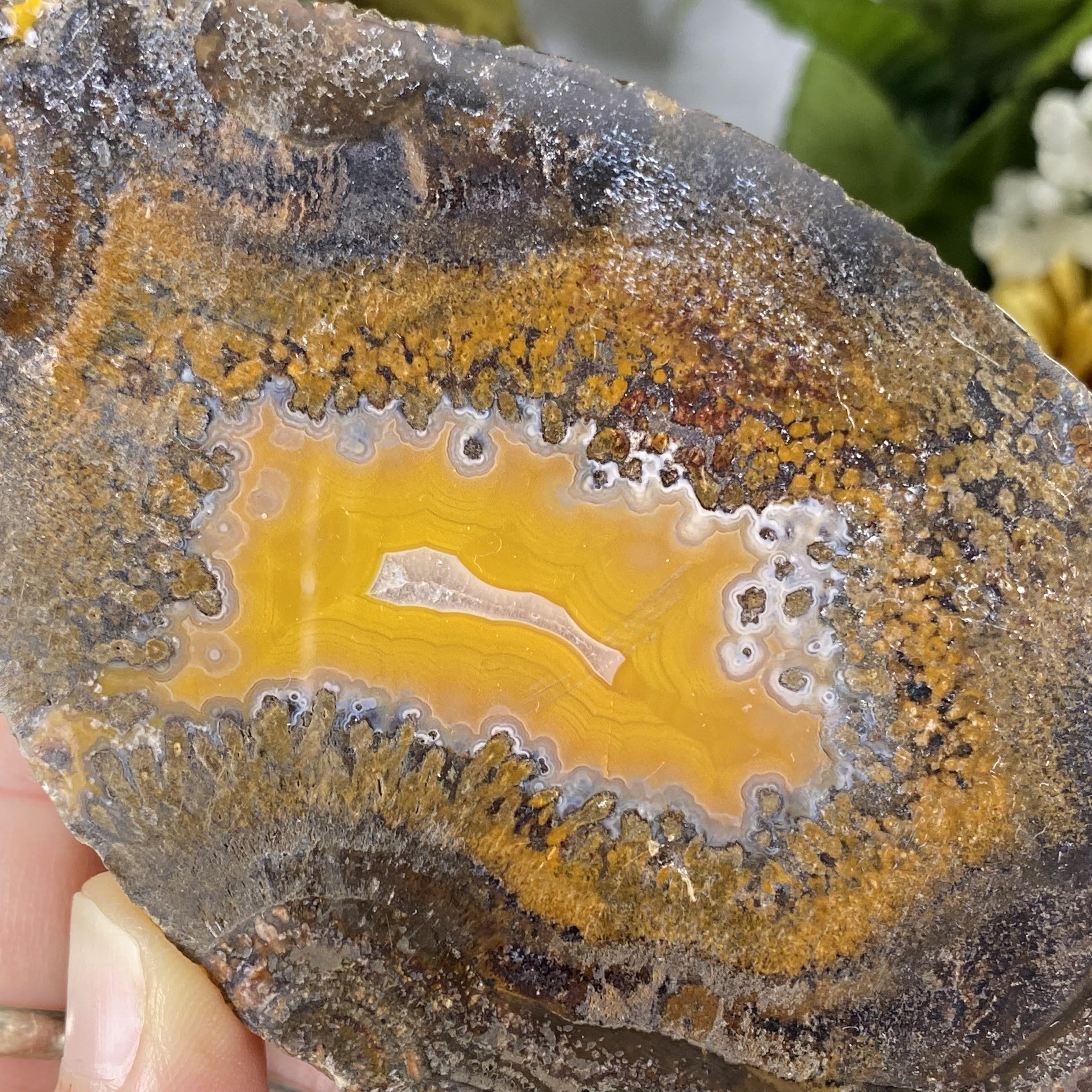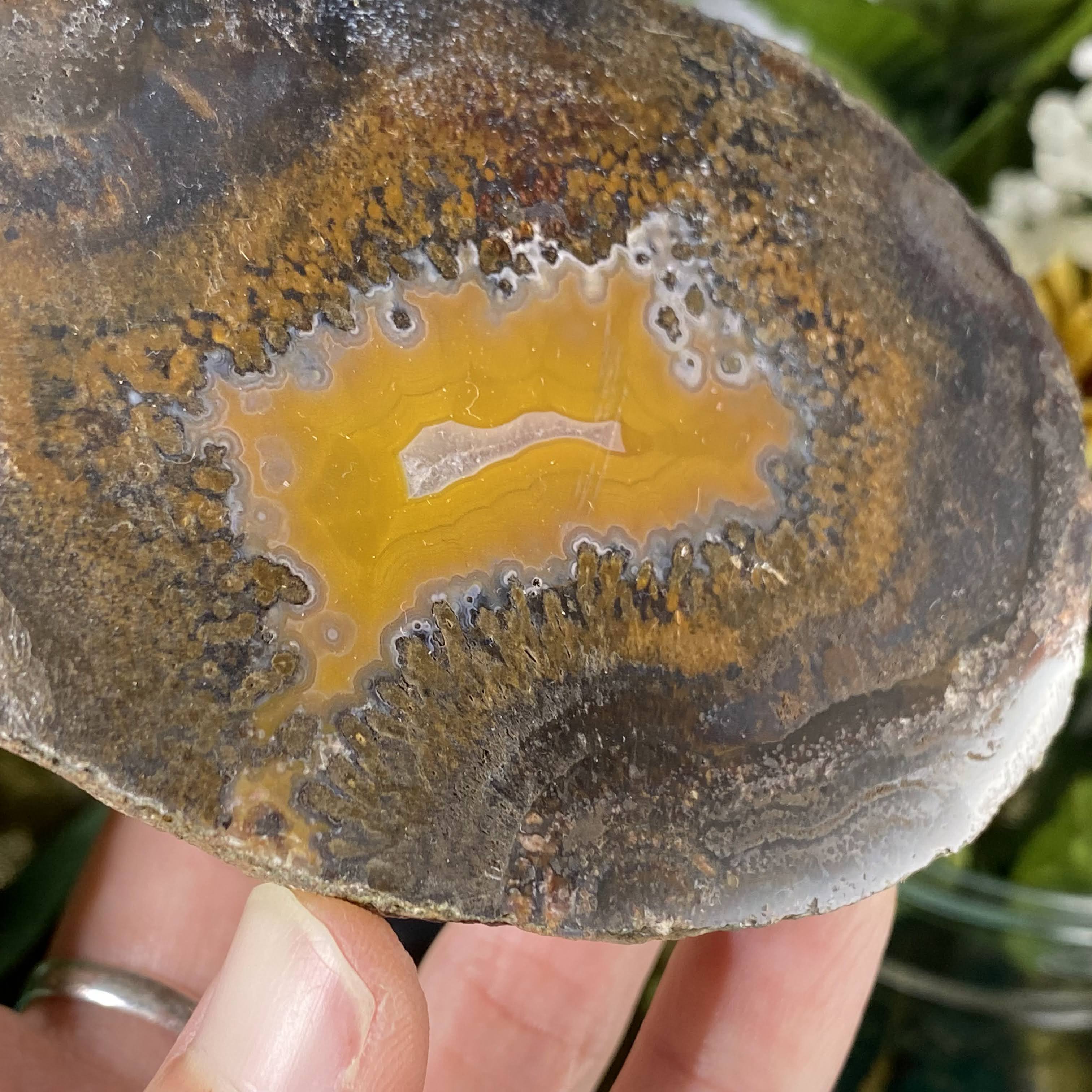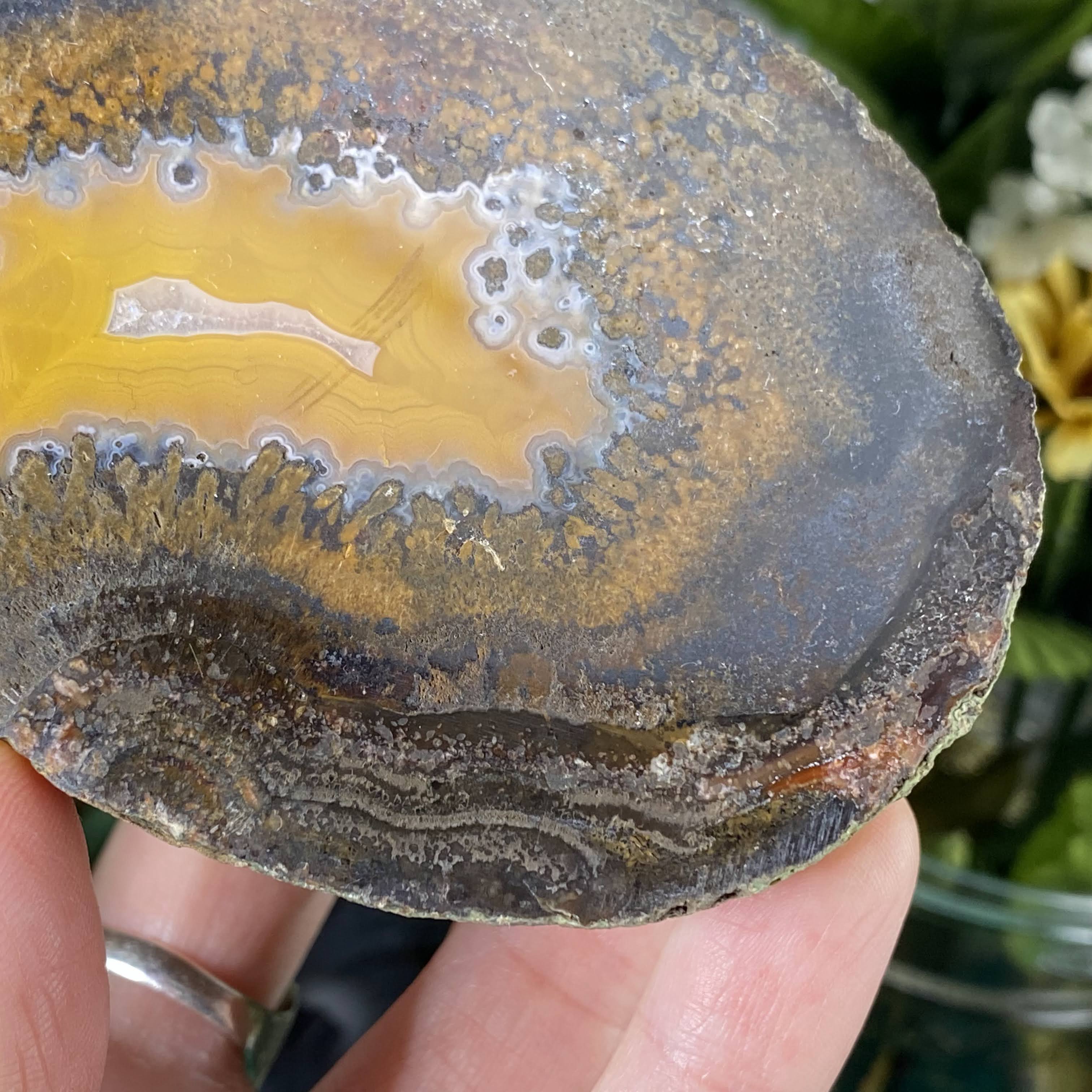 My goodness what a sweet agate nodule half this is! This one is half an agate nodule that has been polished on the sliced side. So many beautiful details and colors to get lost in, very beautiful one here!