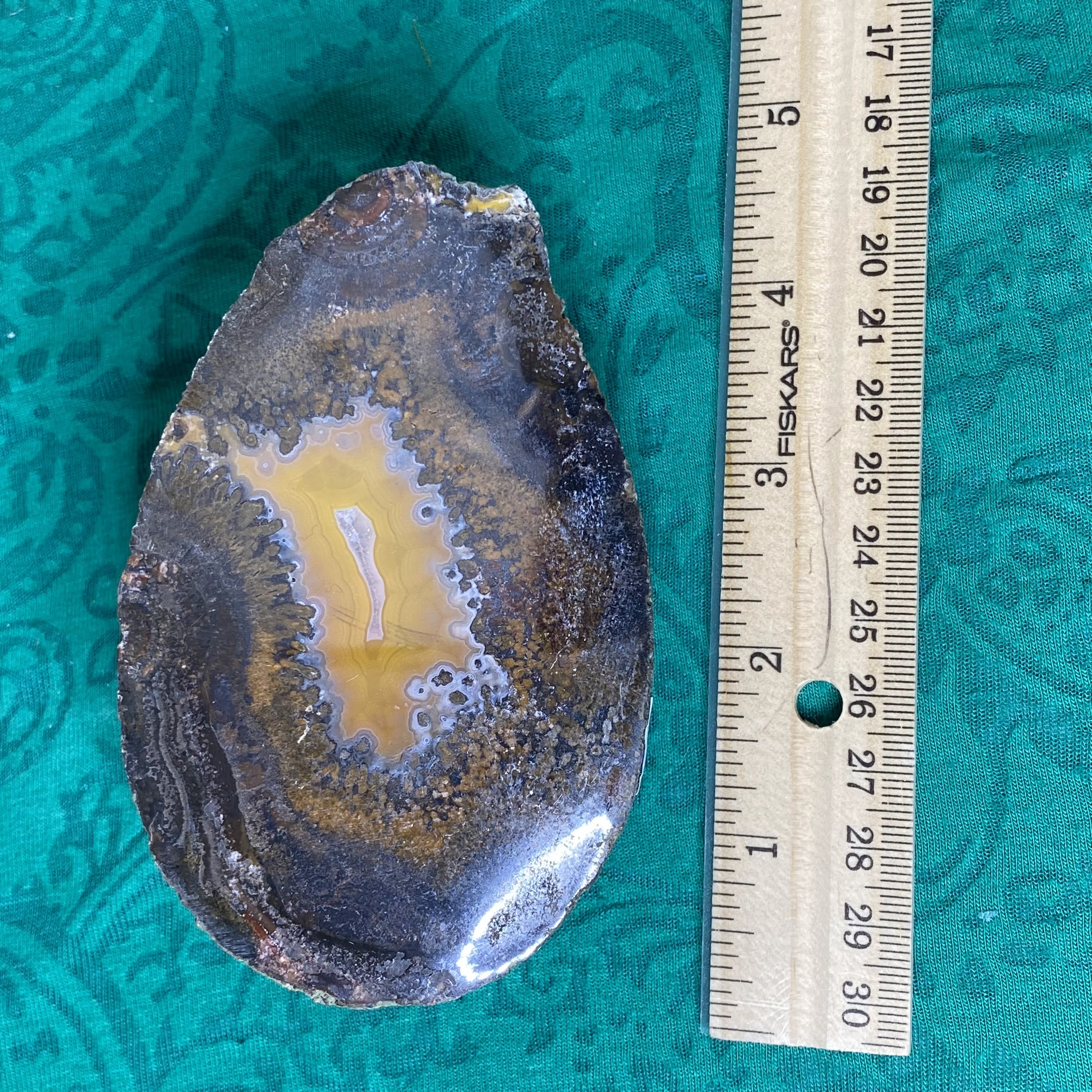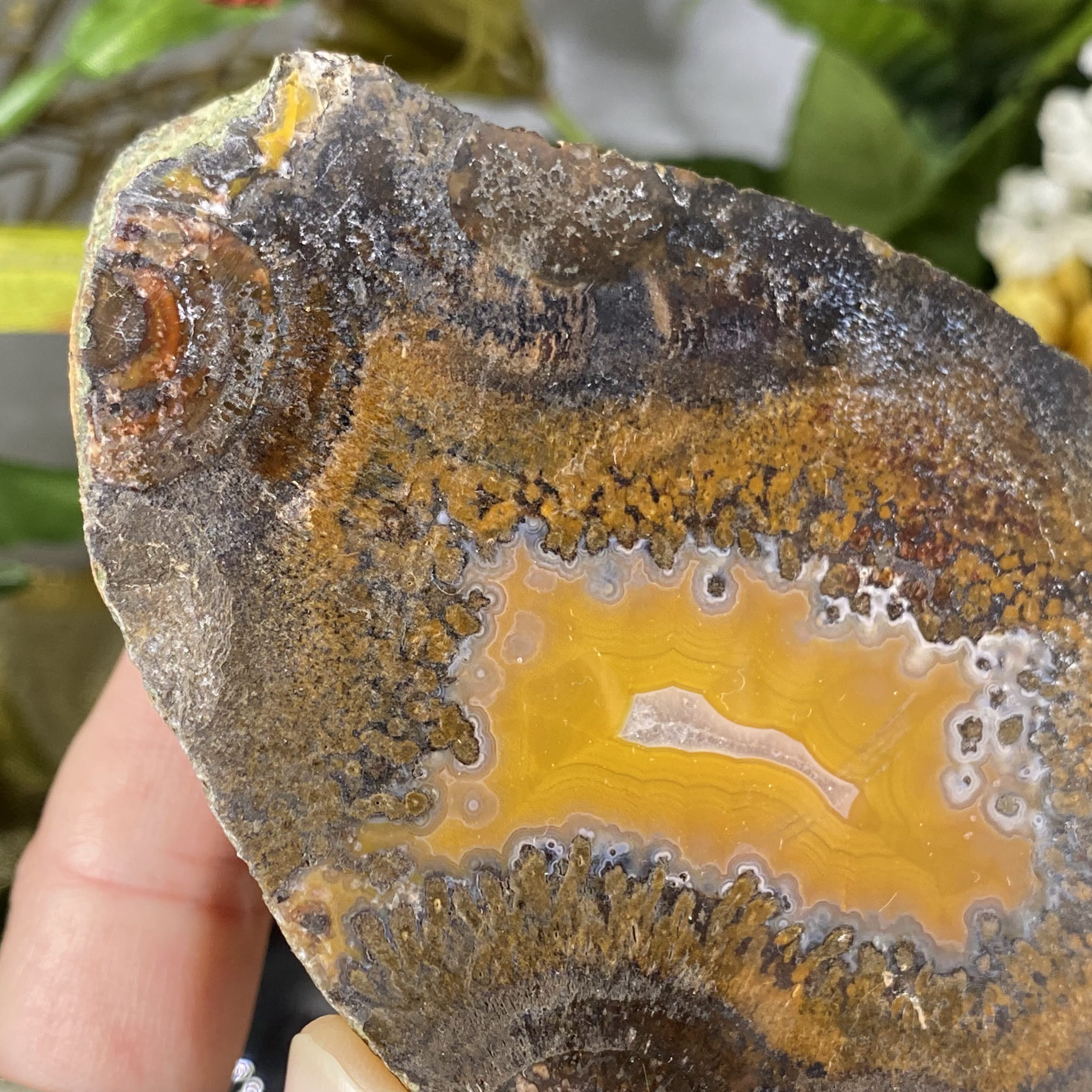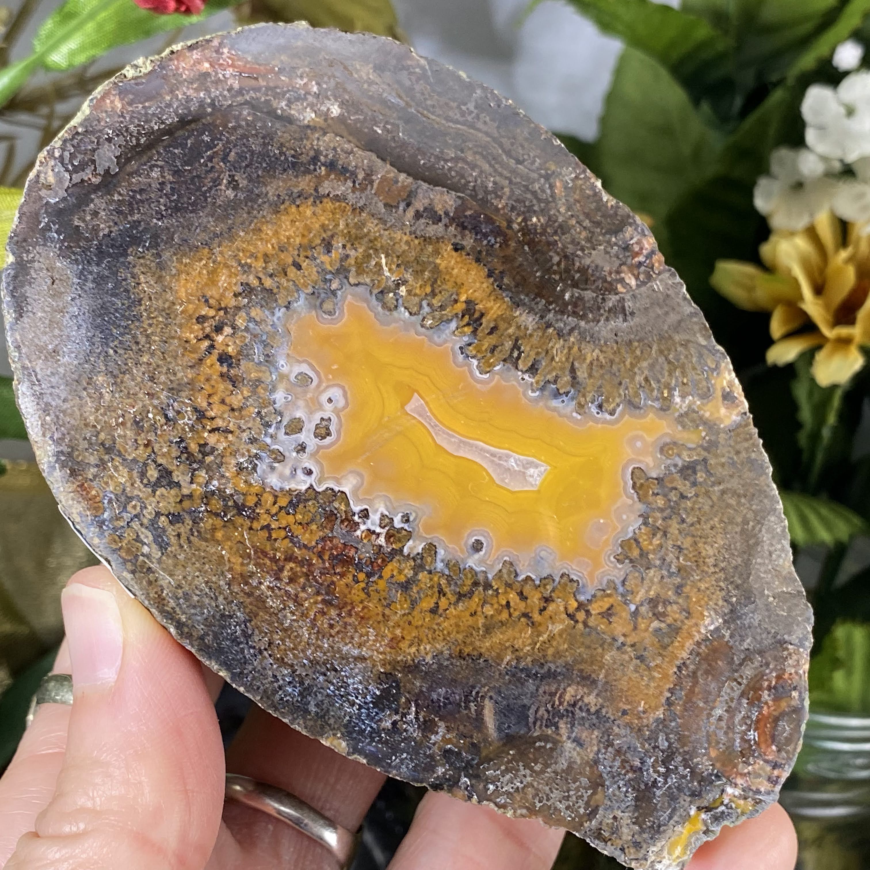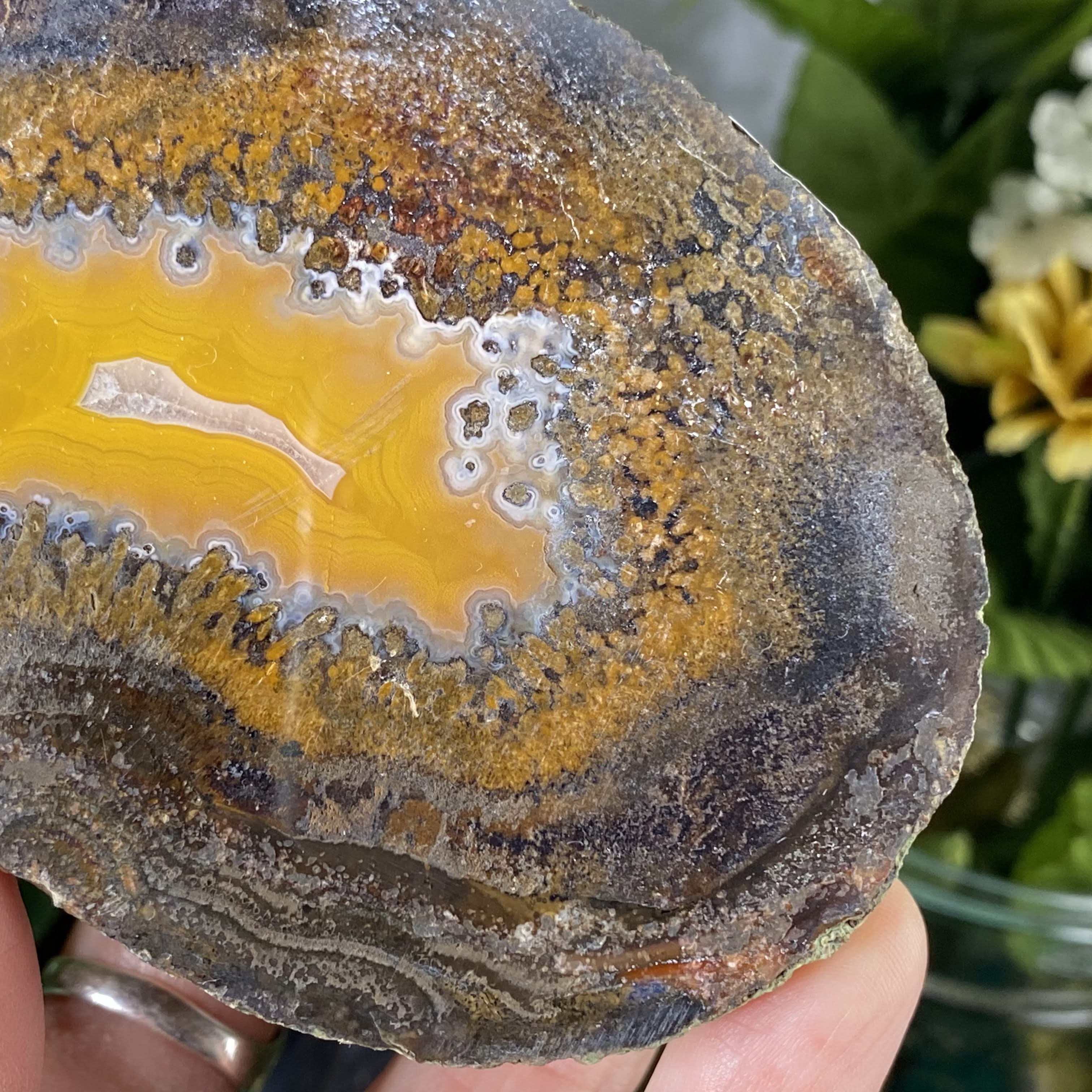 My goodness what a sweet agate nodule half this is! This one is half an agate nodule that has been polished on the sliced side. So many beautiful details and colors to get lost in, very beautiful one here!