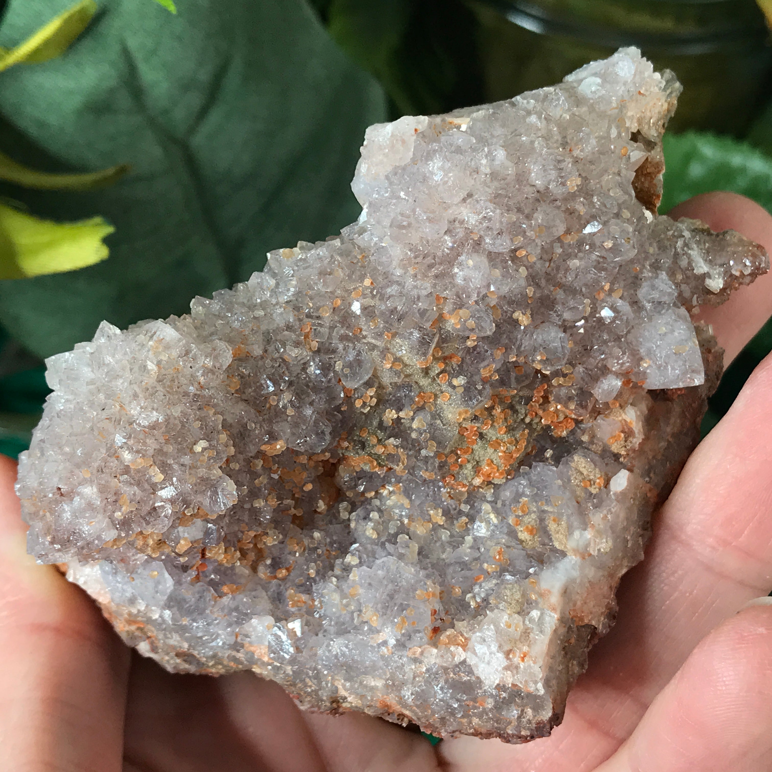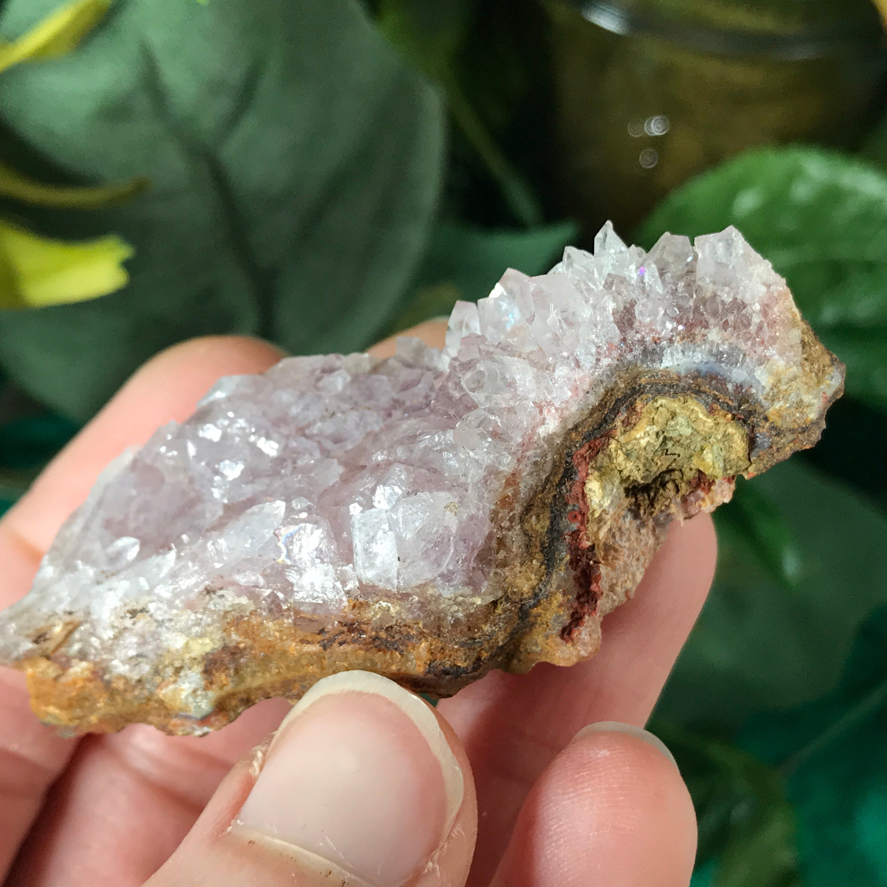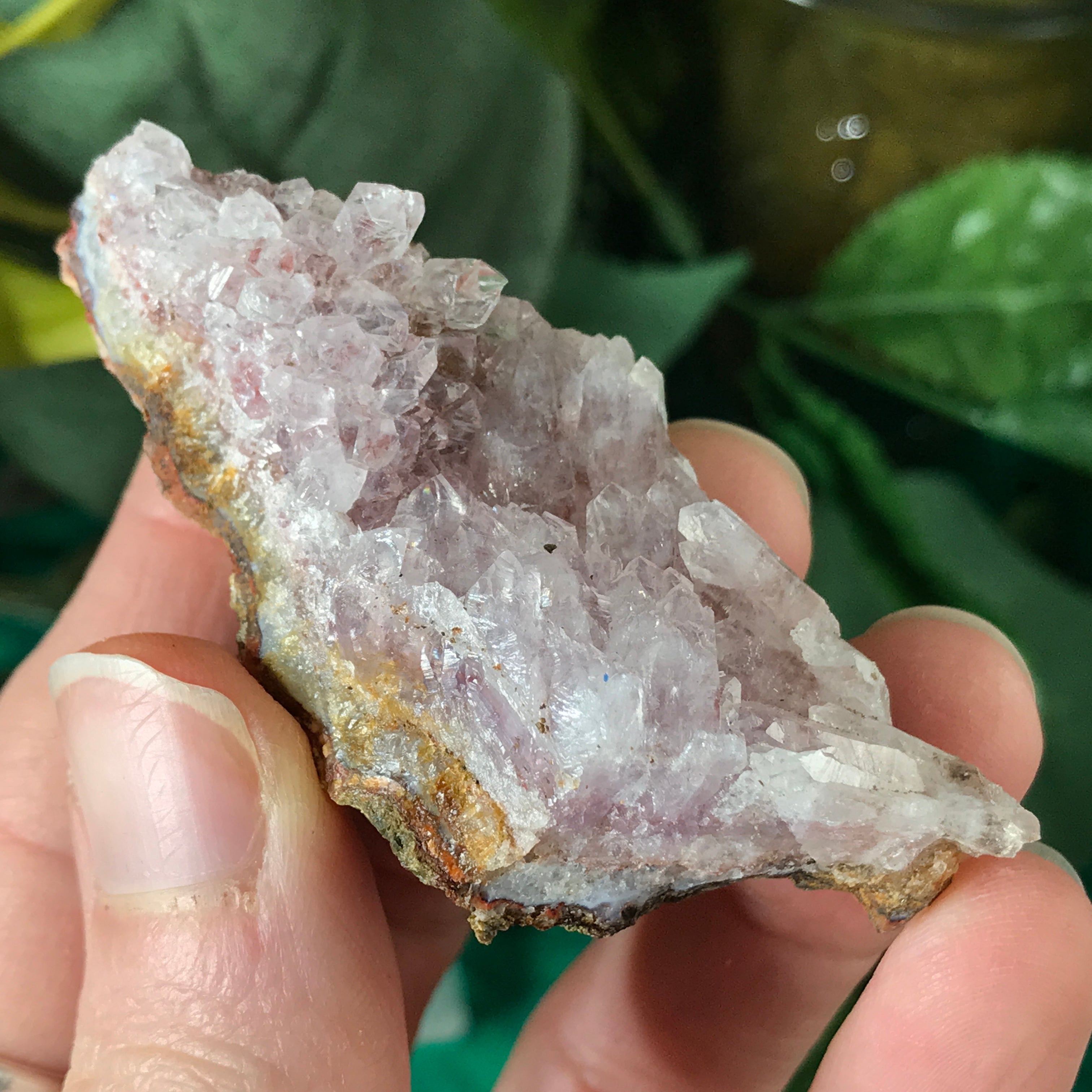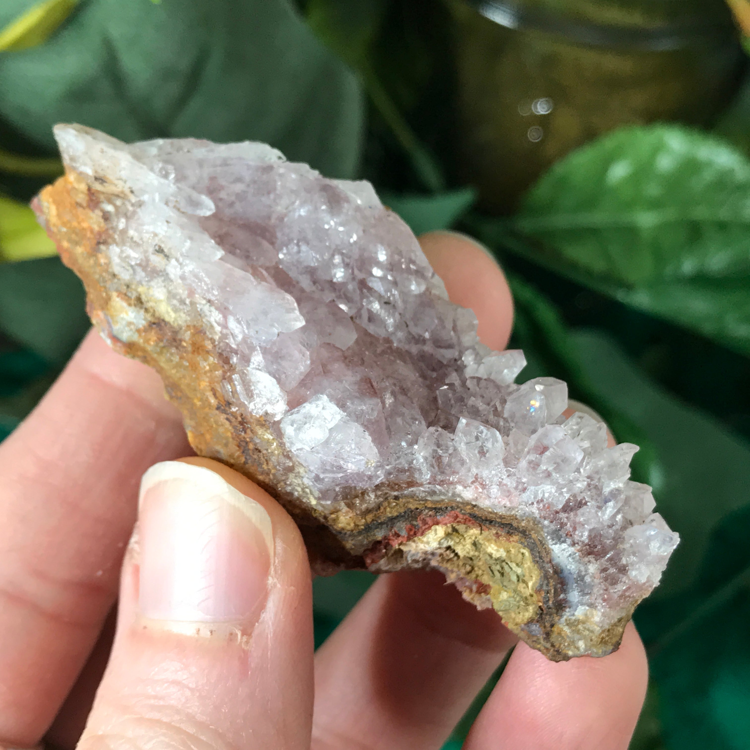 The pink appearance come from hematite in the amethyst, it's so pretty! So many crystal faces that sparkle and shine...I can't get over these colors, they look even better in person. Lovely specimens for the collection or to hold in mediation.
