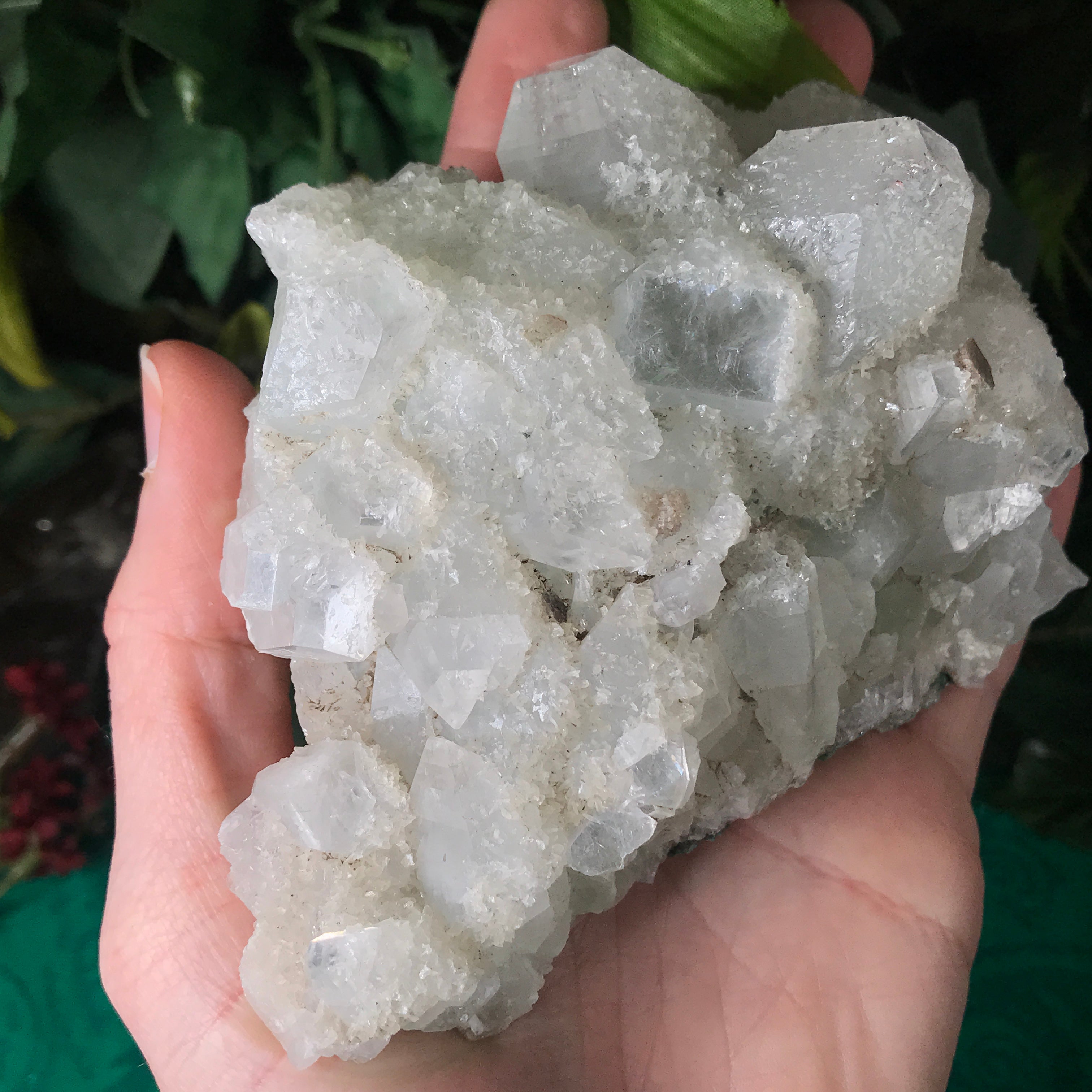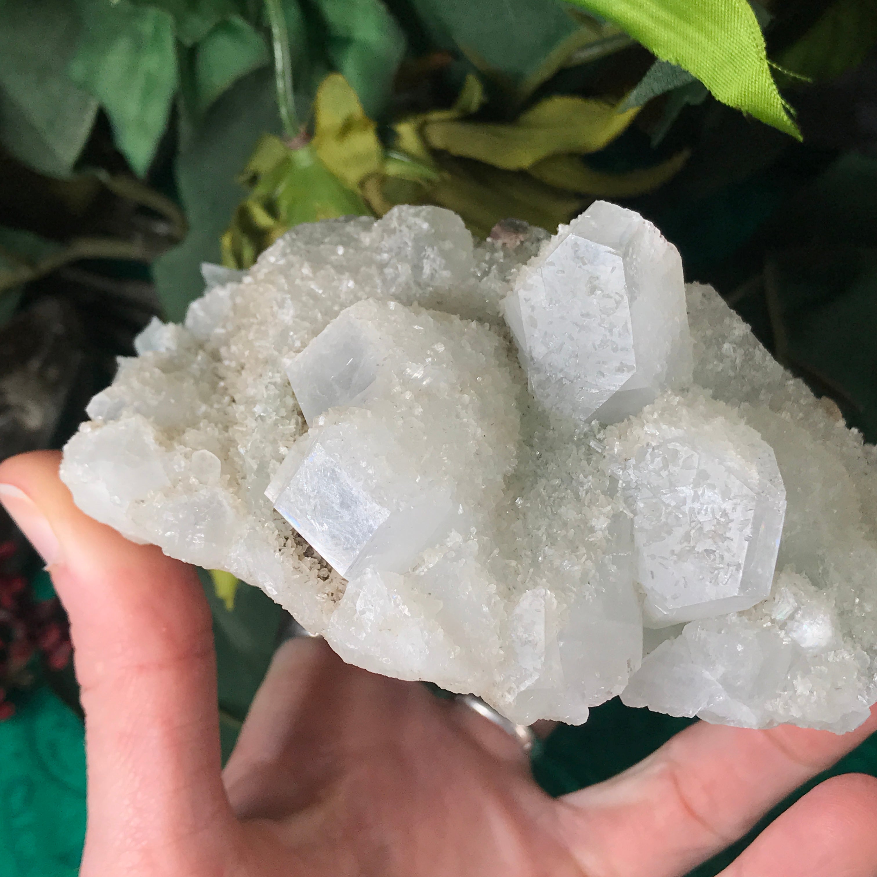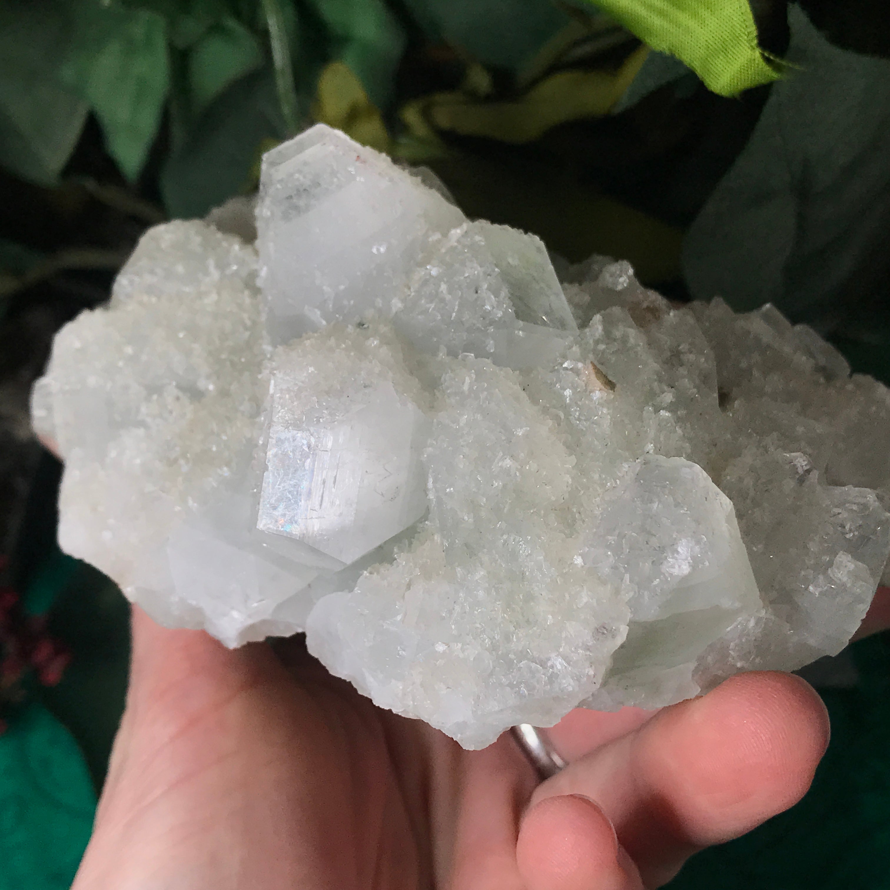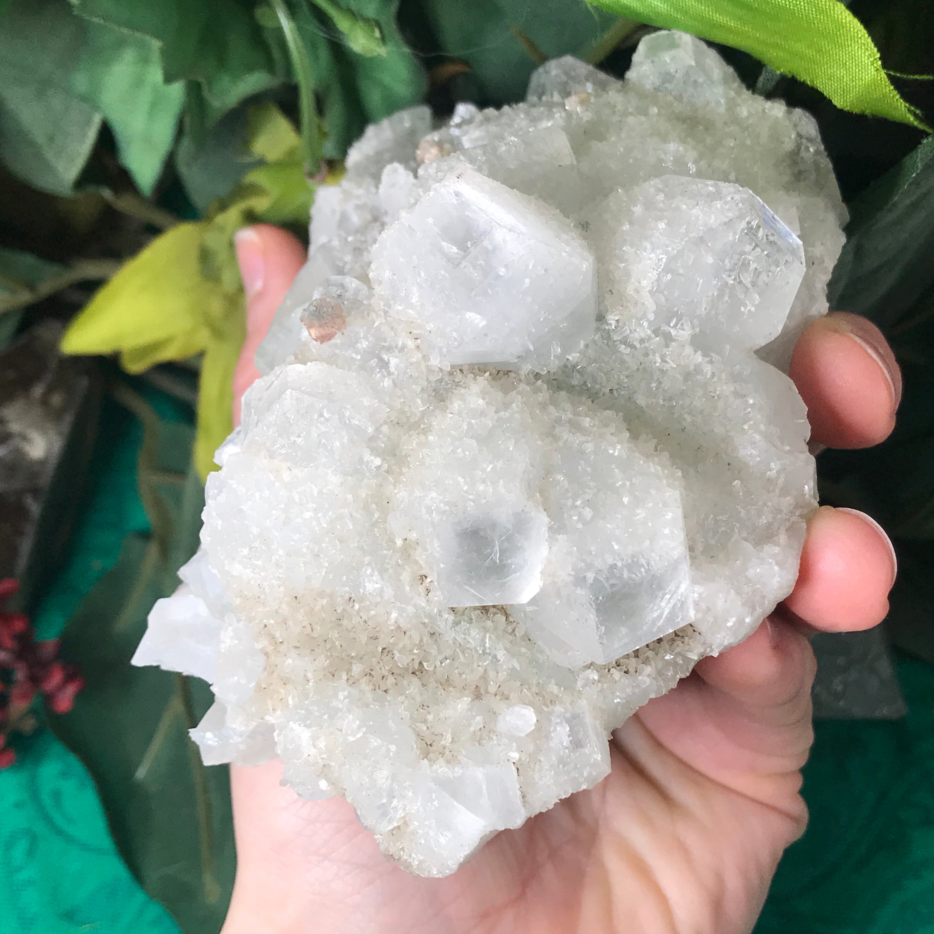 Apophyllite is a lovely high vibrational crystal that works well with clearing and activating the 3rd eye, crown & soul star chakras. This allows an easier flow of light energy/higher vibrational energy into the body & connection to the higher realms. Higher vibrational energy like apophyllite can easier open up the channel for communication with angels, guardians, guides, and spiritual awakening & gifts. It’s a very, light channeling crystal, be open to receive goodness! Strengthening your intuitive/psychic/spiritual gifts and abilities. An excellent crystal to gaze in, which may especially help one to see the future. Also a good friend to help with astral travel, helping one to hold the information they receive in a comprehensible way so that it is still understood when they return to the physical body.