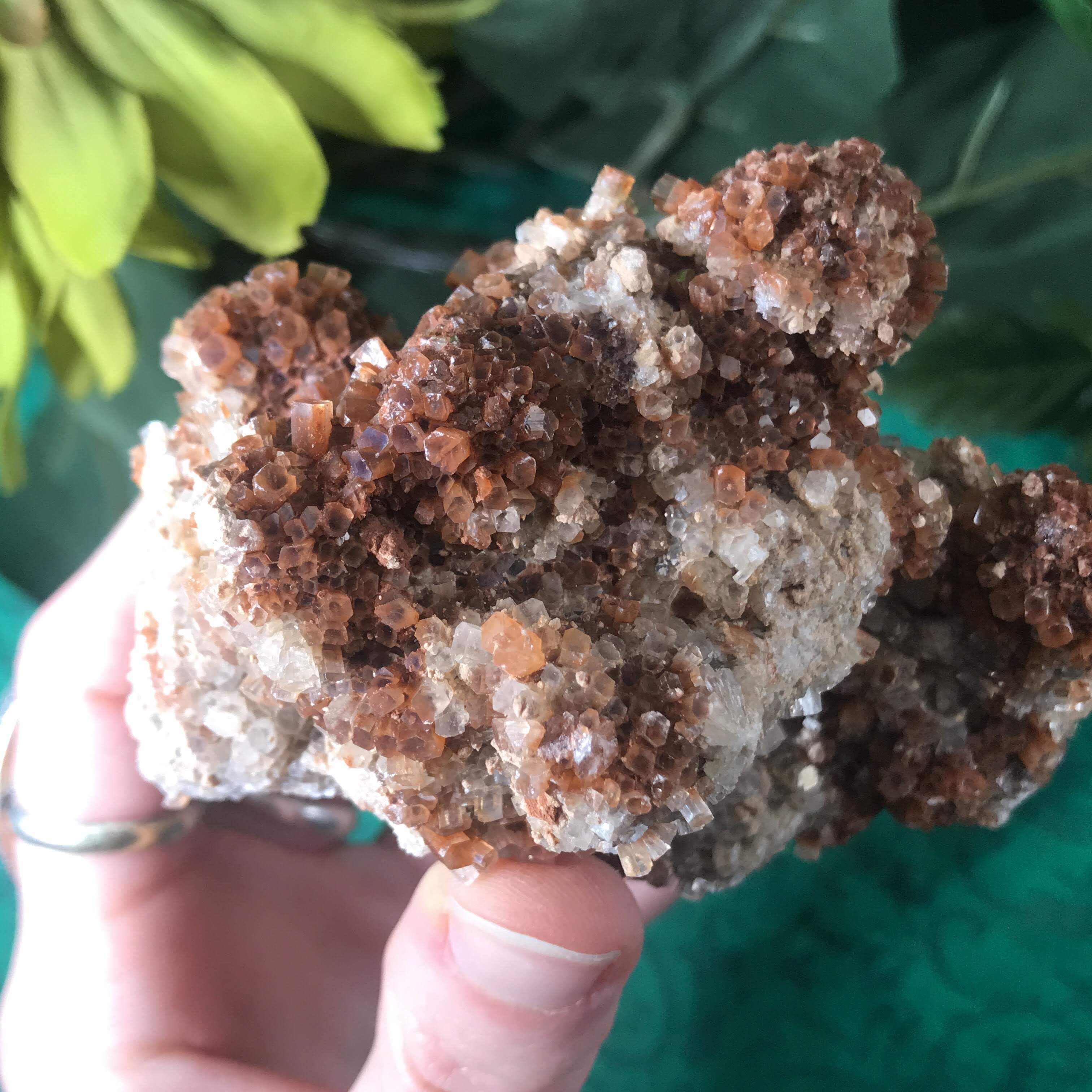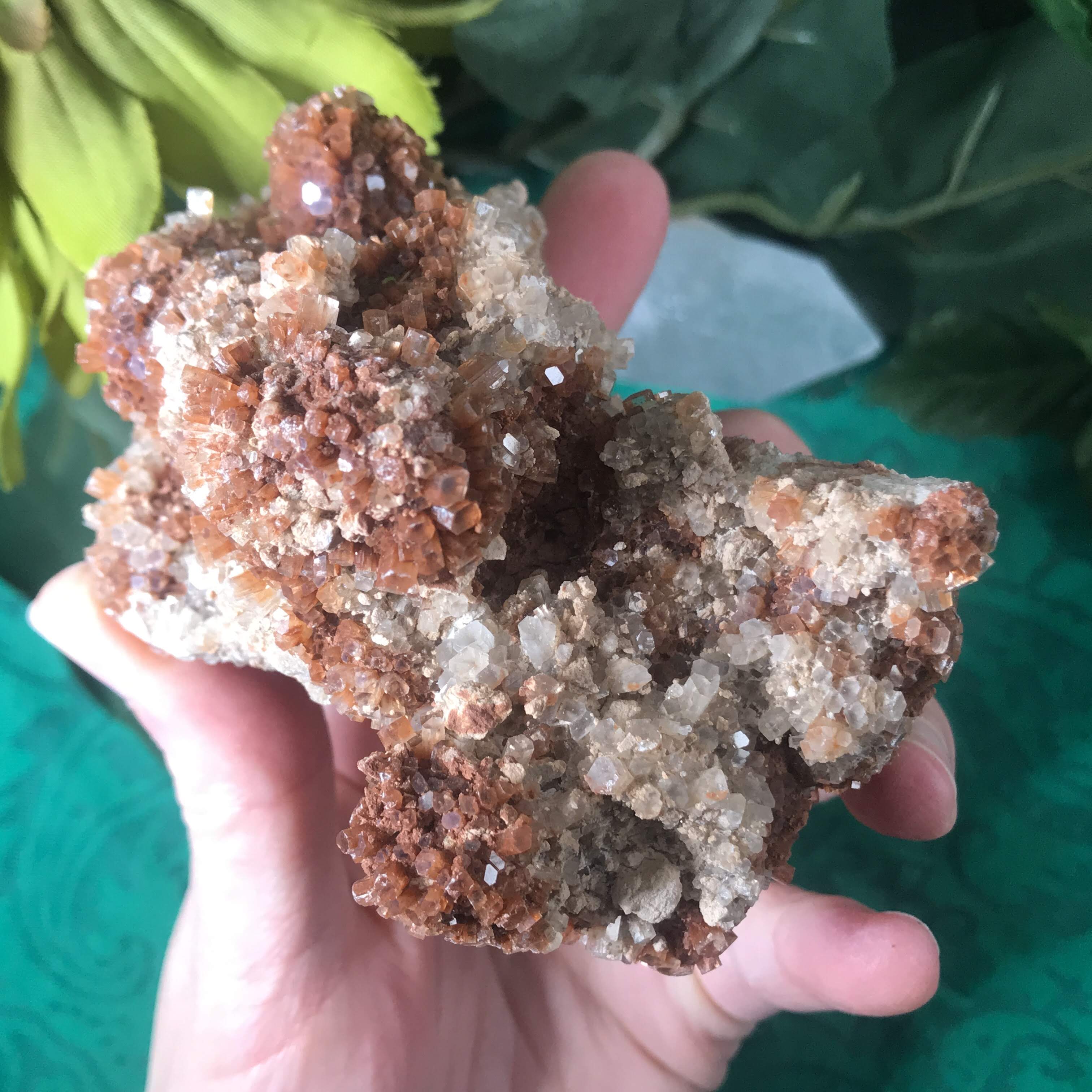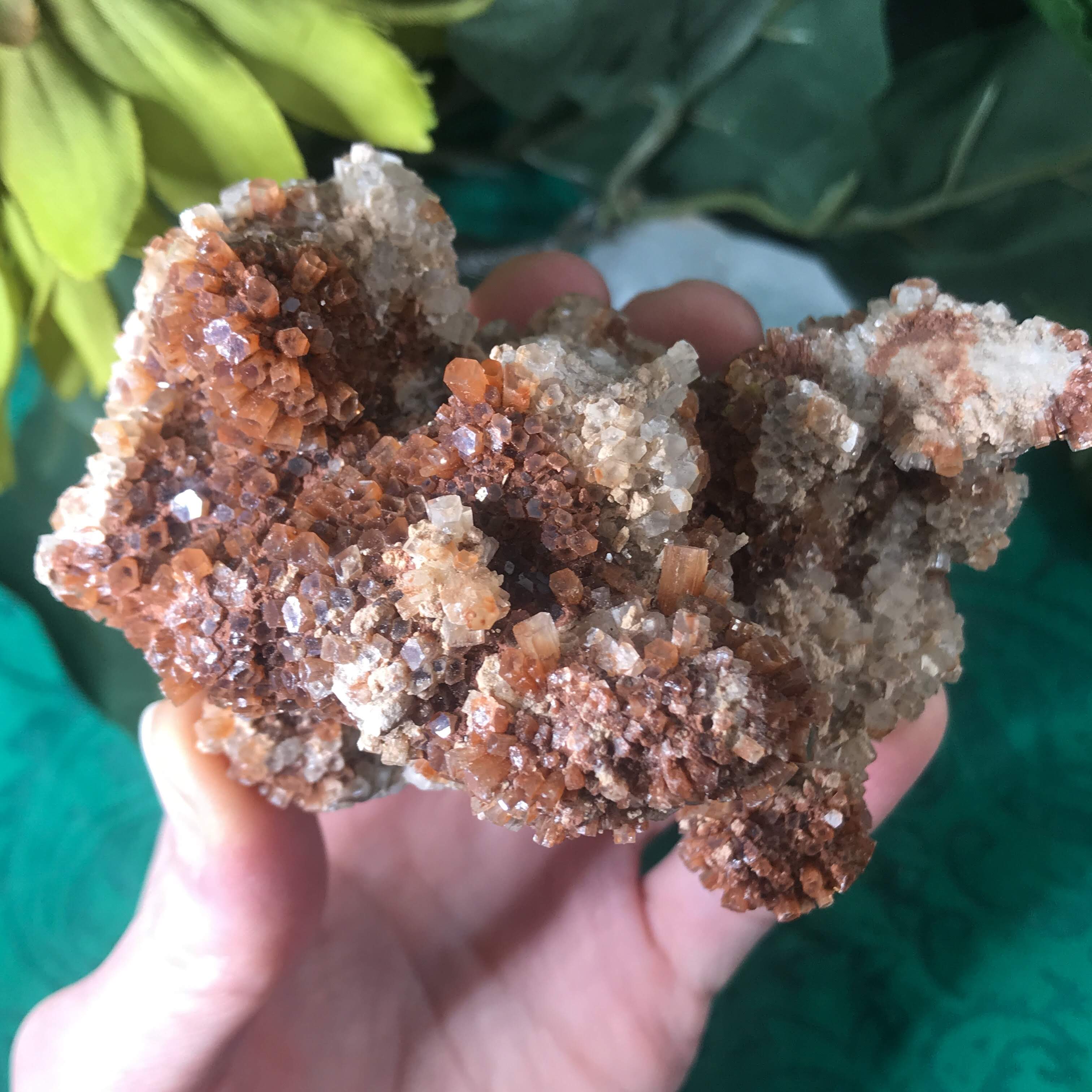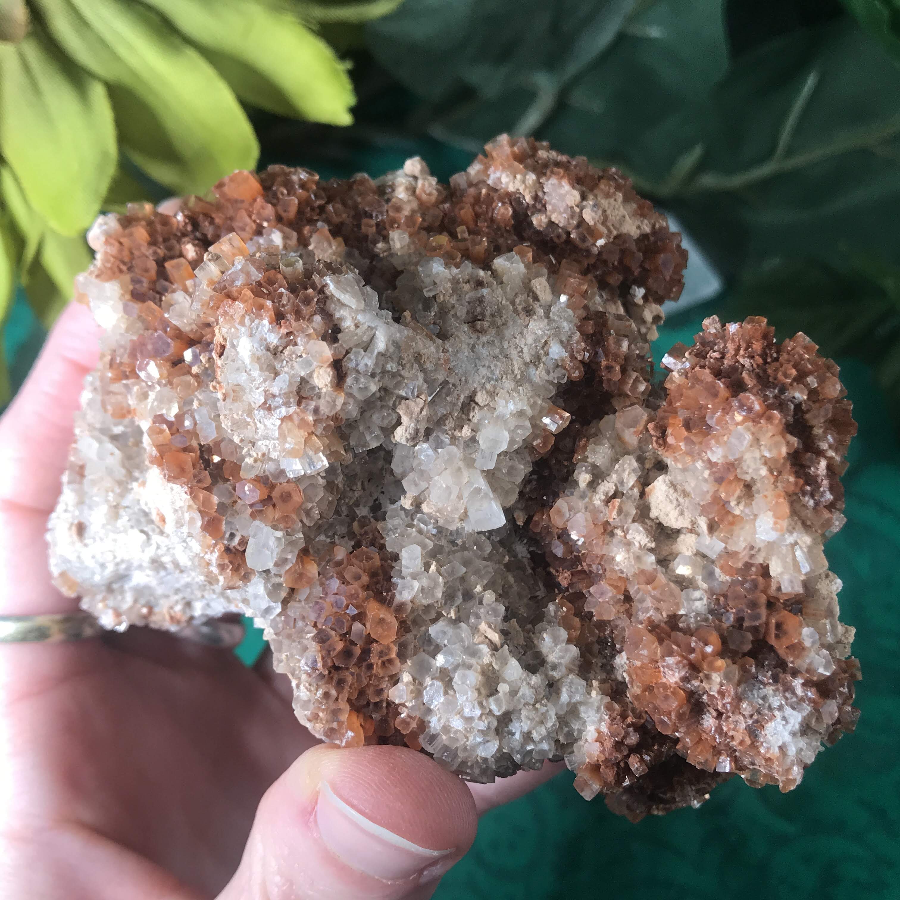 Aragonite! Aragonite is usually found to be white, yellow/gold, green, brown, and blue. When the crystals have the more red-brown color it is from iron or hematite with the crystal. It’s really neat to see these bi-colored crystals in the bunch here! These gorgeous earthy crystals will be a super choice for grounding. They are deeply connected to earth and also an earth healer that may help one be more present with respecting the forces and strong energy of nature. As I’m writing this, and chillin with some aragonite, I keep being brought back to seeing and feeling strong thick white roots growing and spreading down, connecting with and flowing through & caressing fresh healthy soil many layers below the surface. Excellent for root and earth star chakra work. As this crystal can help ground your energy & what you need to release (whether surface or deep rooted energies) into the depths of earth for her to transmute and stabilize. Although very grounding it also does aid a nice uplift and a lil refresh to your energy as well. Allow all those attachments & energies that are no longer serving your greater good flow into the beautiful arms of Gaia, and feel lifted. Let that stress go, breathe, let your nerves settle and release that static, and allow your vibration to rise.