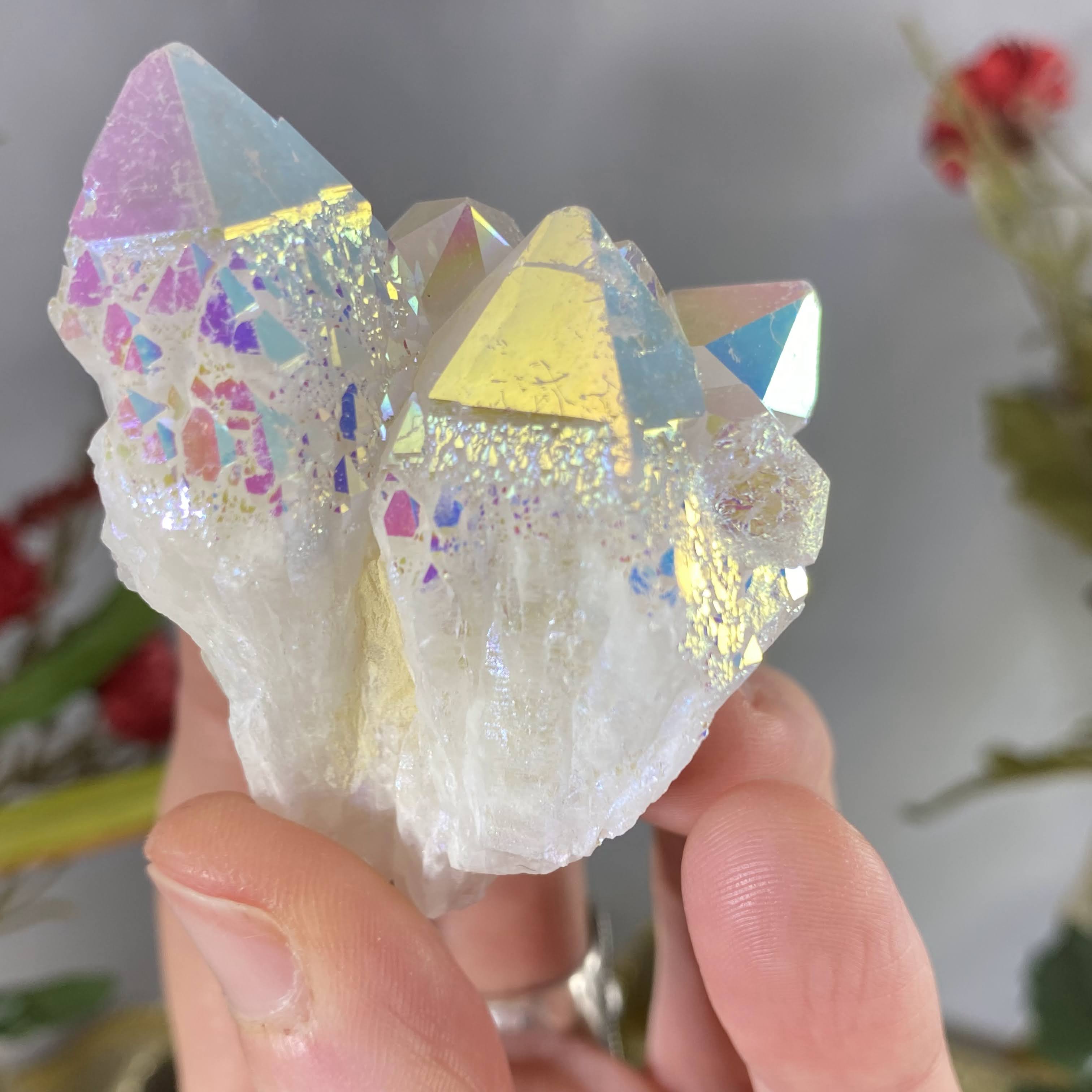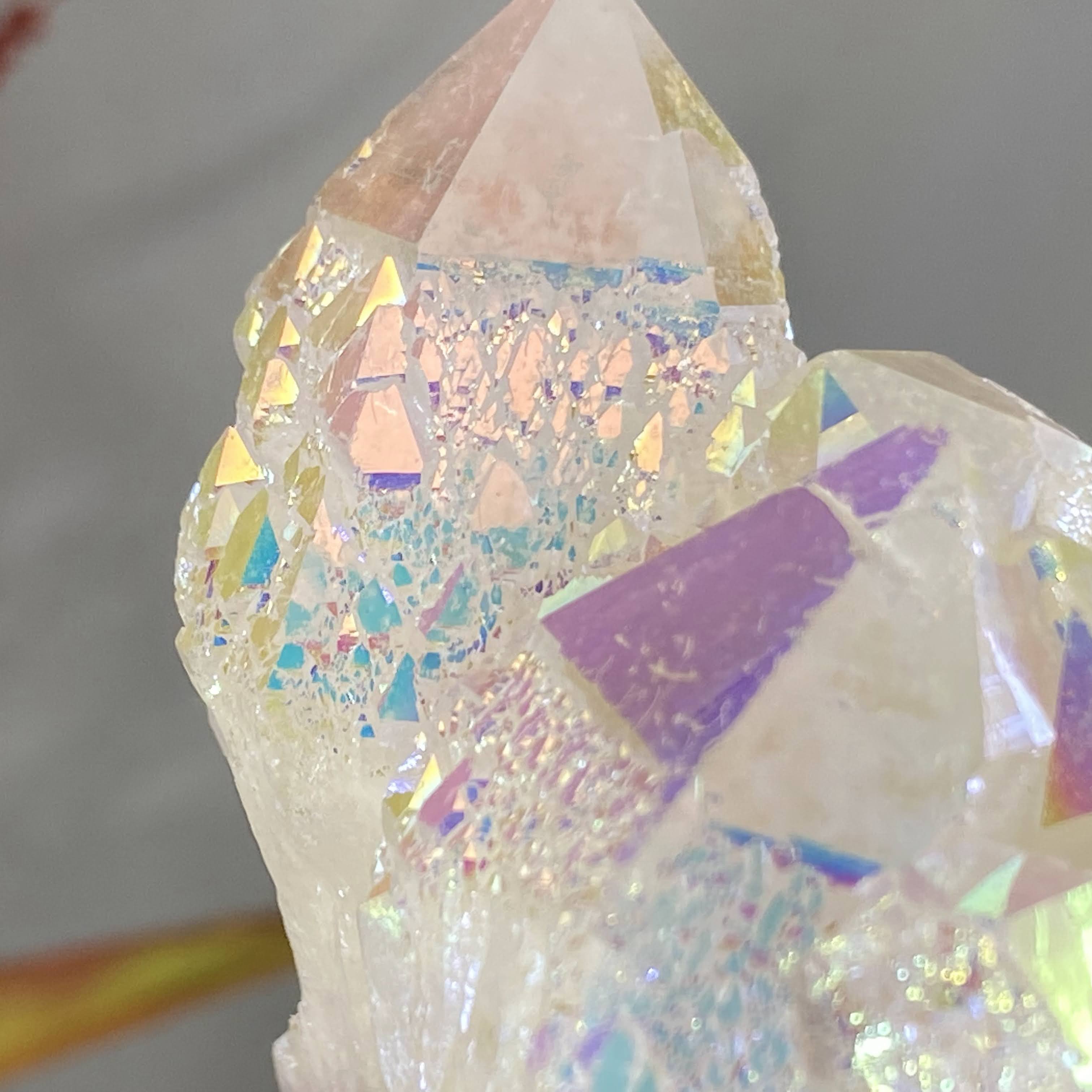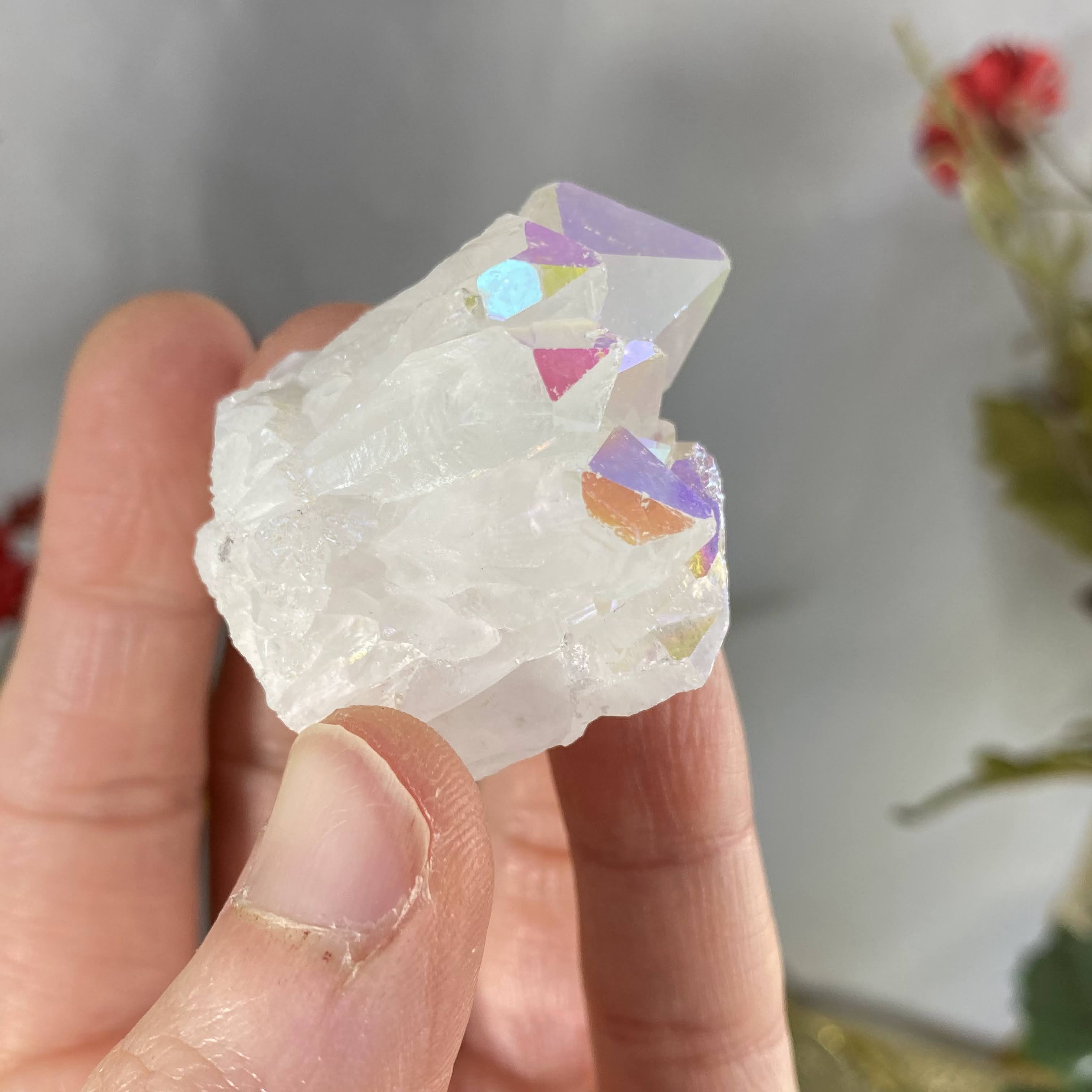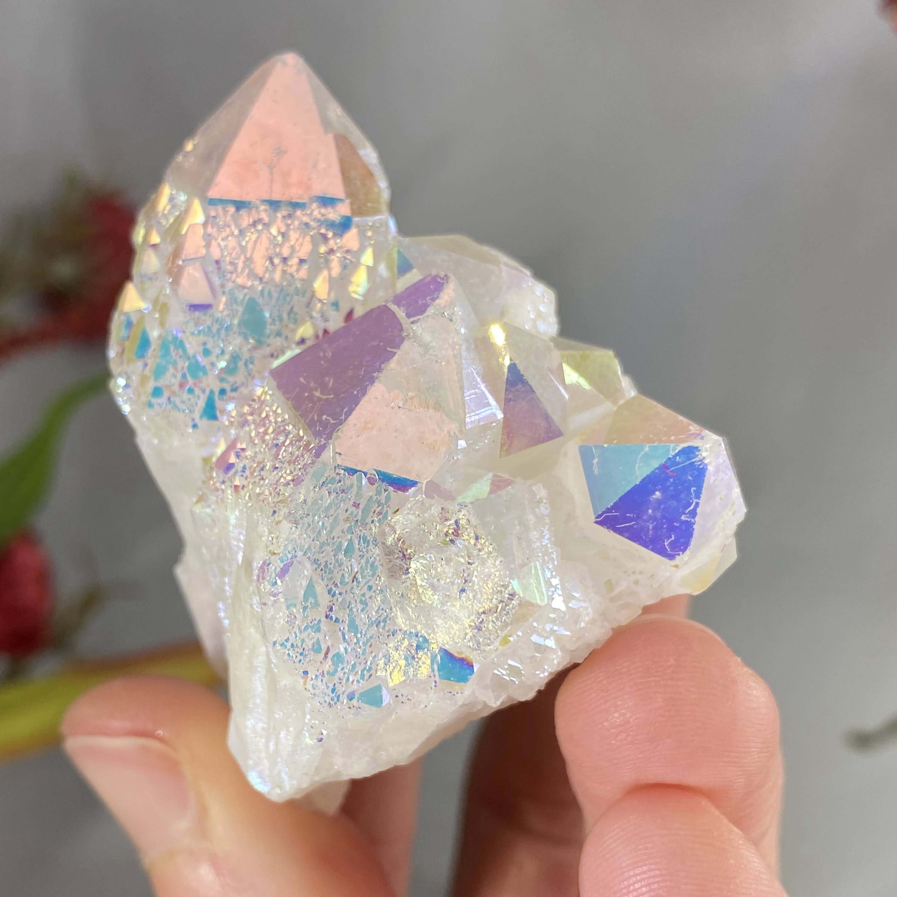 Angel aura feels connected to the heavens and other spiritual dimensions. It’s a very high vibrational crystal, which is excellent for meditation and energy/spiritual work within higher dimensions and with higher dimensional beings, such as the angelic realm and guides. A great aid to connecting to the frequencies of the divine, and communicating with your higher self as well.