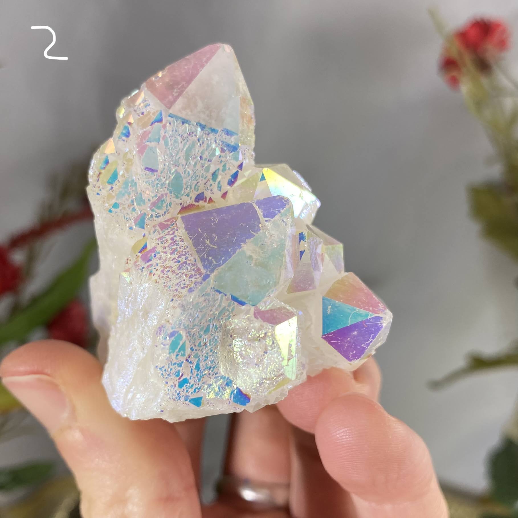 This listing is for ONE sweet aura coated quartz cluster, choose the one that calls to YOU! My goodness all those crystal faces on #2!!!!!