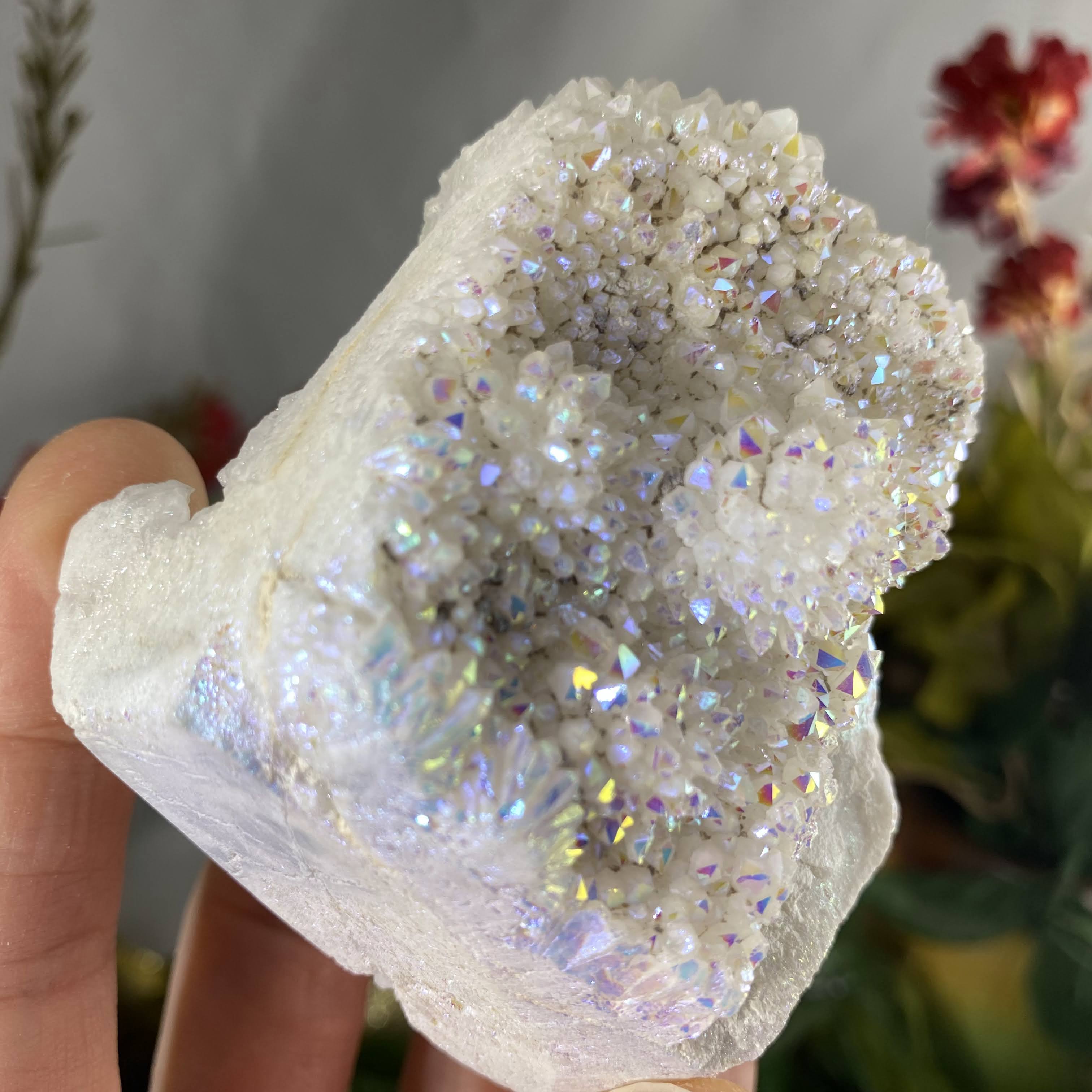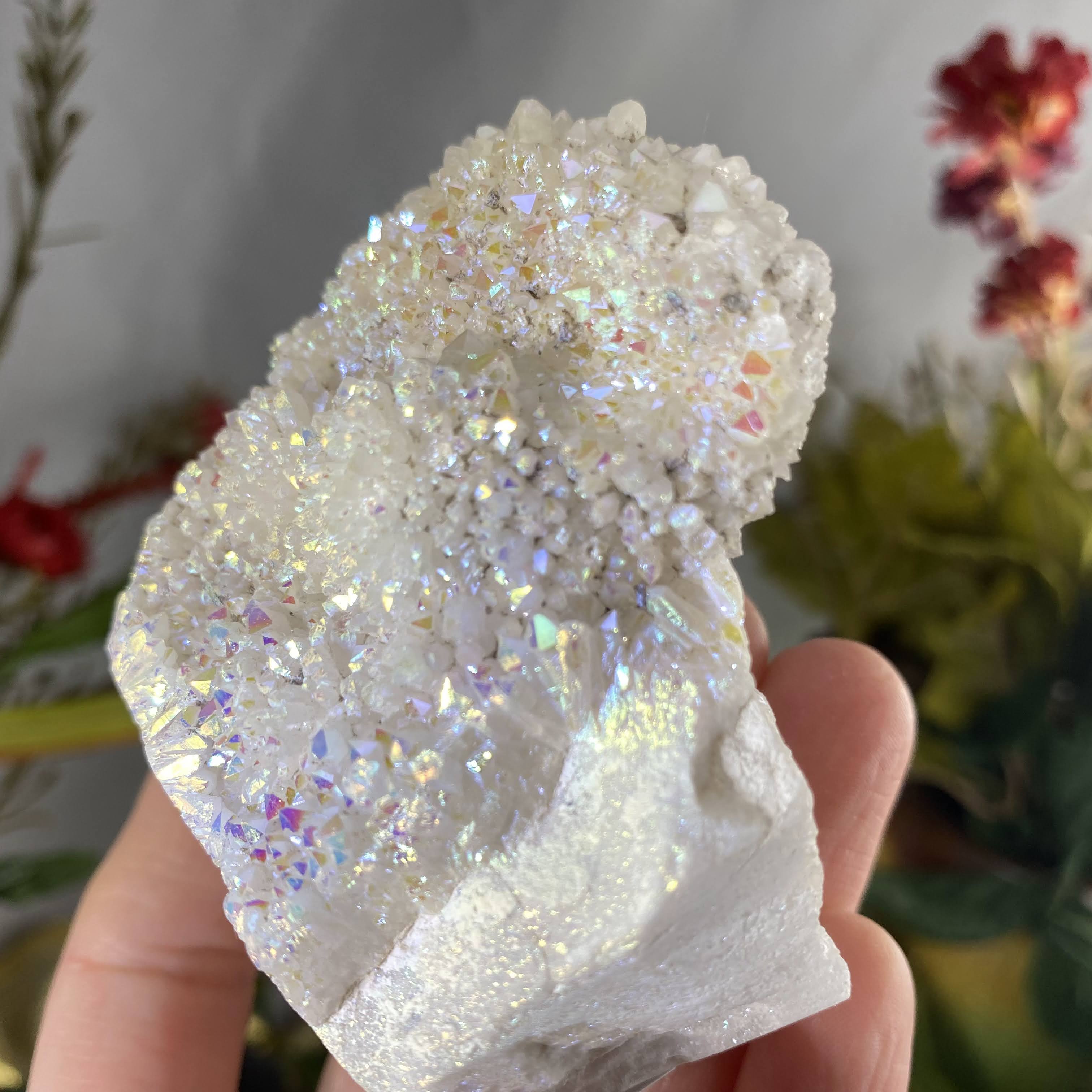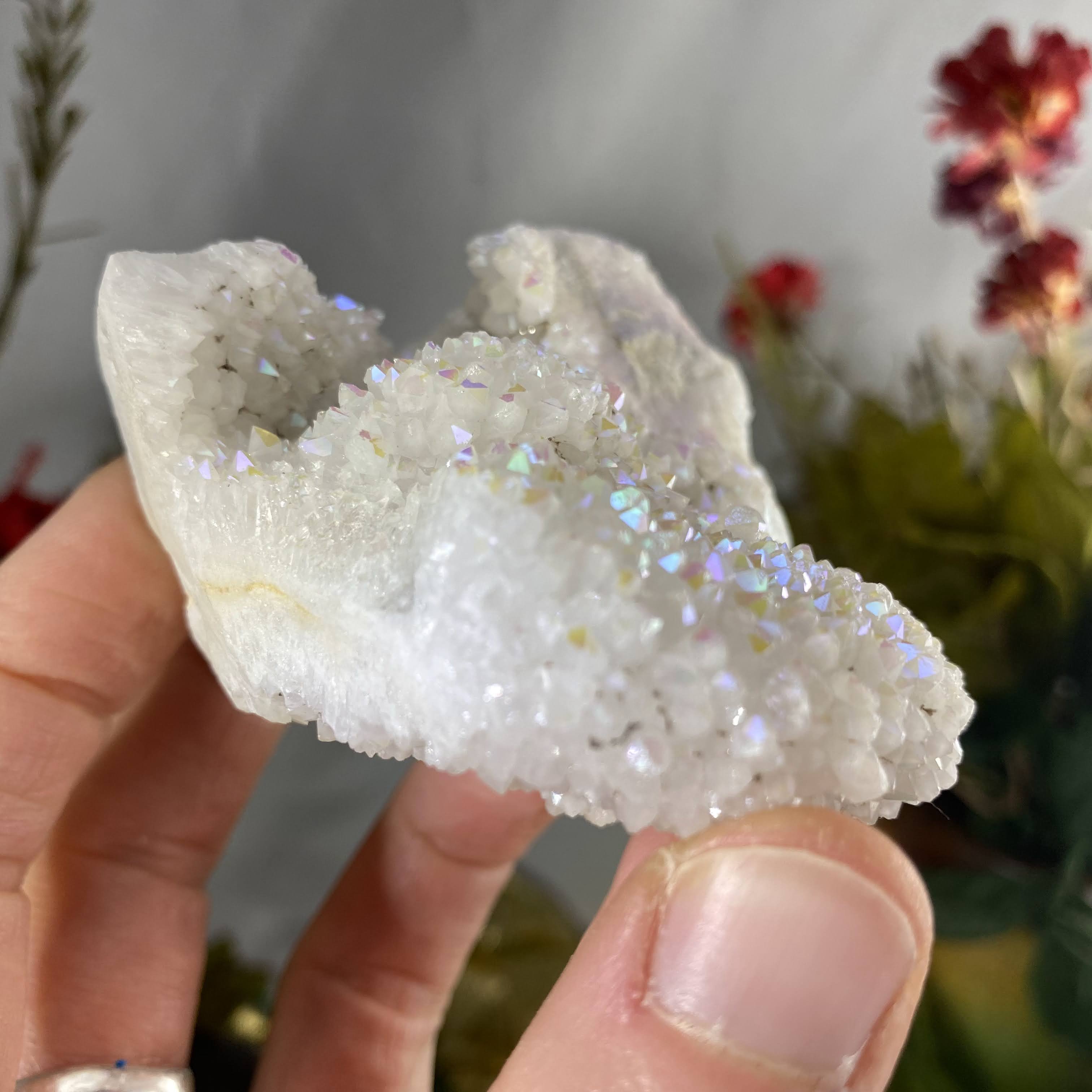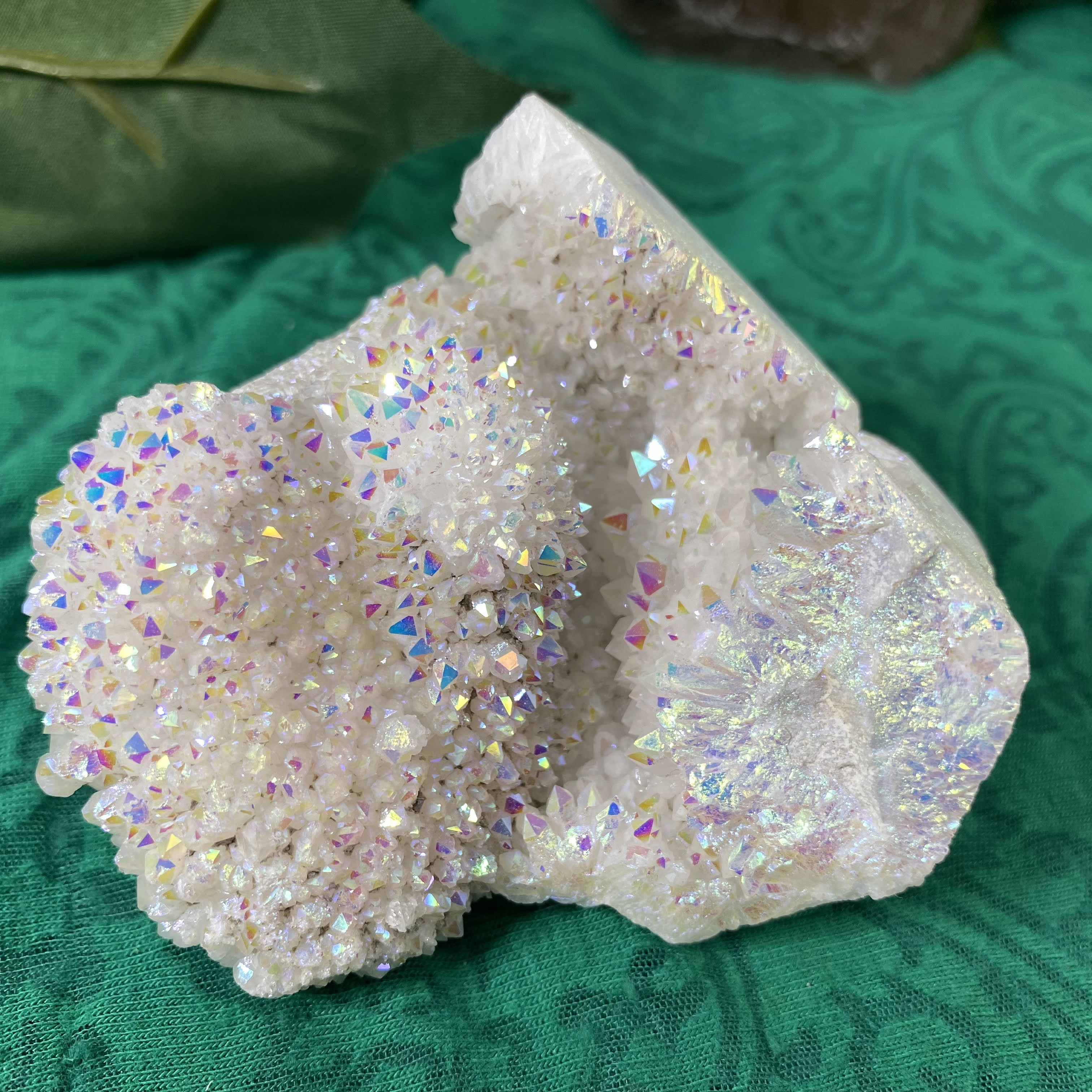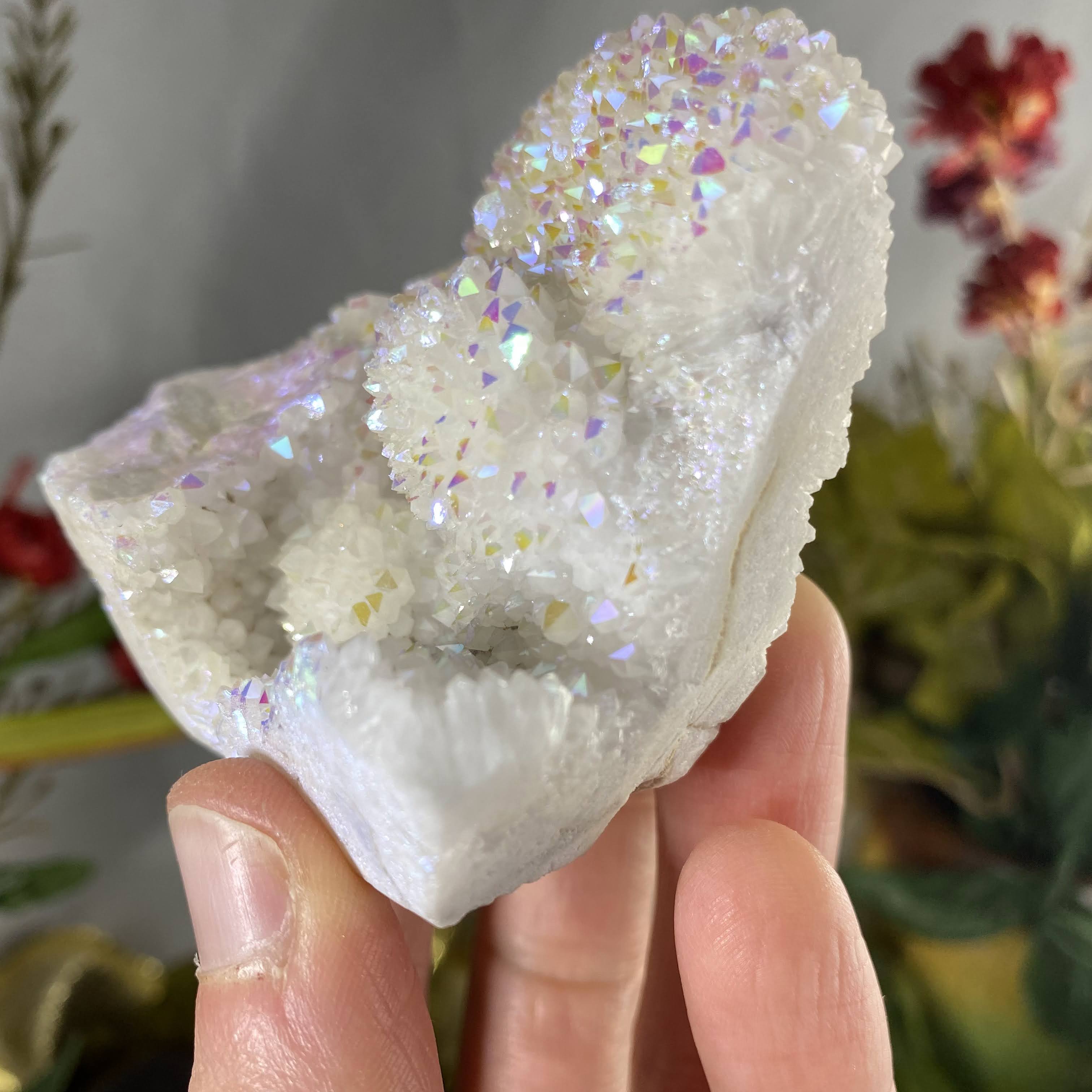 Angel aura feels connected to the heavens and other spiritual dimensions. It’s a very high vibrational crystal, which is excellent for meditation and energy/spiritual work within higher dimensions and with higher dimensional beings, such as the angelic realm and guides. A great aid to connecting to the frequencies of the divine, and communicating with your higher self as well.