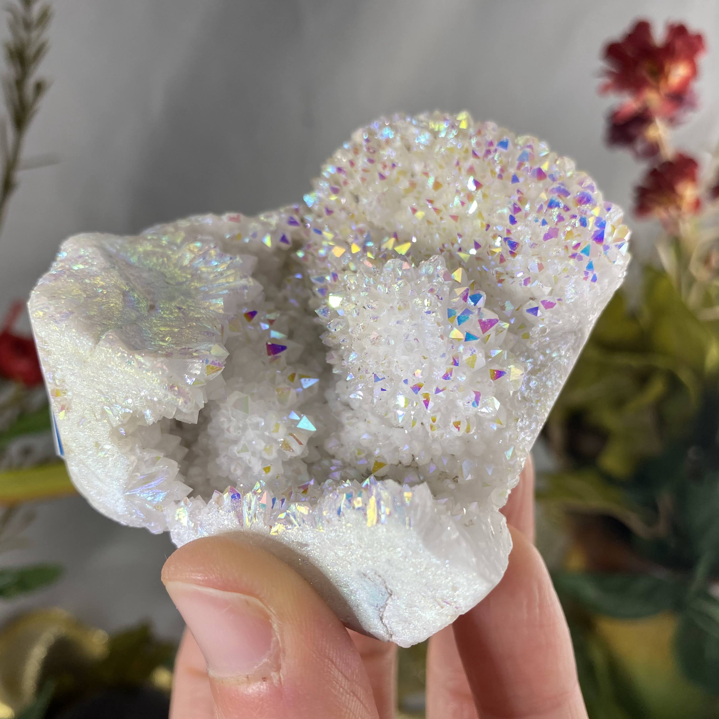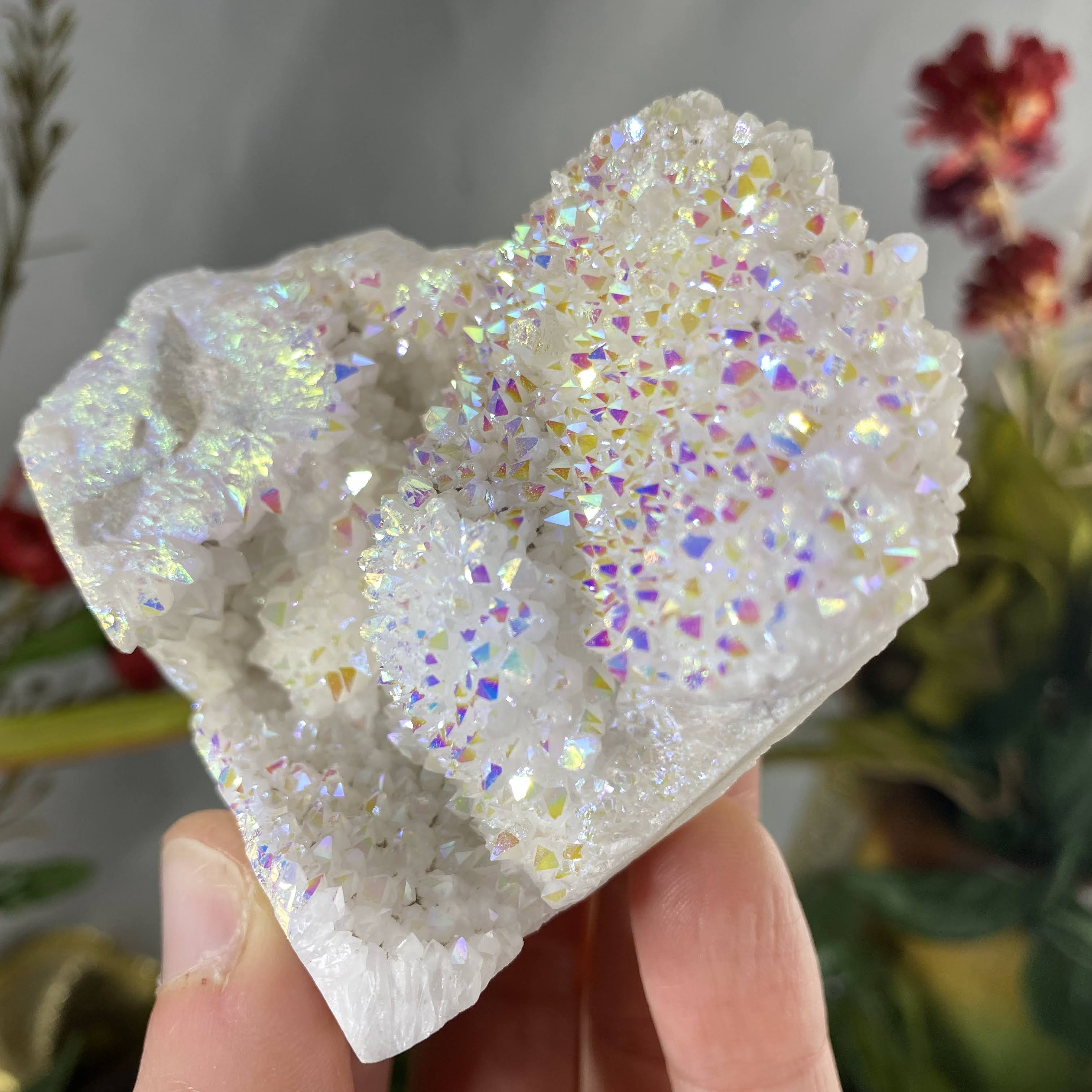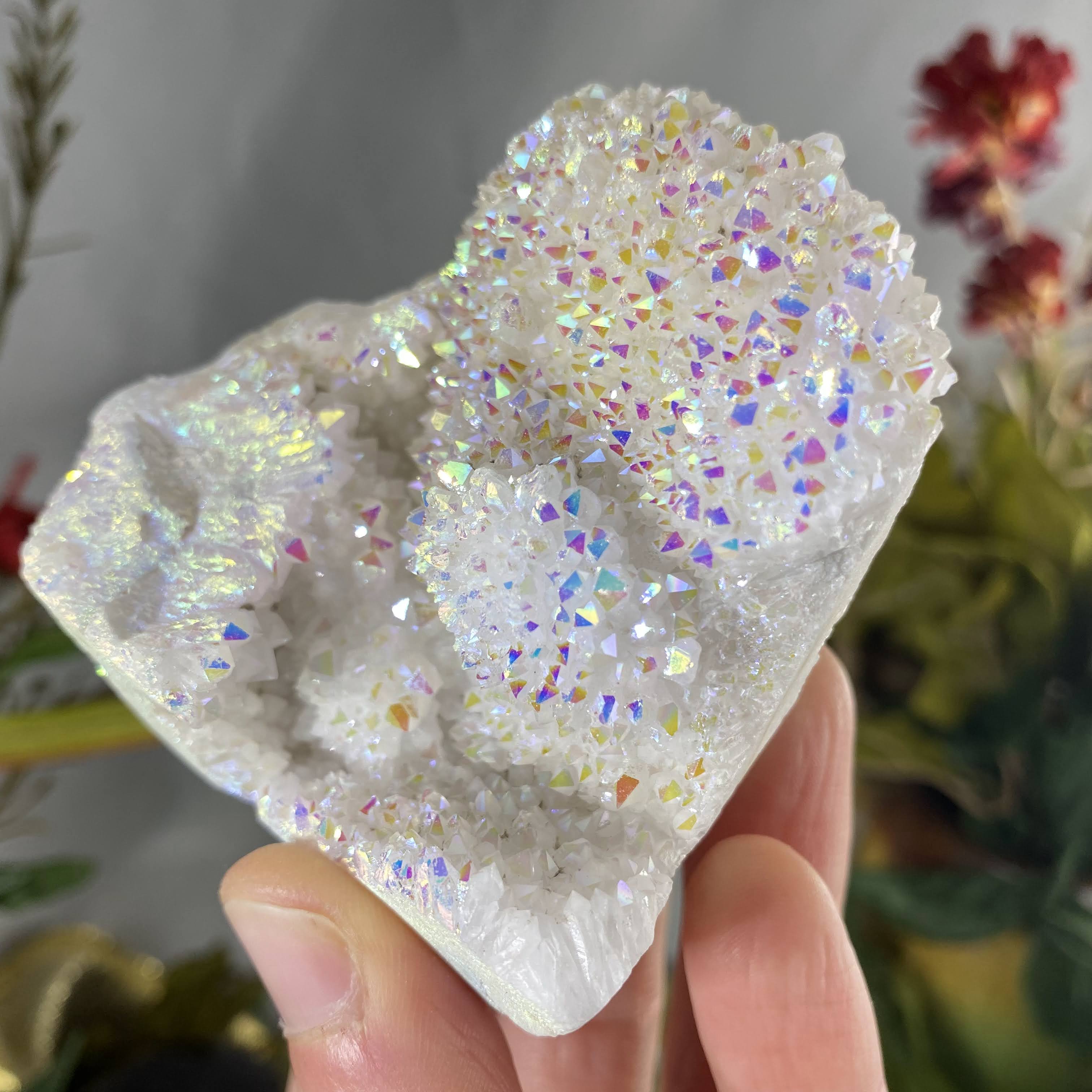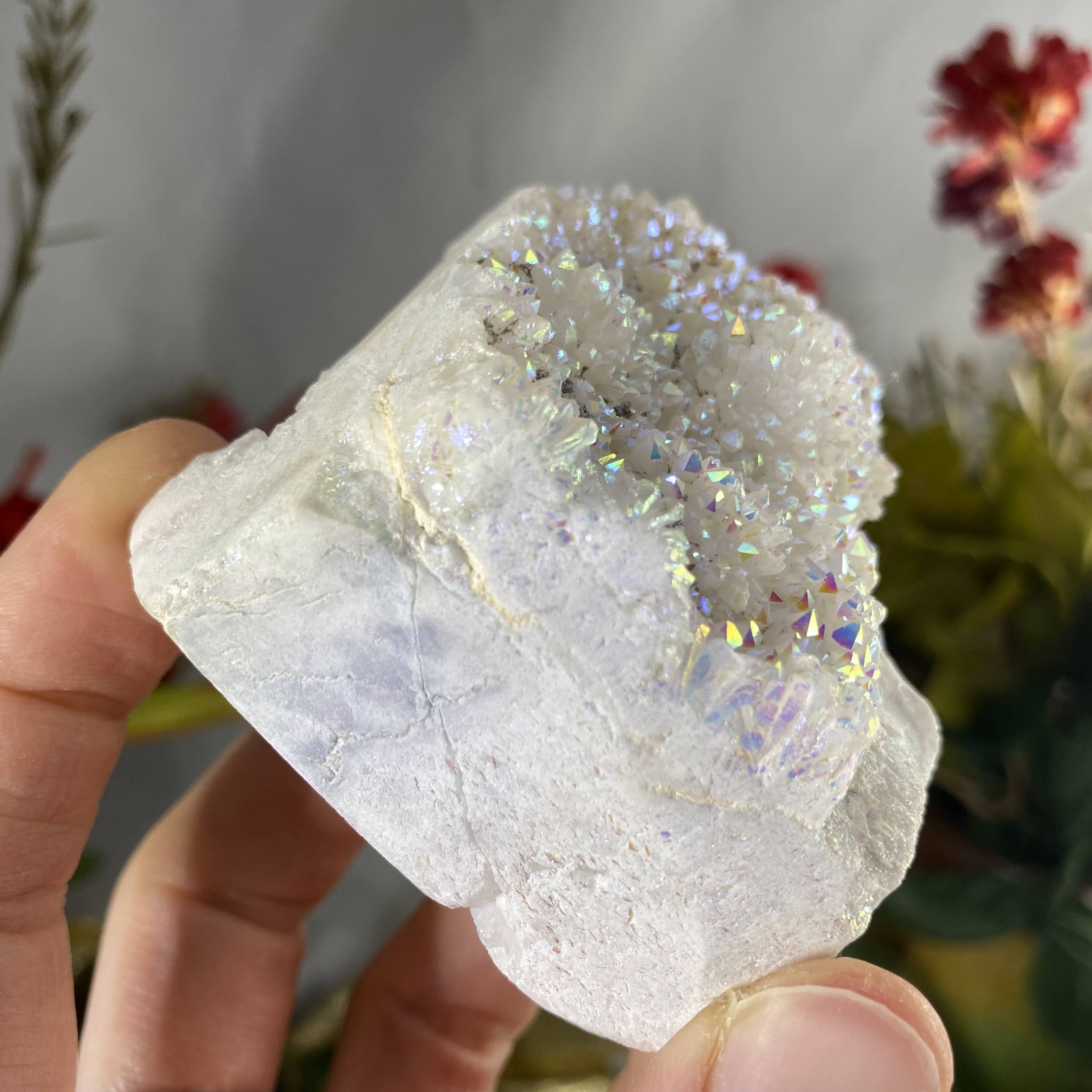 Angel aura feels connected to the heavens and other spiritual dimensions. It’s a very high vibrational crystal, which is excellent for meditation and energy/spiritual work within higher dimensions and with higher dimensional beings, such as the angelic realm and guides. A great aid to connecting to the frequencies of the divine, and communicating with your higher self as well.