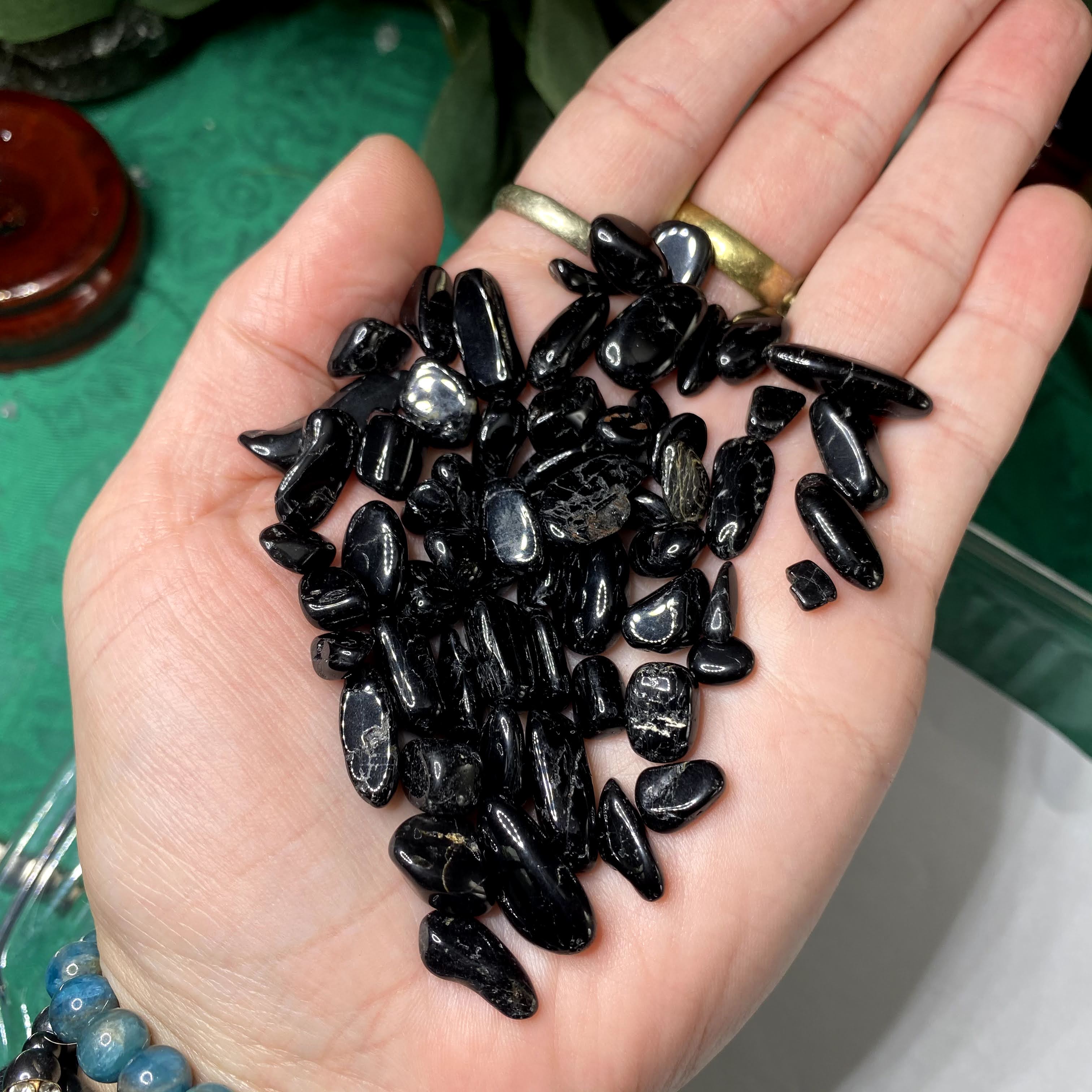 Bulk deal on black tourmaline chips! Select what calls to you! The amount shown in my hand is for the 1.5 oz option (2-B47).