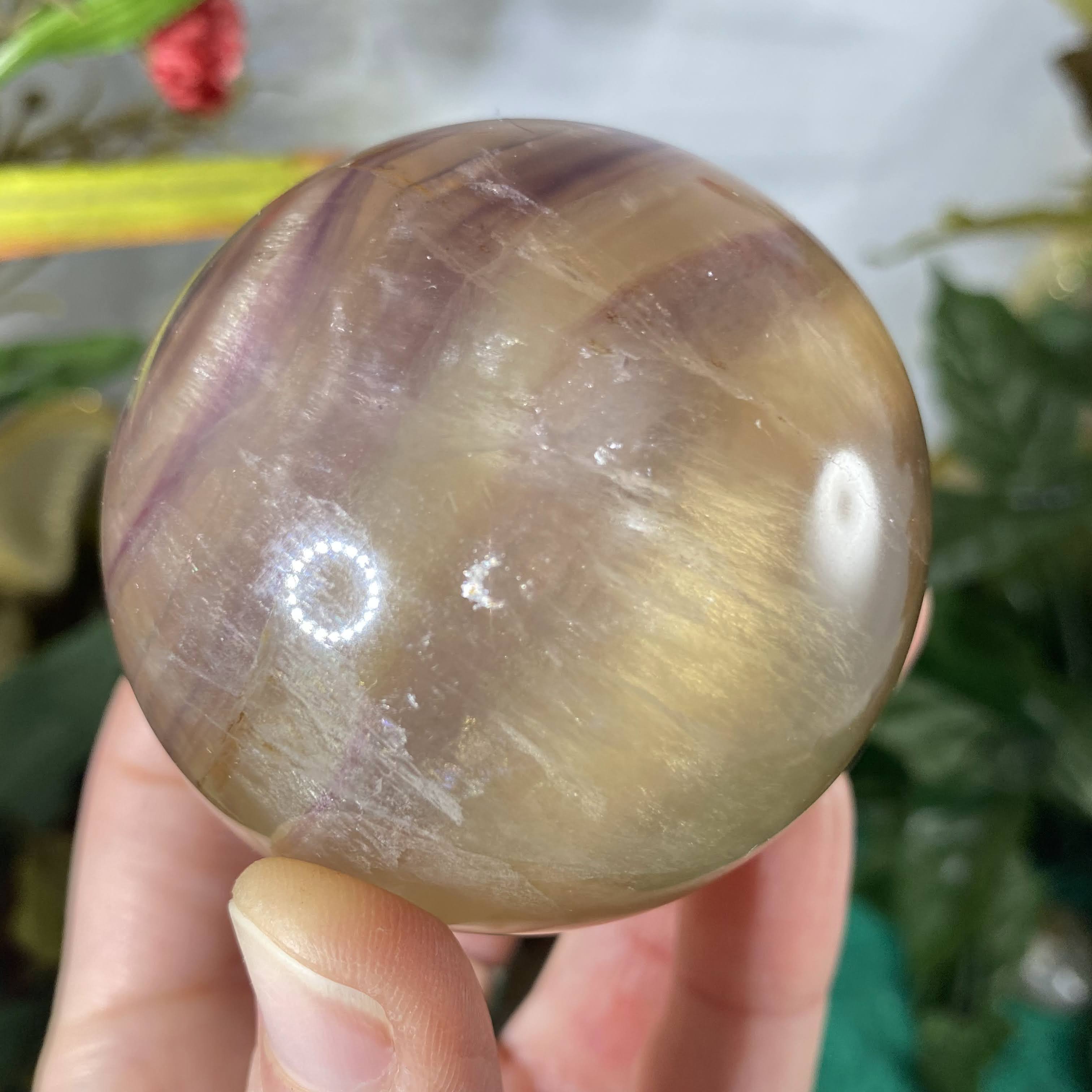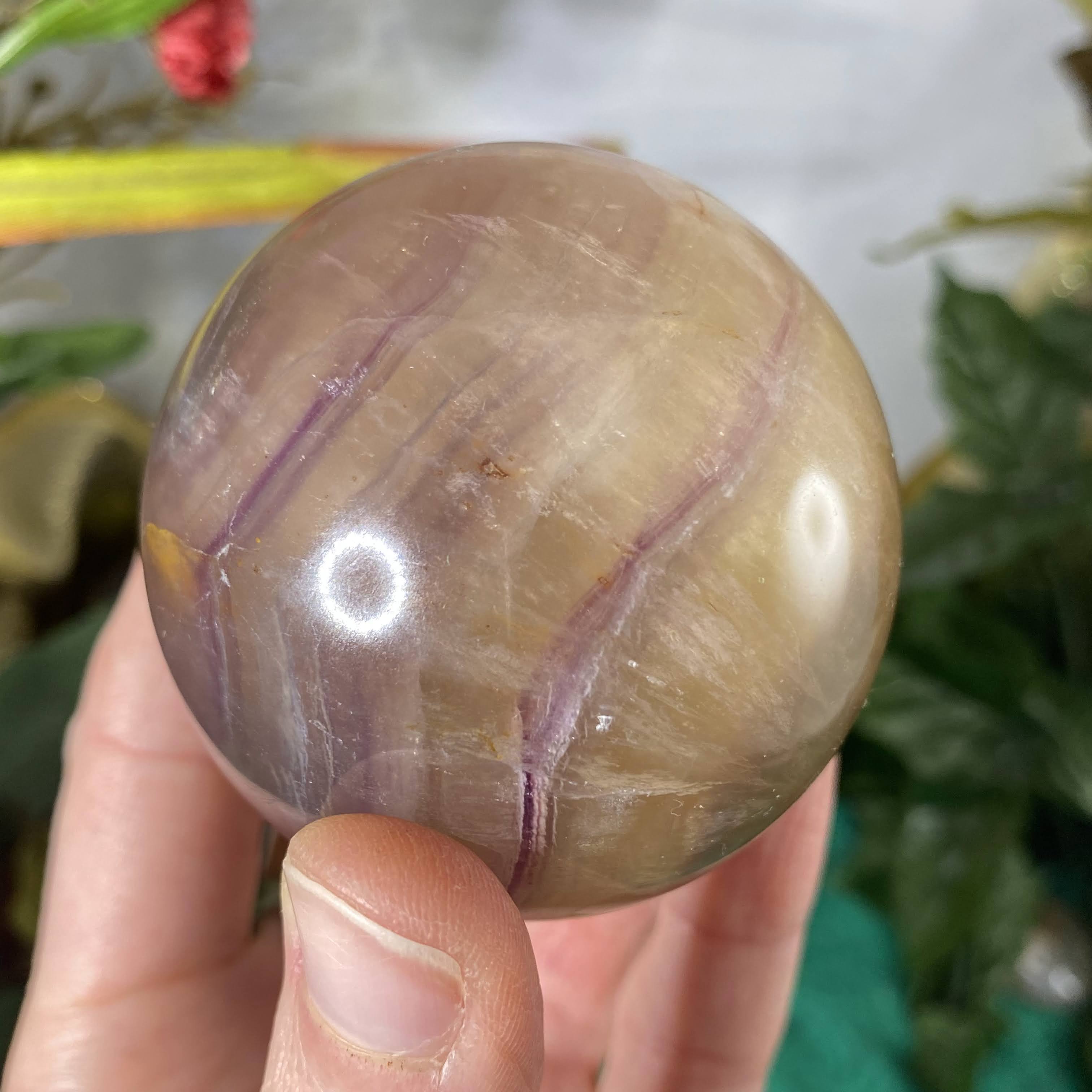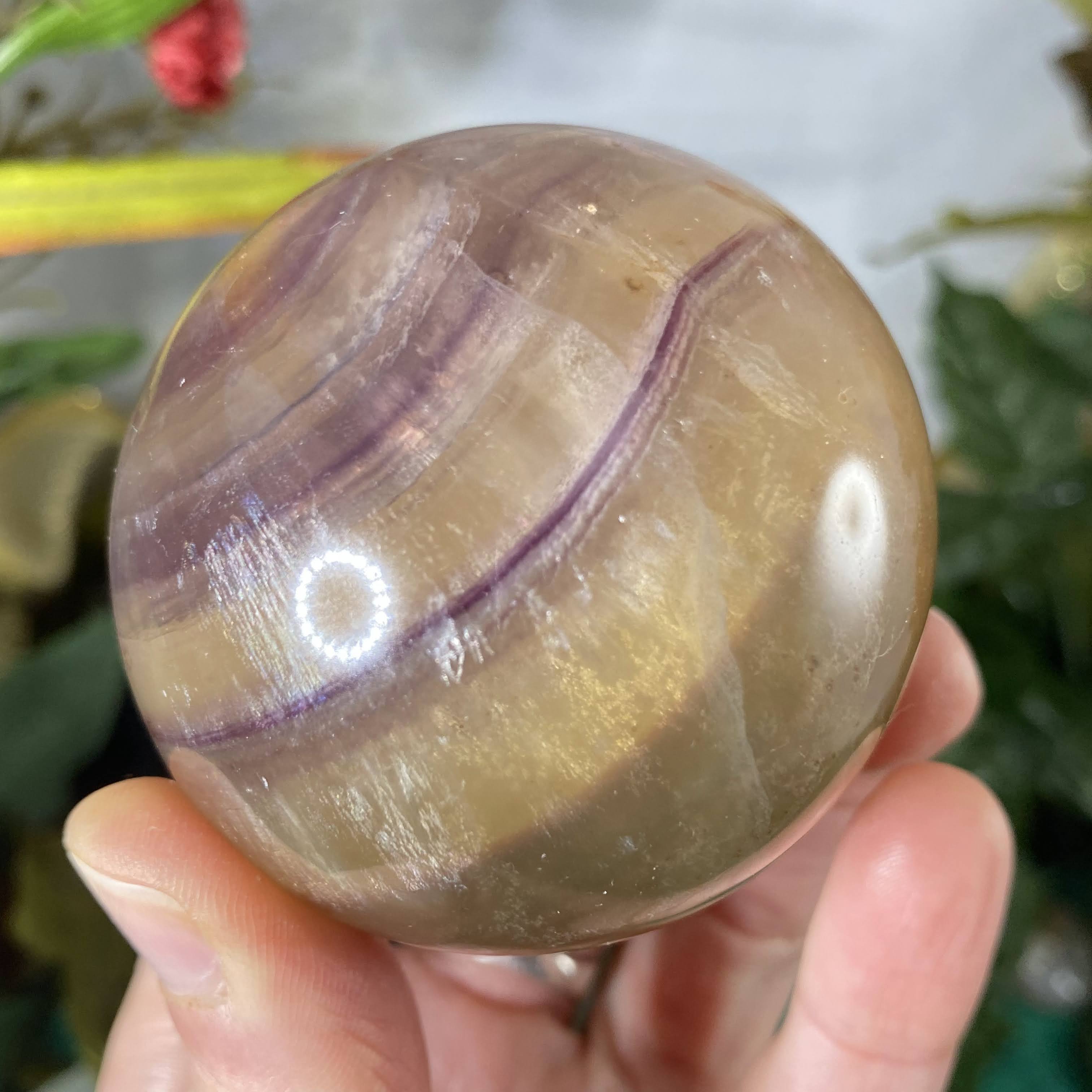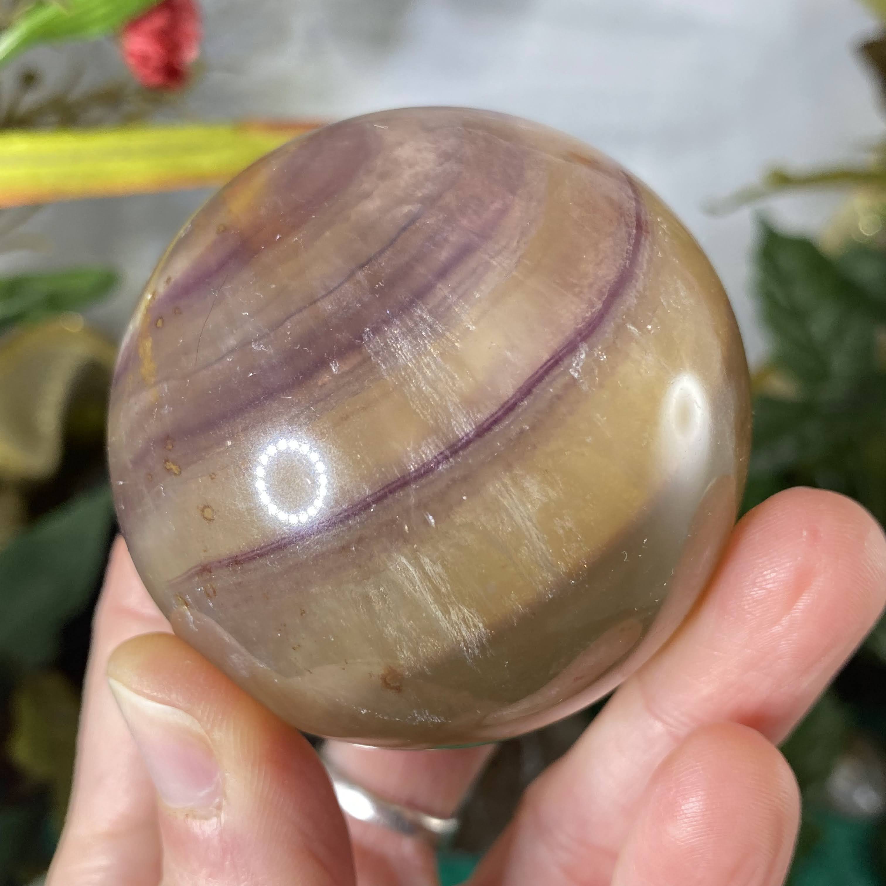 This listing is for the one 60 mm yellow & purple fluorite sphere shown.