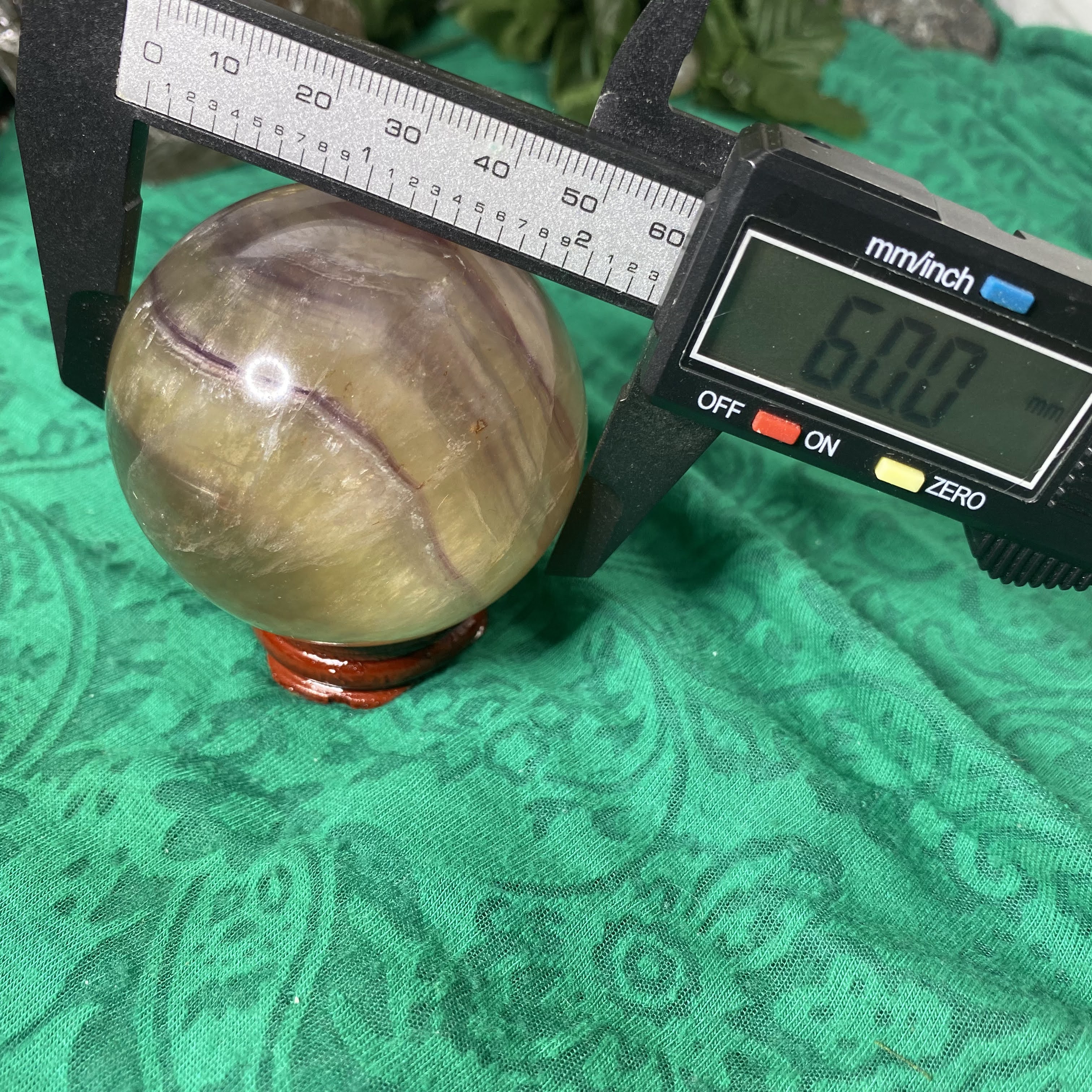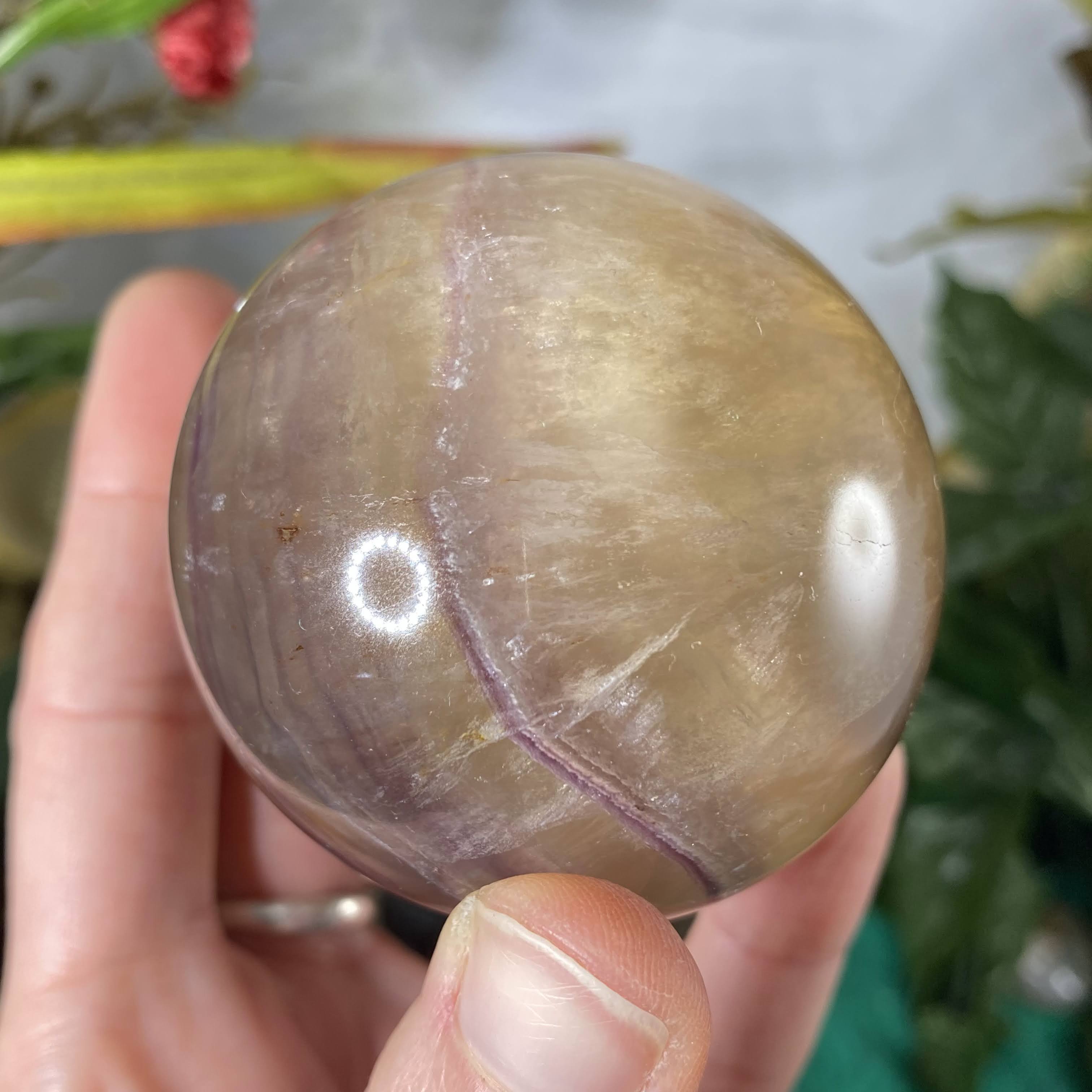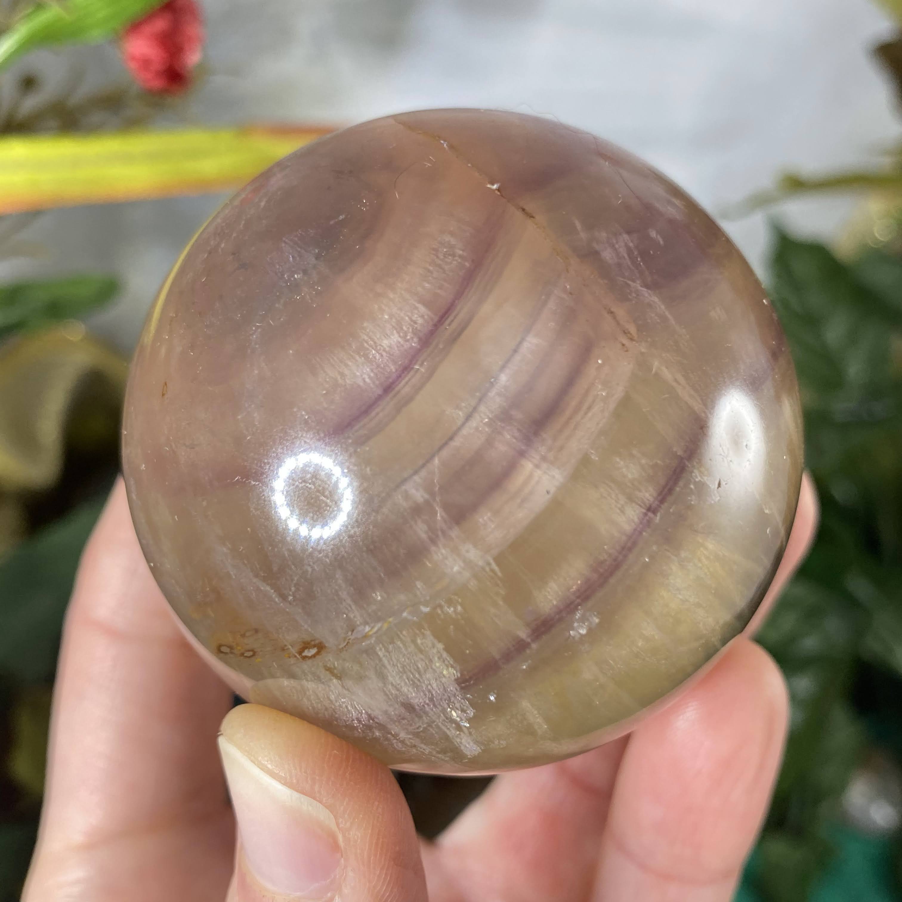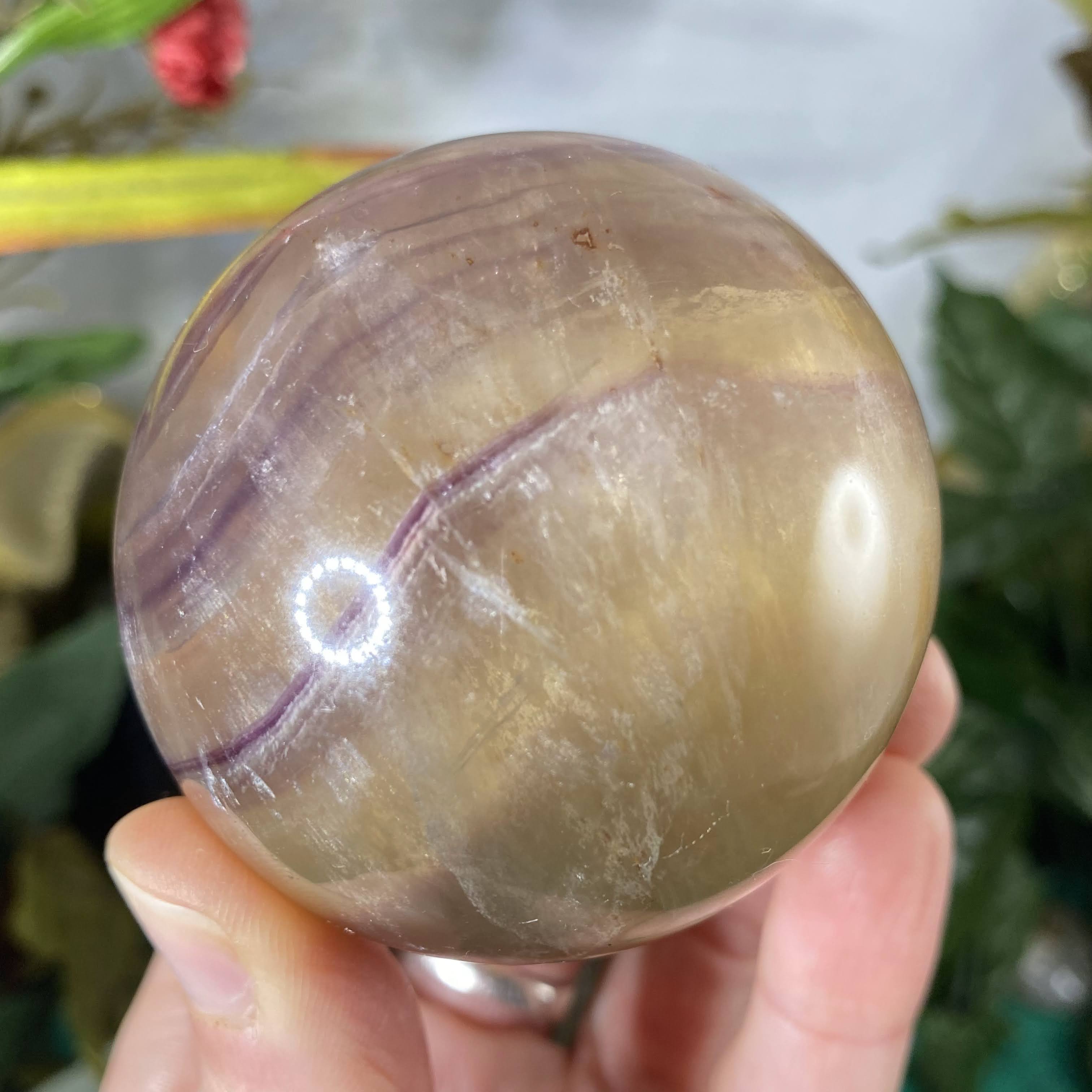 This listing is for the one 60 mm yellow & purple fluorite sphere shown.