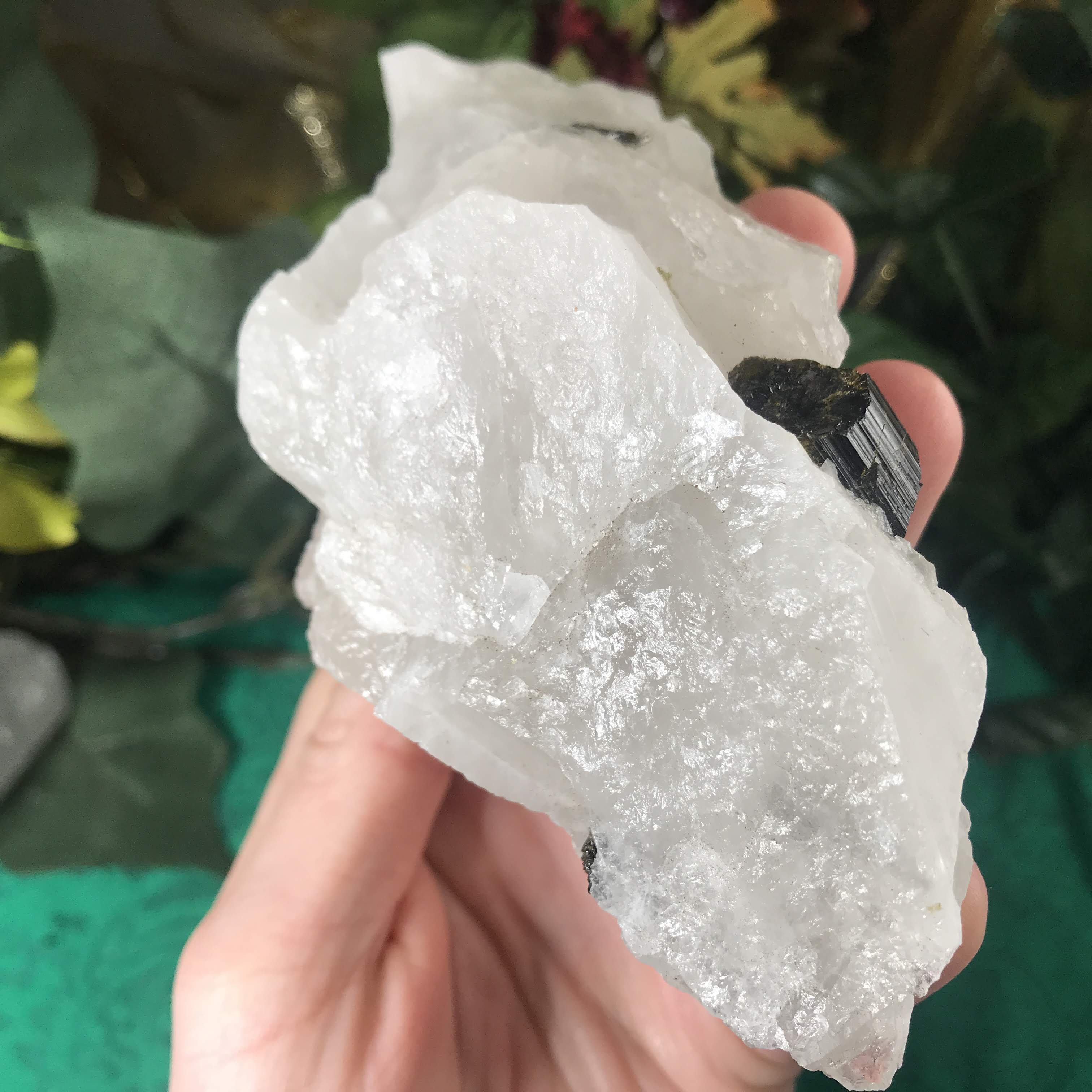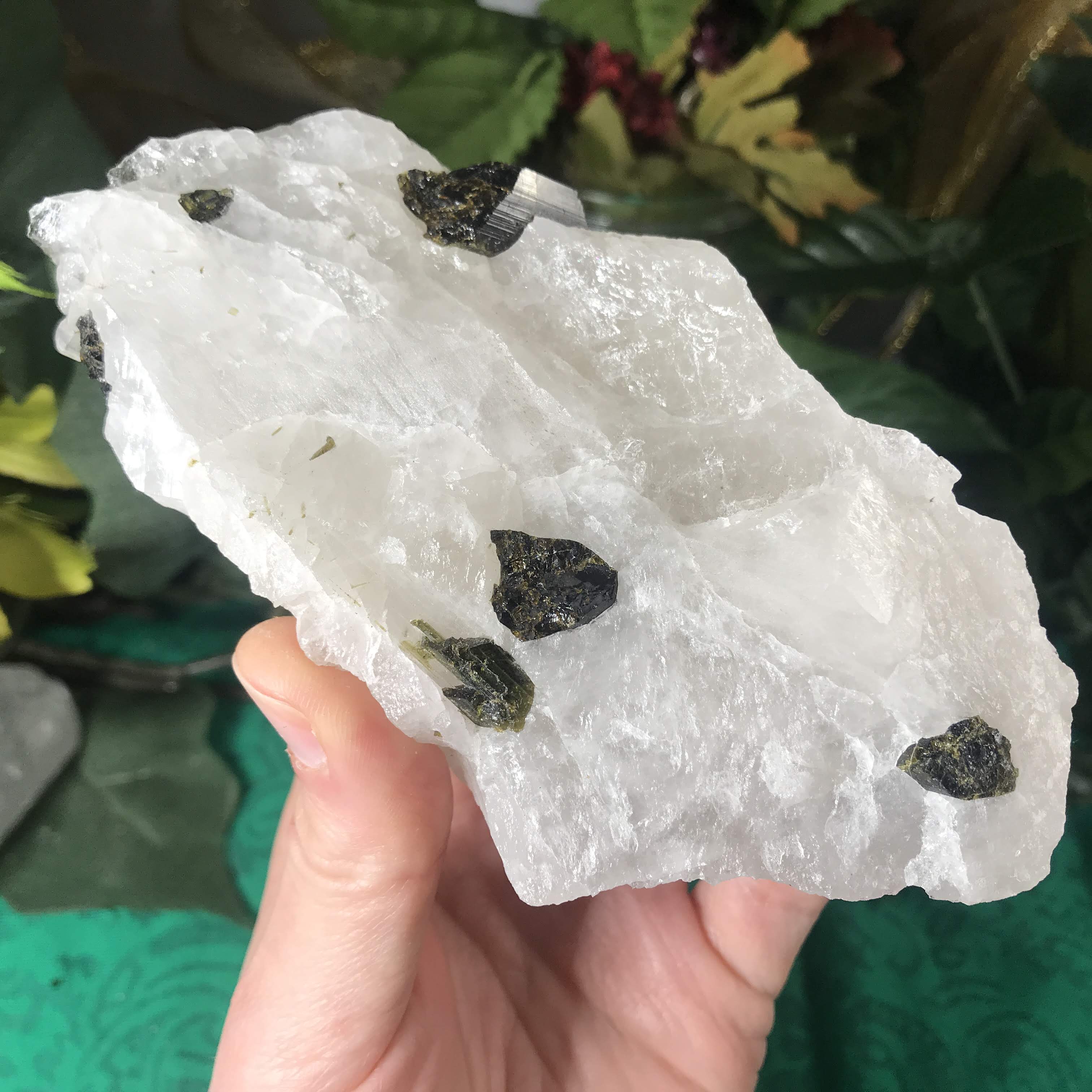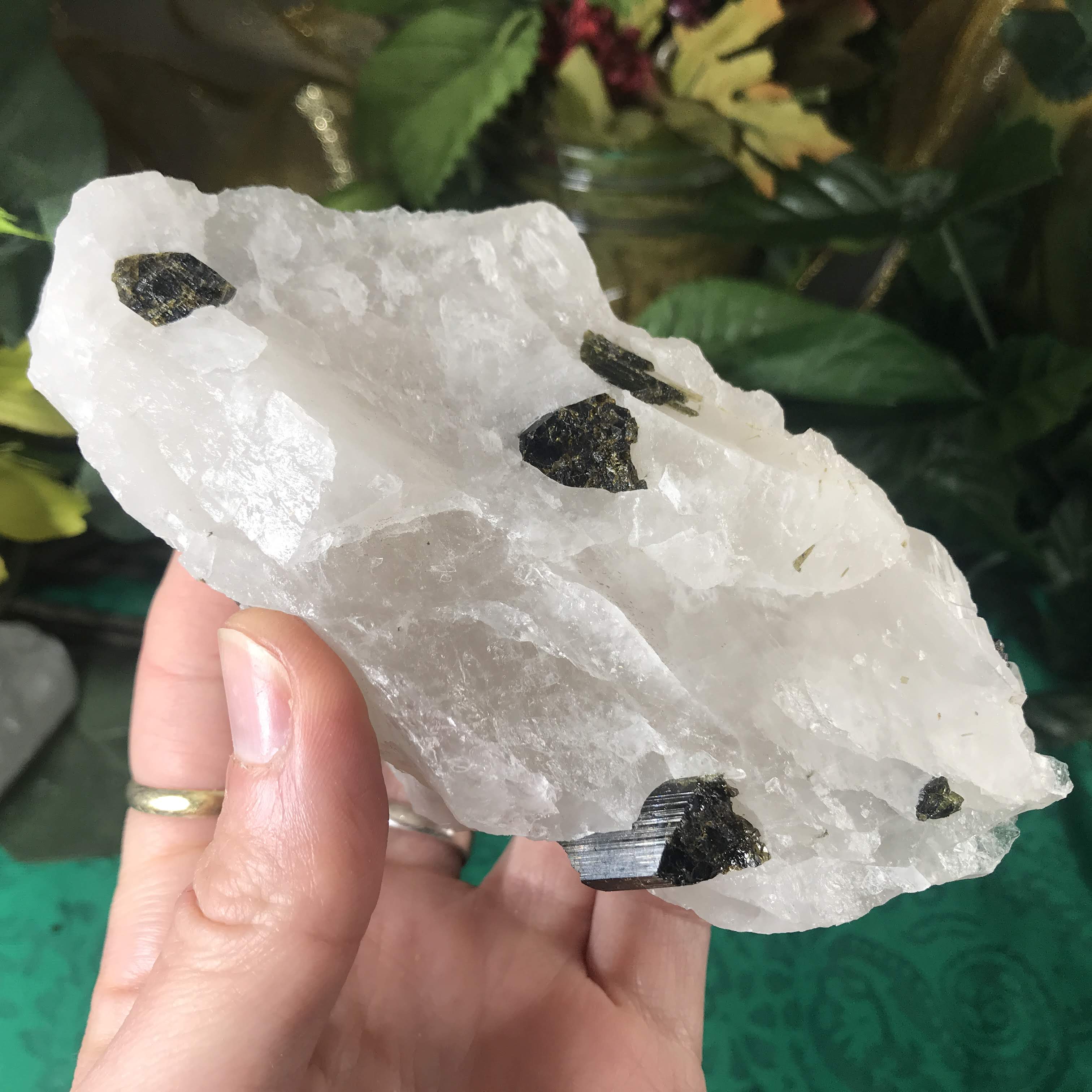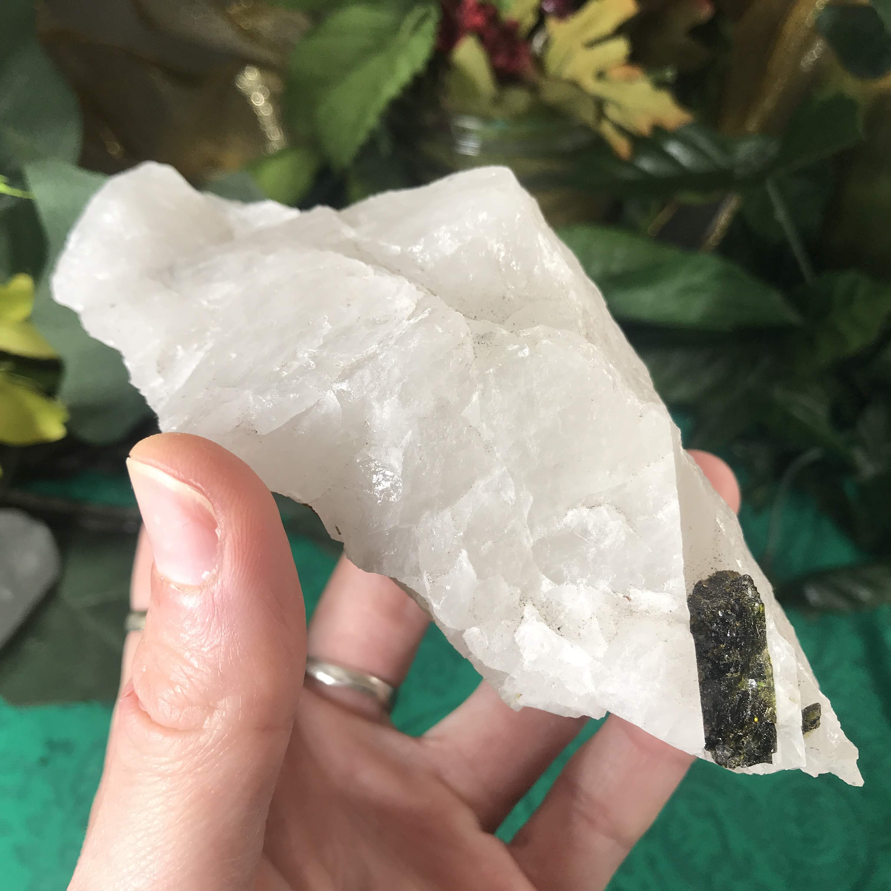Green Tourmalinated Quartz- Combines the qualities of tourmaline with the qualities of Quartz. The quartz (power, energy director transmuter and amplifier, and all around healing crystal!) will amplify the strong properties of the tourmaline.
