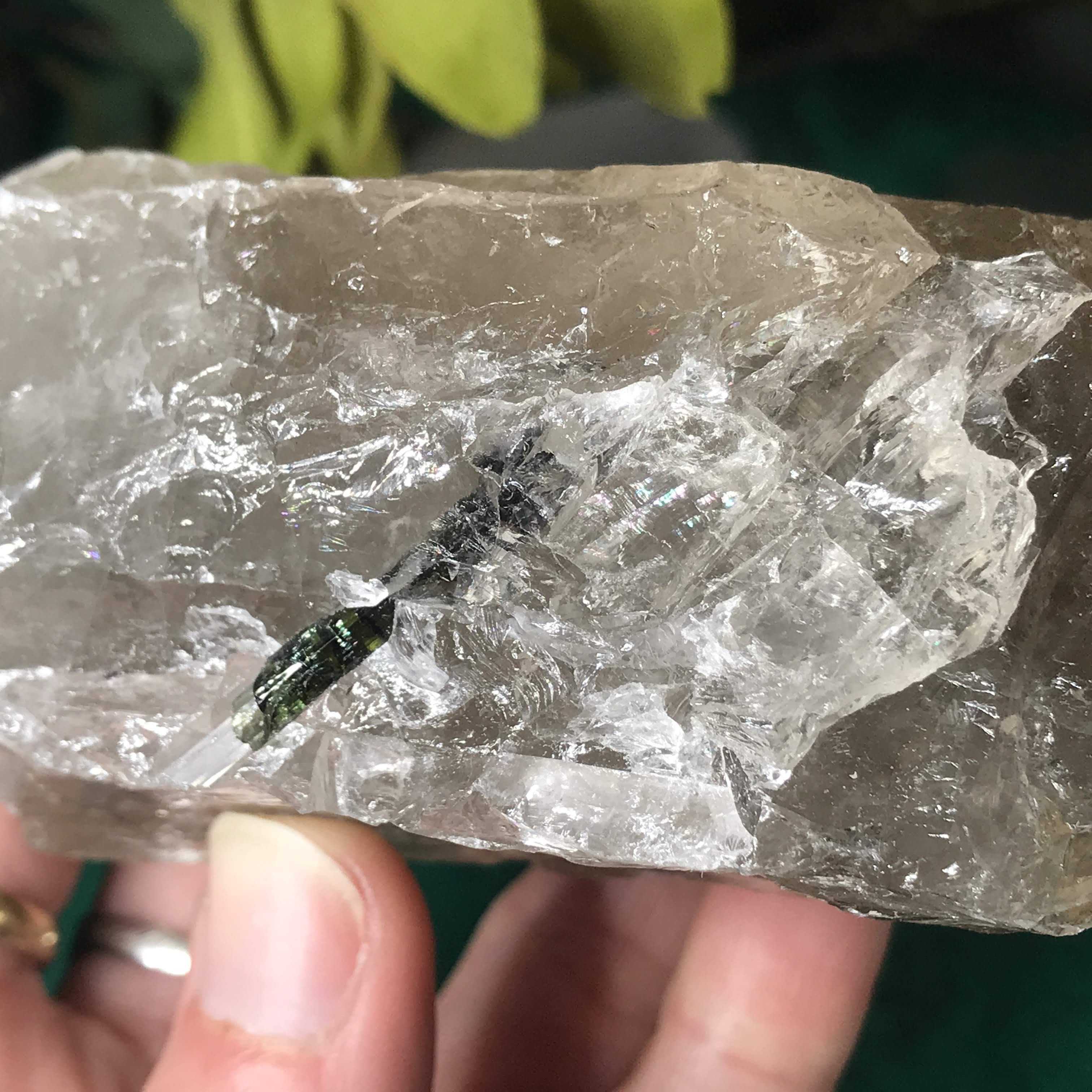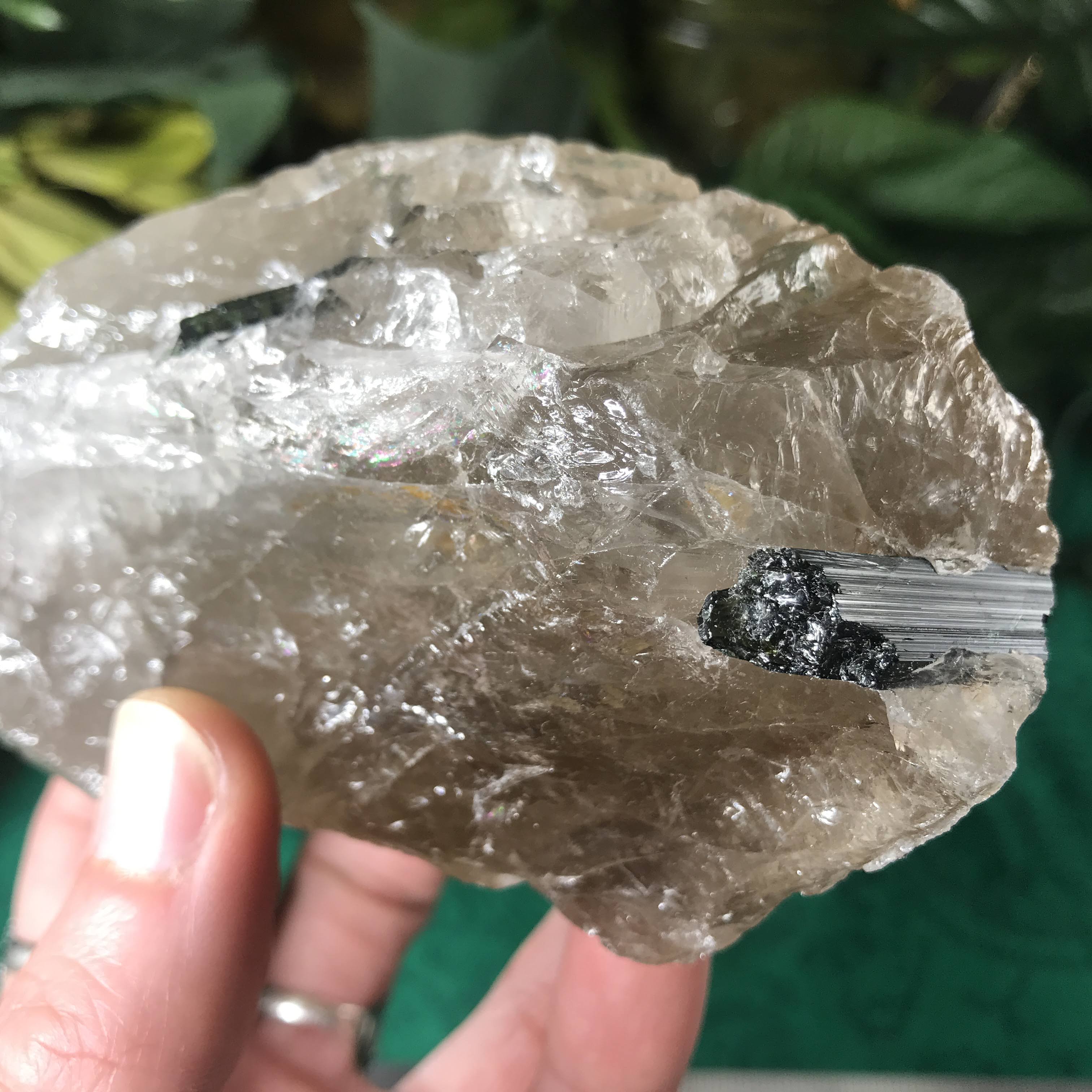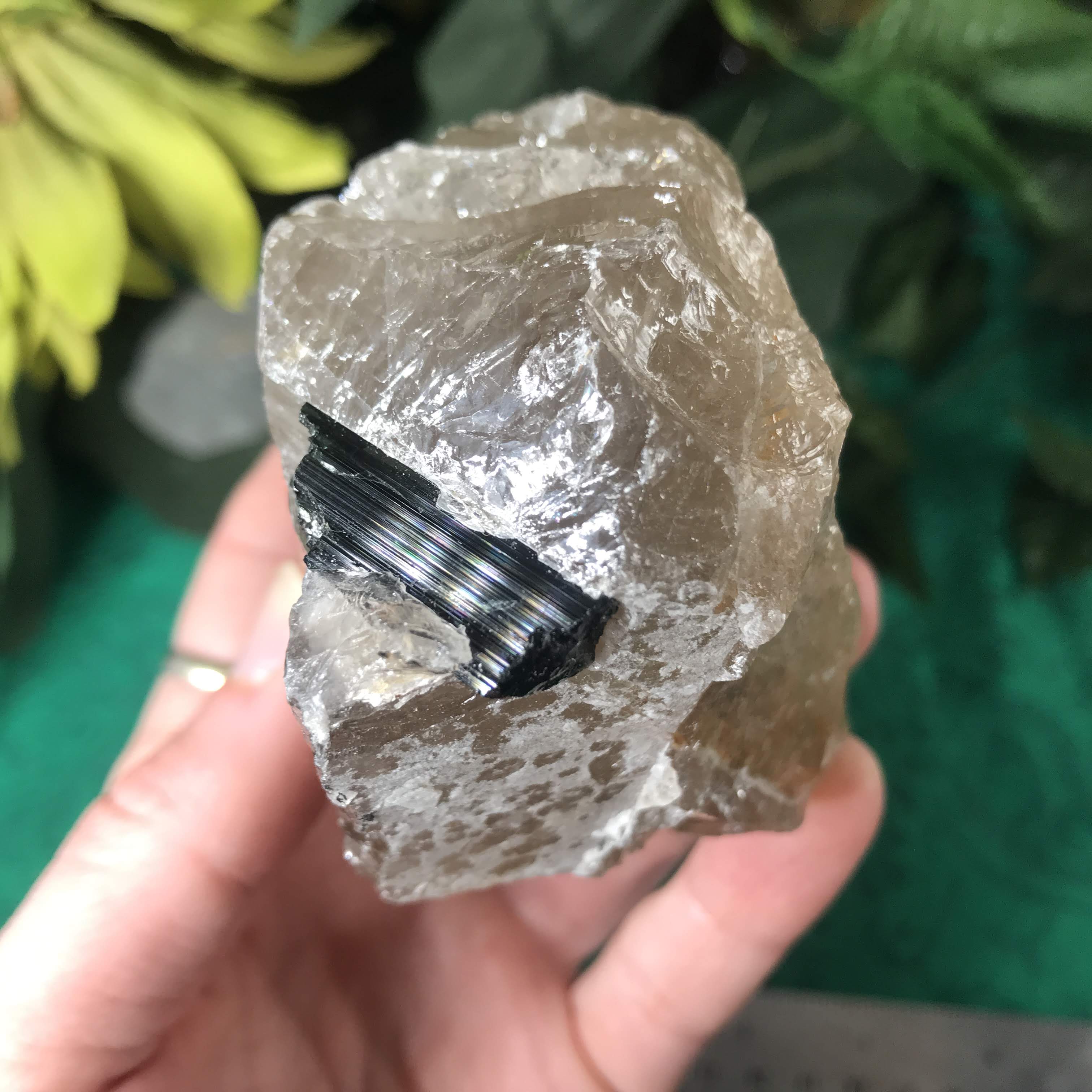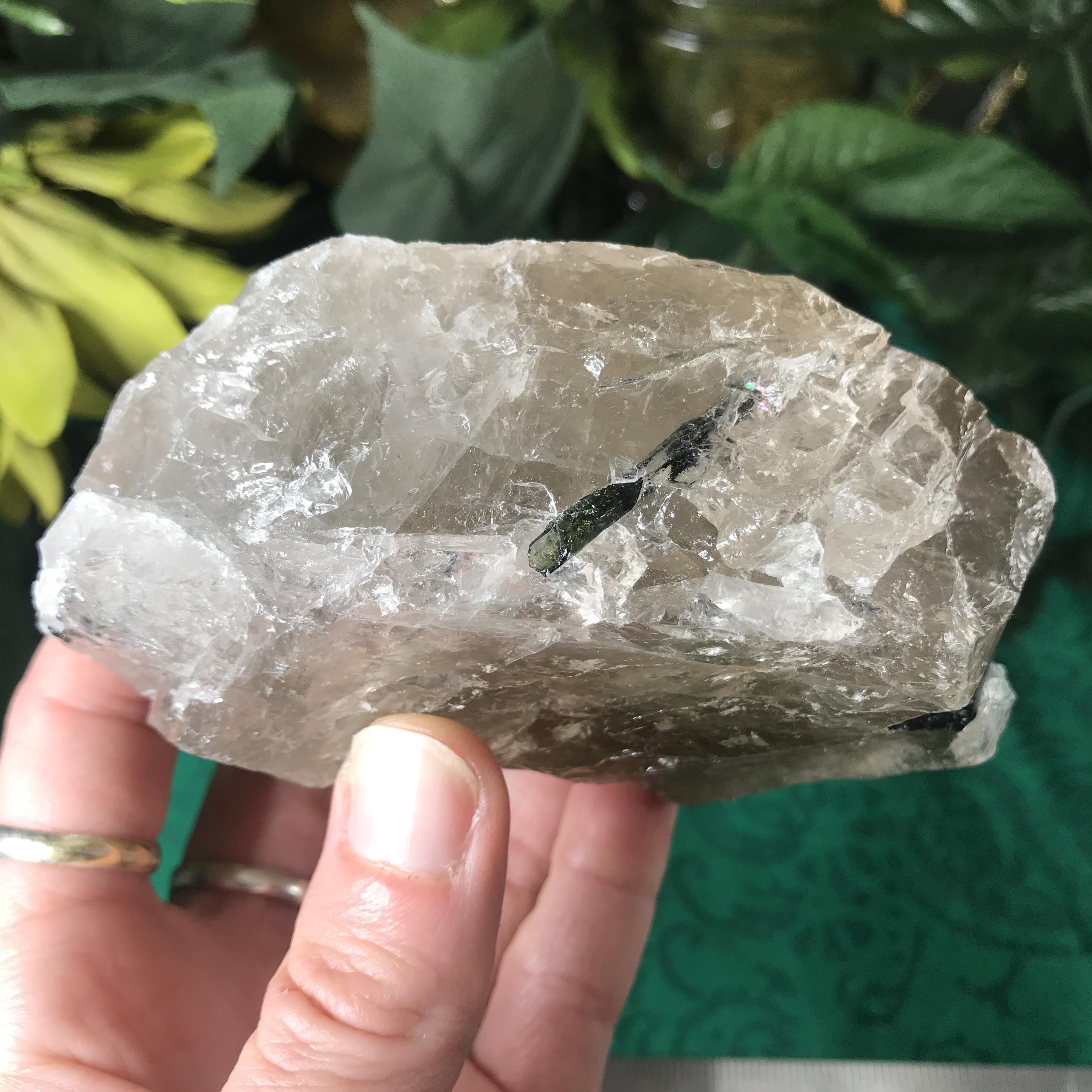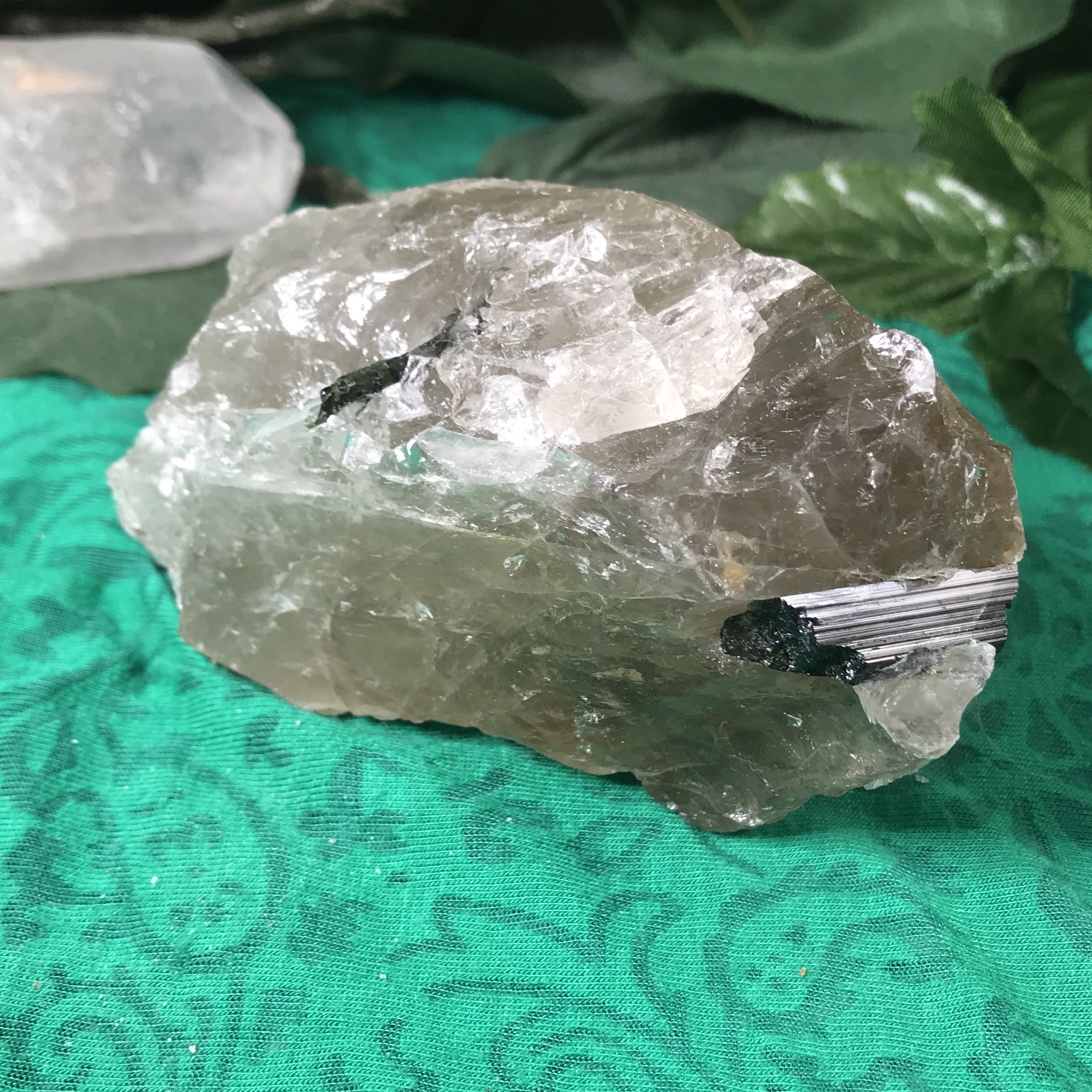 Green Tourmalinated Quartz- Combines the qualities of tourmaline with the qualities of quartz. The quartz (power and wonderful healing crystal!) will amplify the strong properties of the tourmaline. With it being smokey quartz it will also help with grounding, shielding, detoxing negative & dense energies, and helping with an uplift.