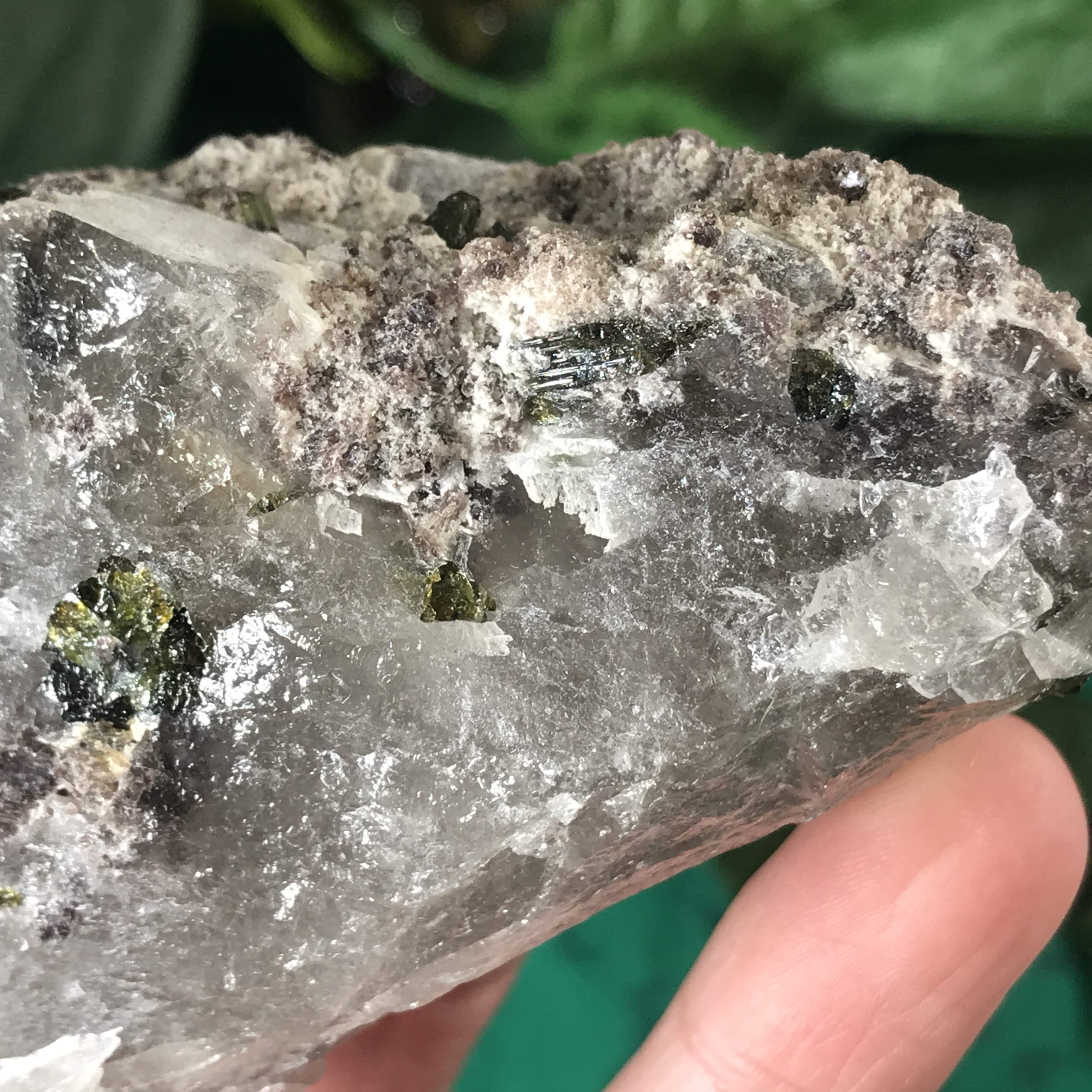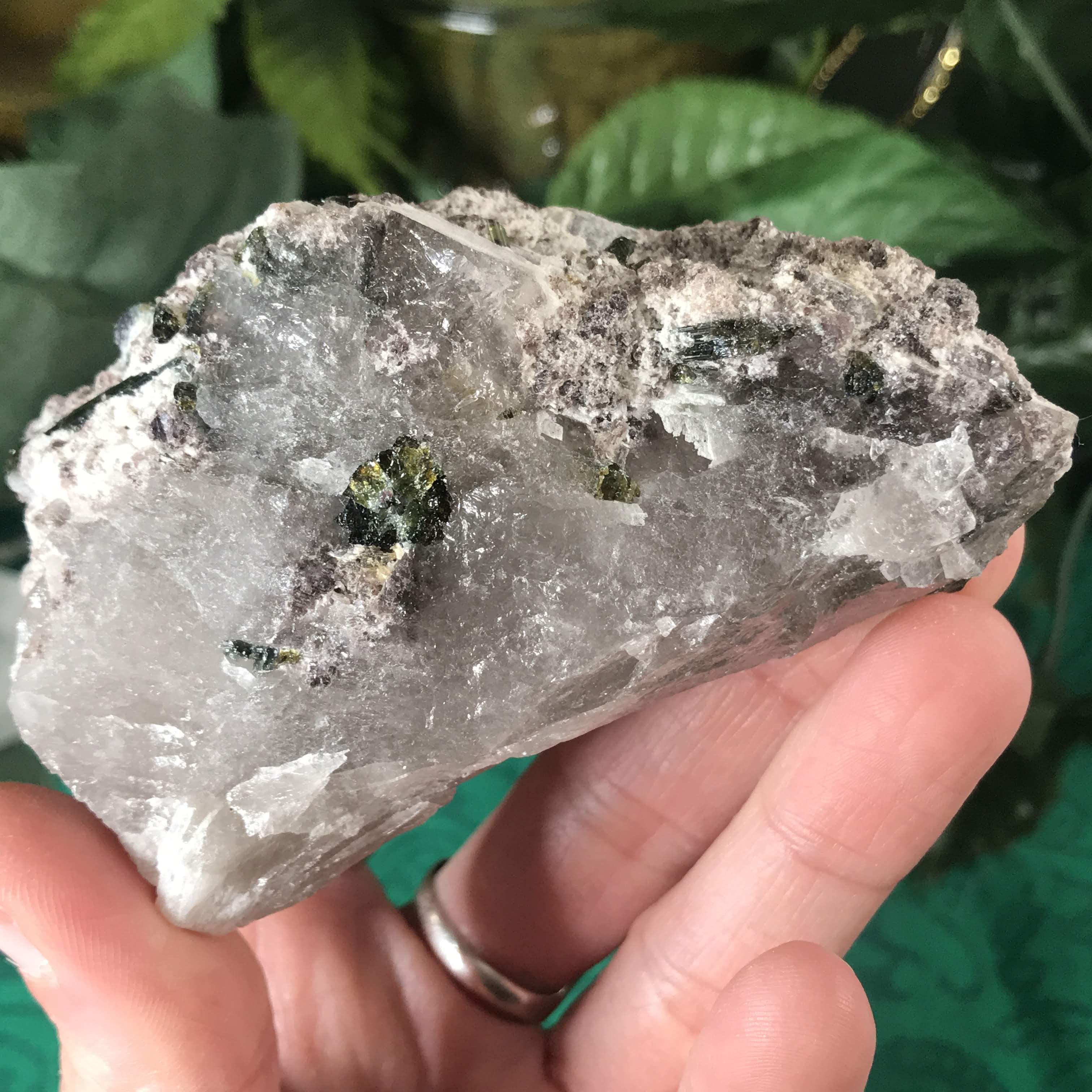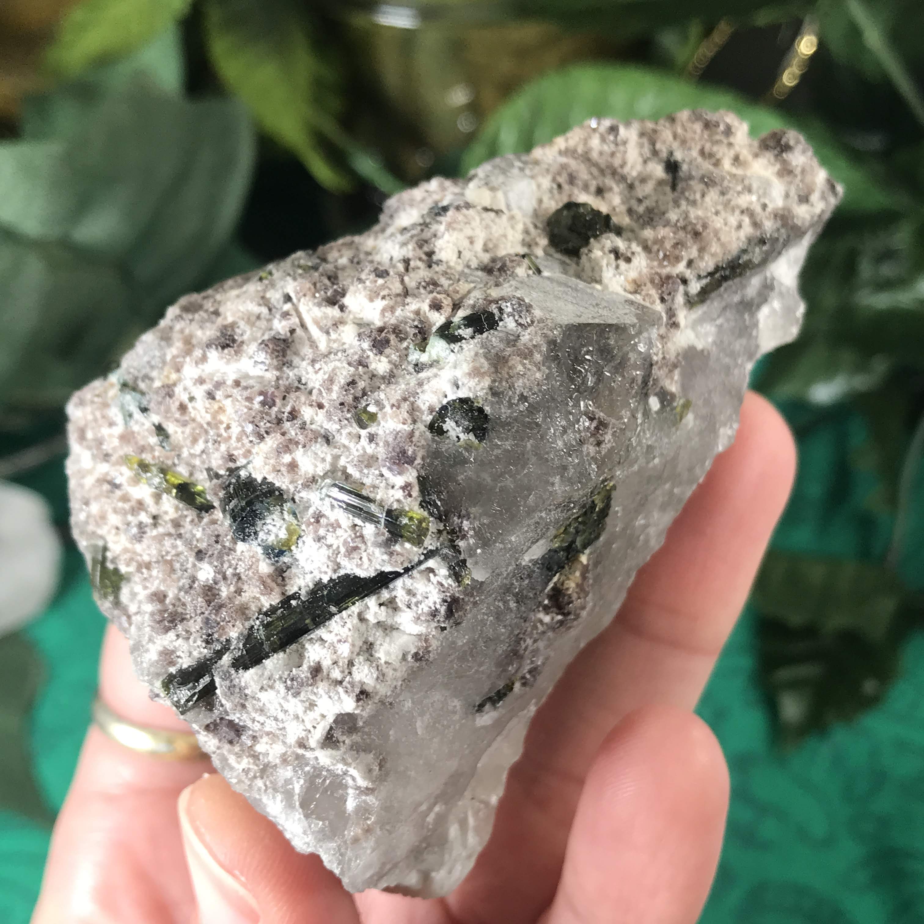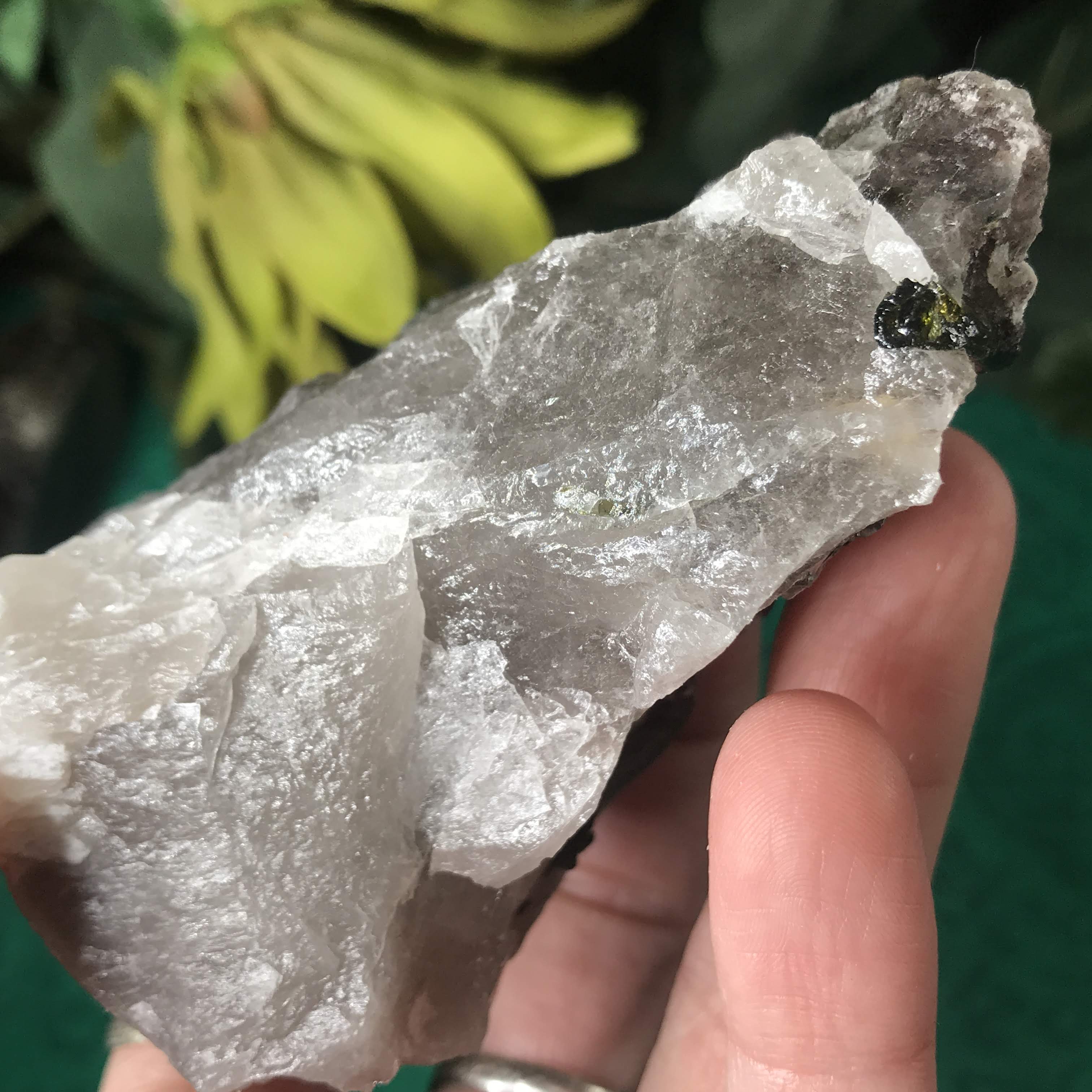 Green Tourmalinated Quartz- Combines the qualities of tourmaline with the qualities of quartz. The quartz (power and wonderful healing crystal!) will amplify the strong properties of the tourmaline. With it being smokey quartz it will also help with grounding, shielding, detoxing negative & dense energies, and helping with an uplift.