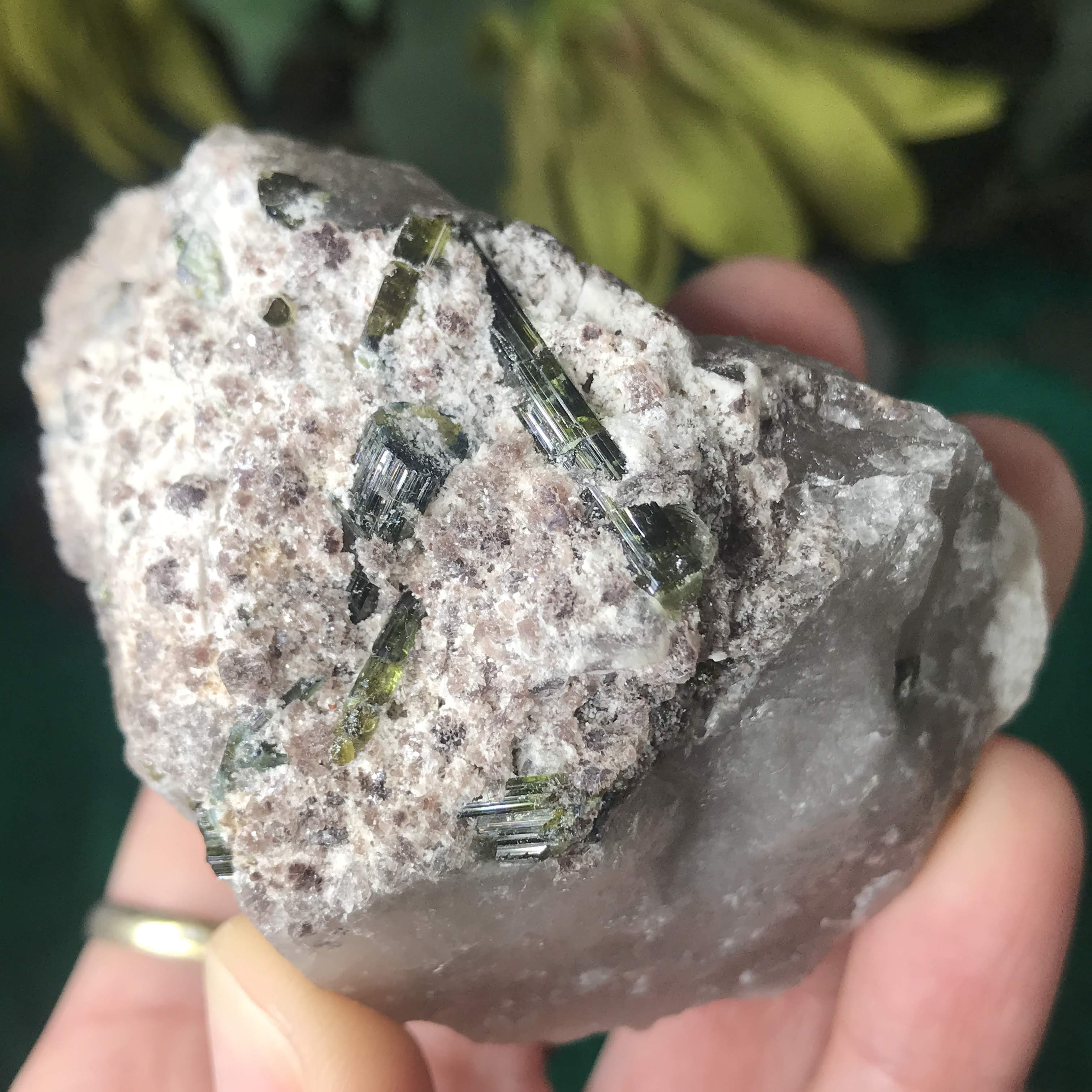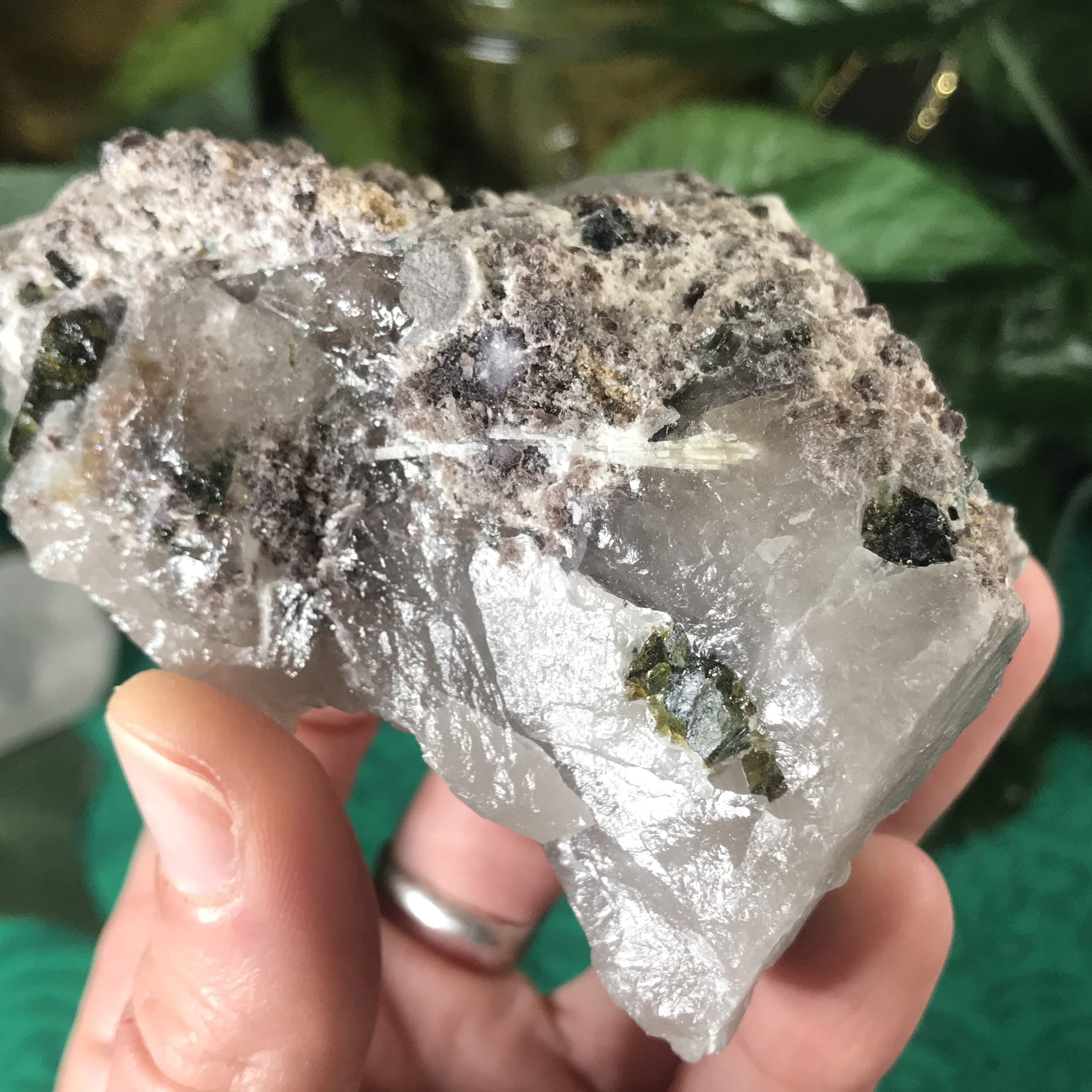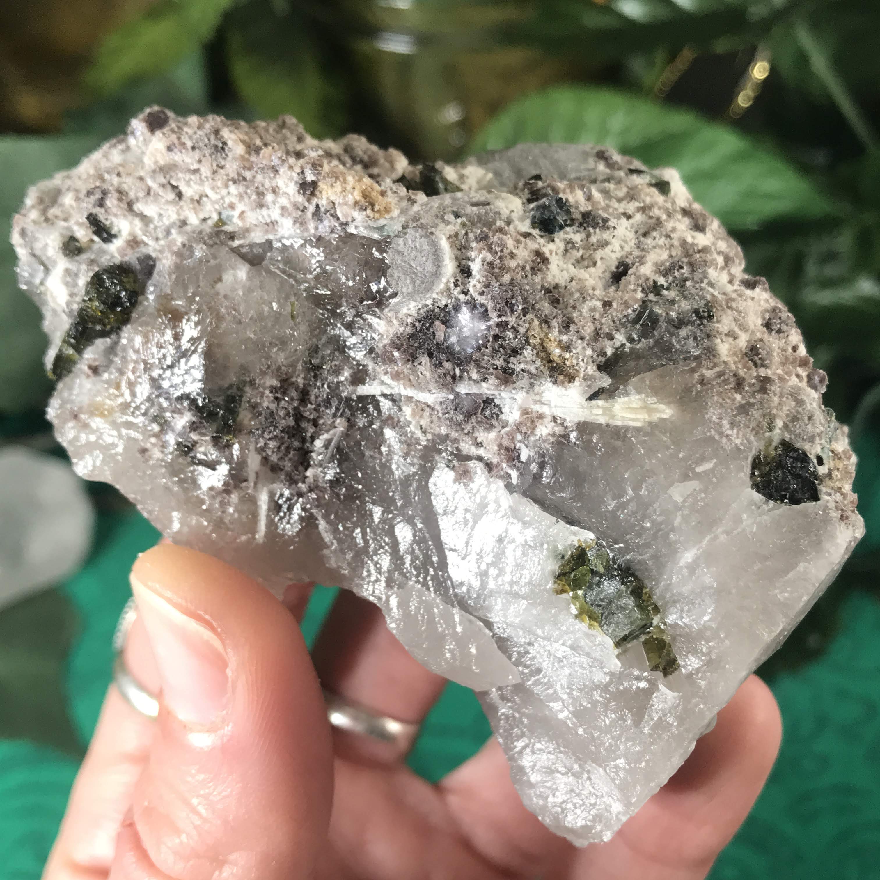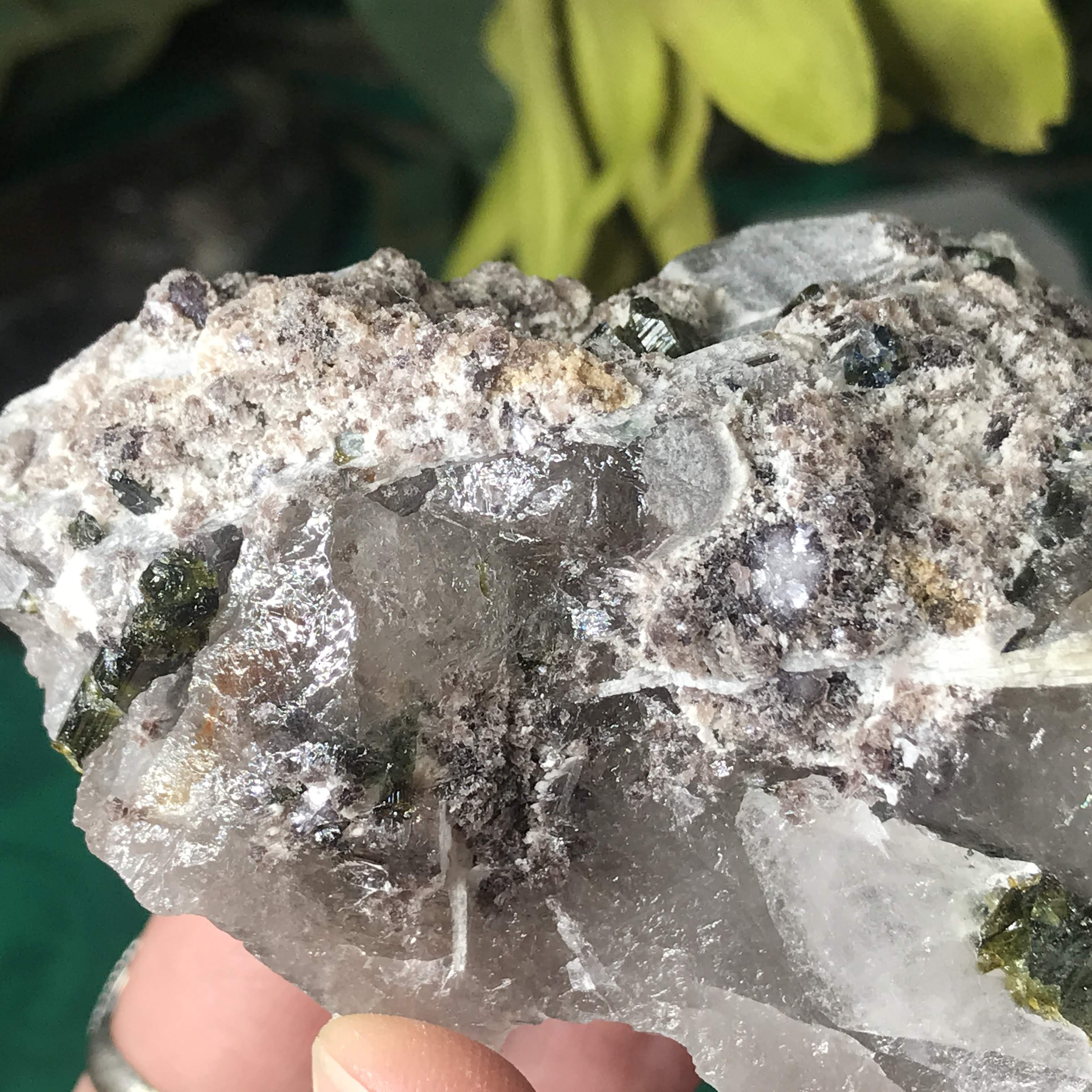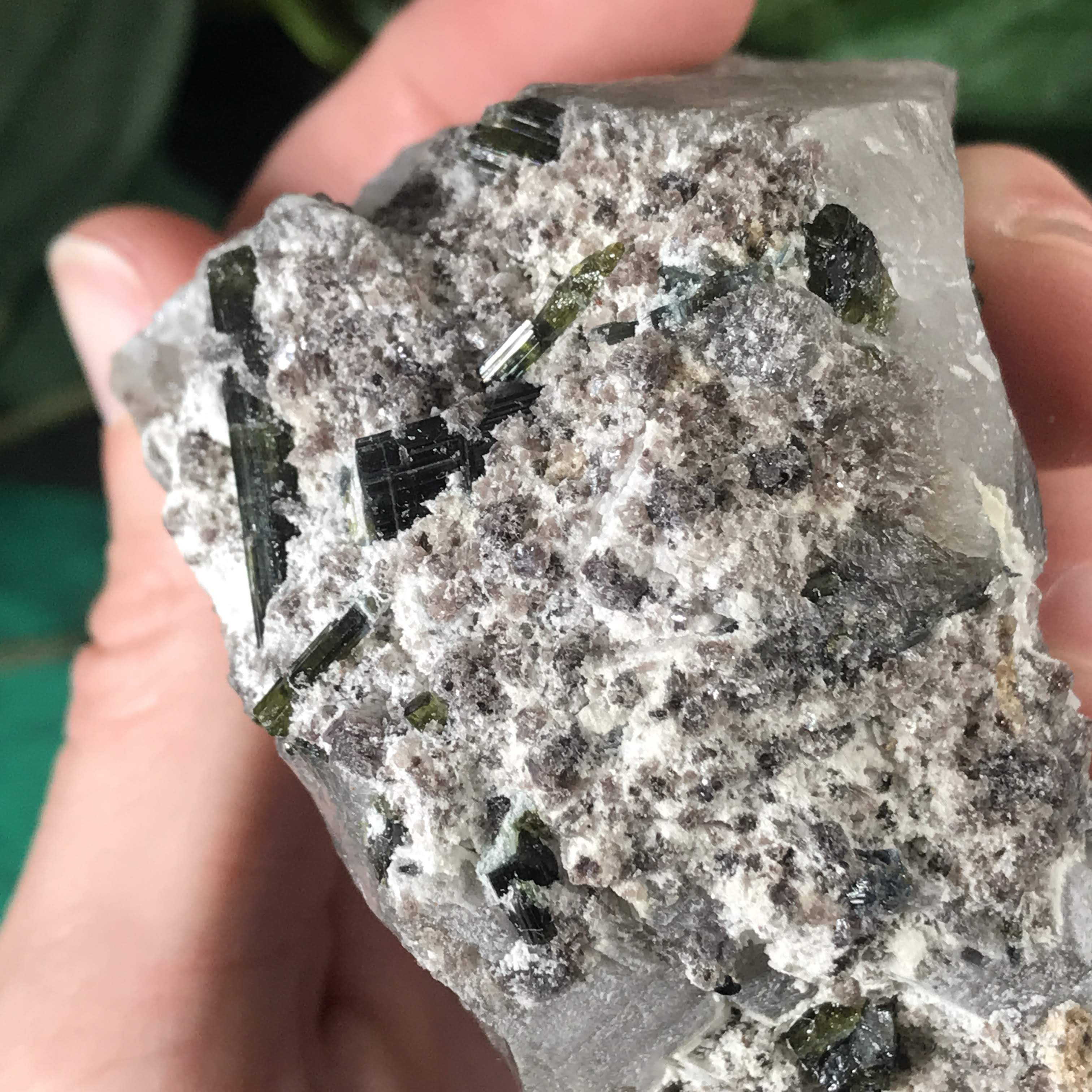 Green Tourmalinated Quartz- Combines the qualities of tourmaline with the qualities of quartz. The quartz (power and wonderful healing crystal!) will amplify the strong properties of the tourmaline. With it being smokey quartz it will also help with grounding, shielding, detoxing negative & dense energies, and helping with an uplift.