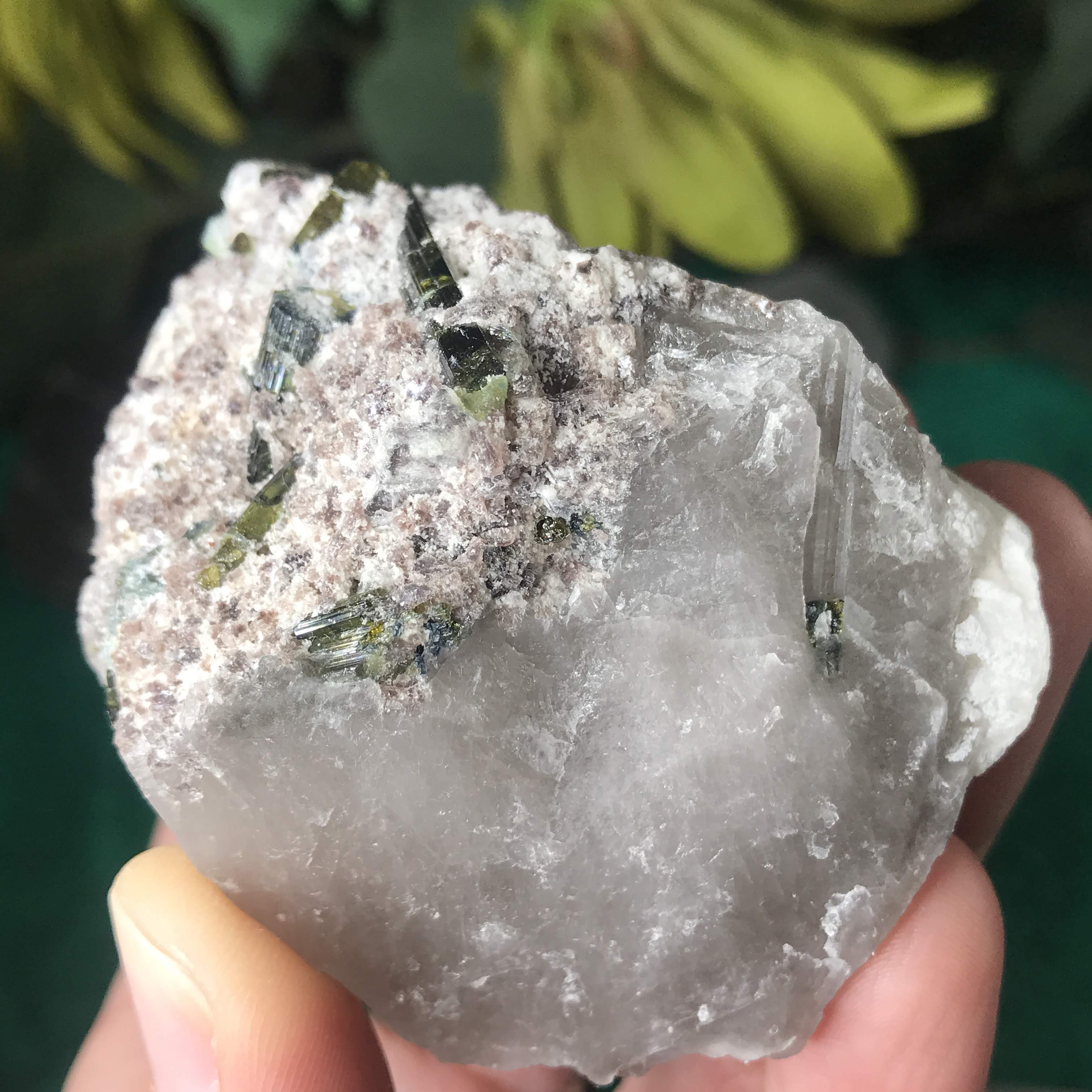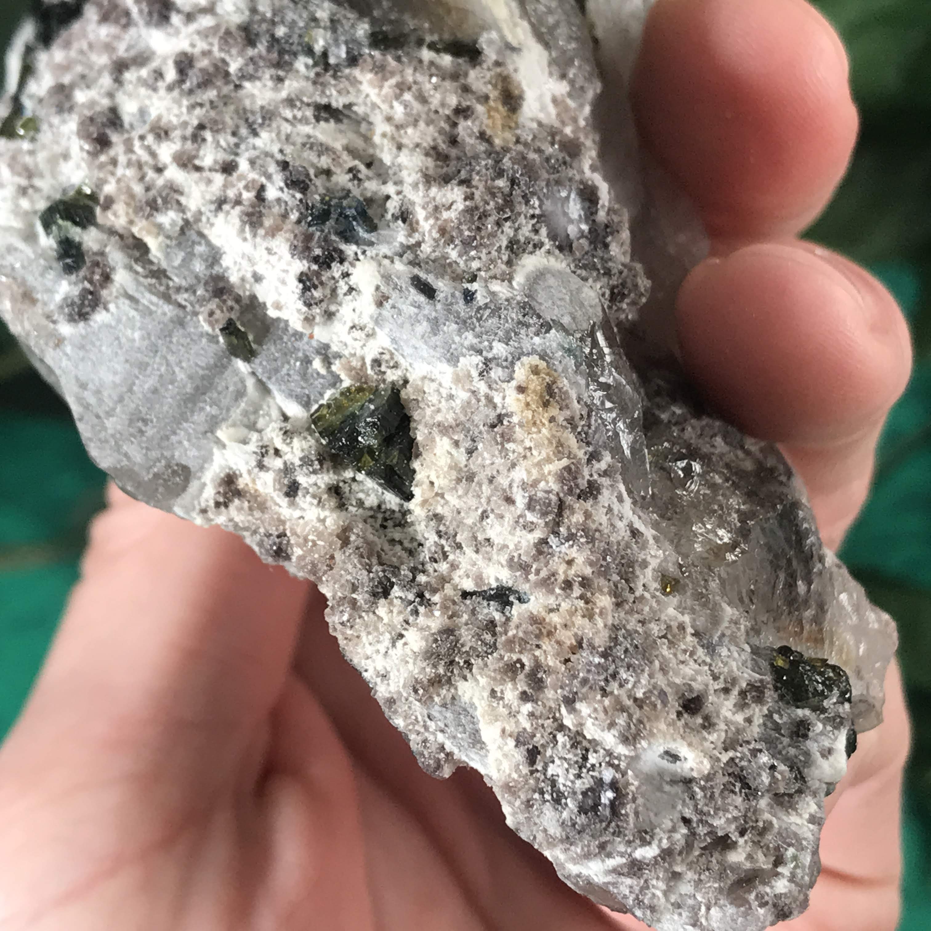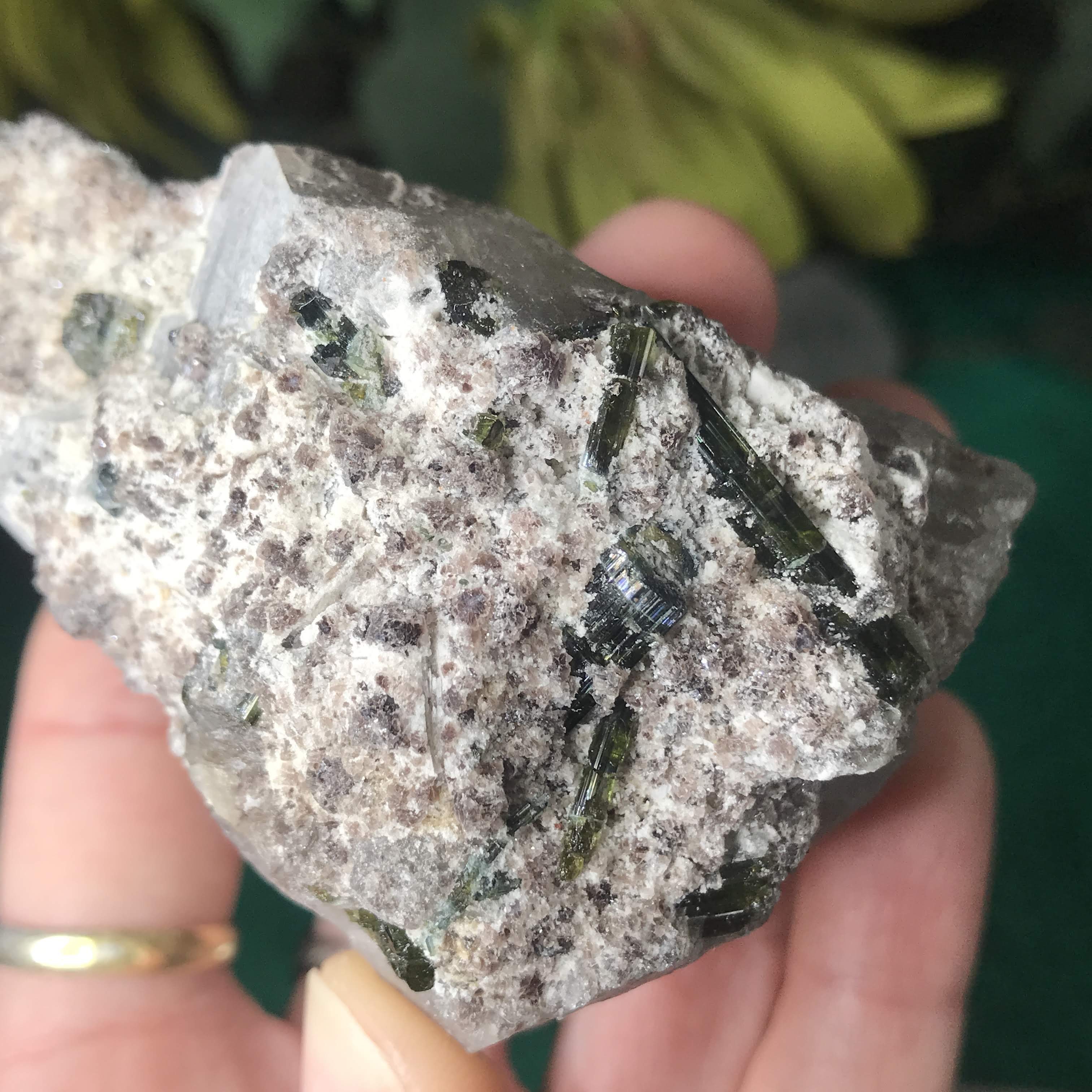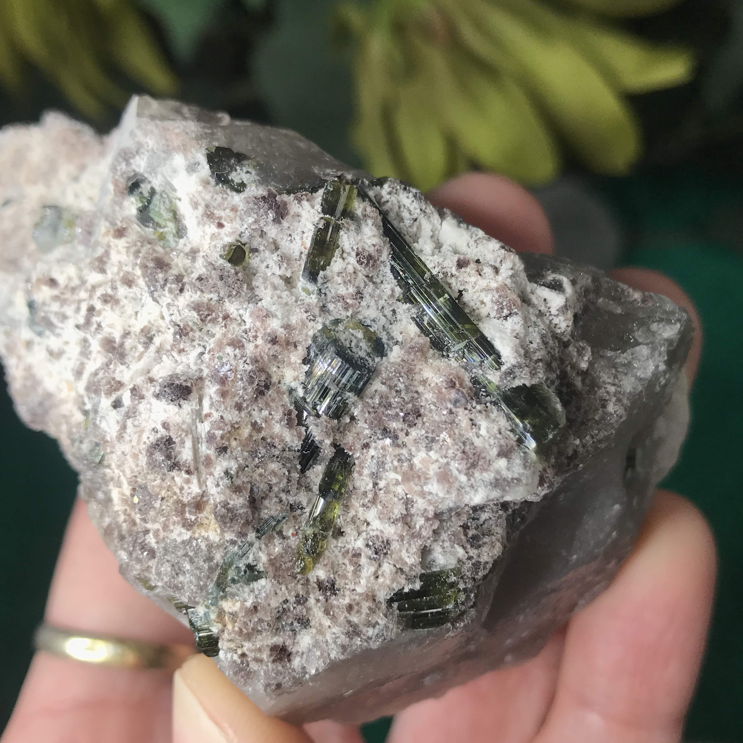 Green Tourmalinated Quartz- Combines the qualities of tourmaline with the qualities of quartz. The quartz (power and wonderful healing crystal!) will amplify the strong properties of the tourmaline. With it being smokey quartz it will also help with grounding, shielding, detoxing negative & dense energies, and helping with an uplift.