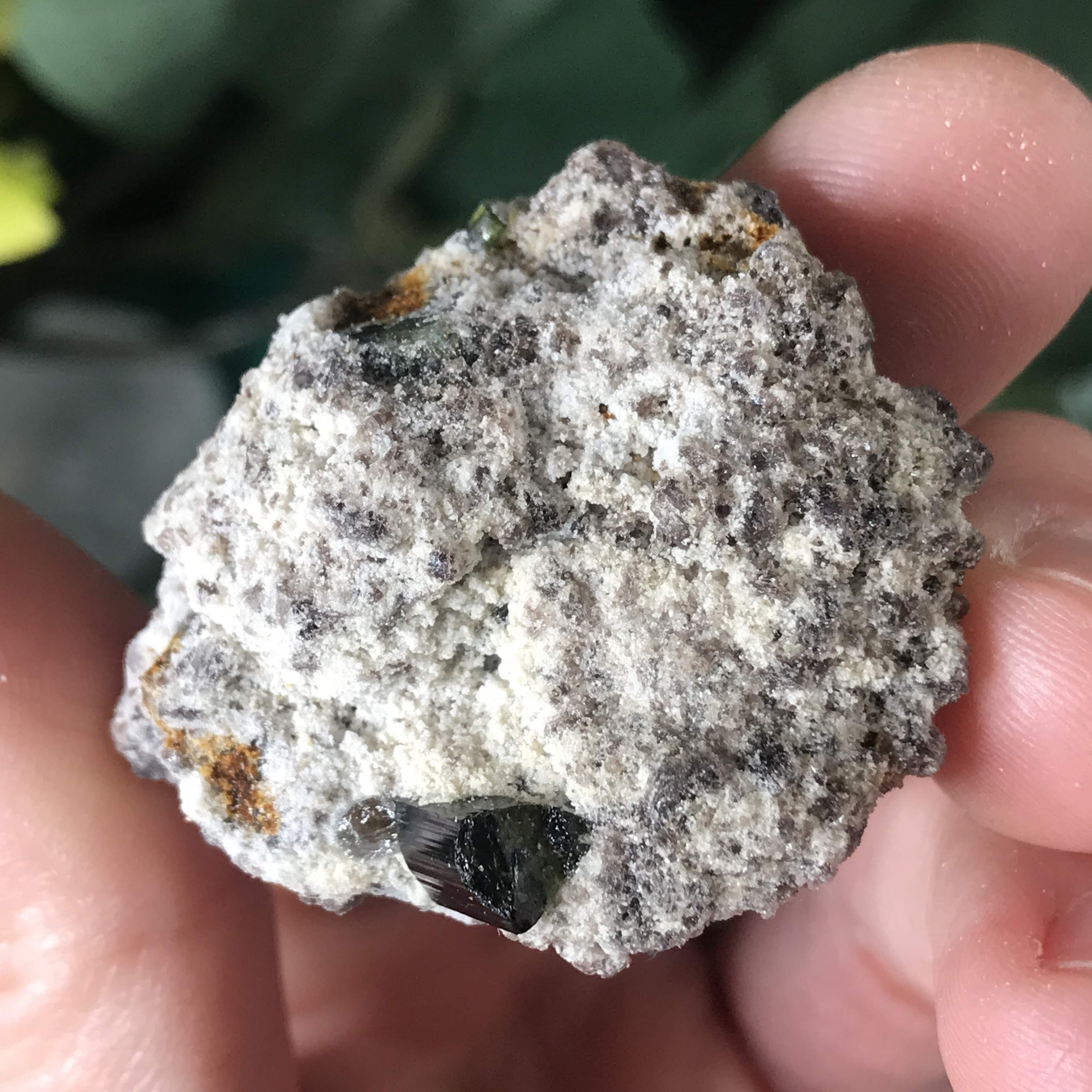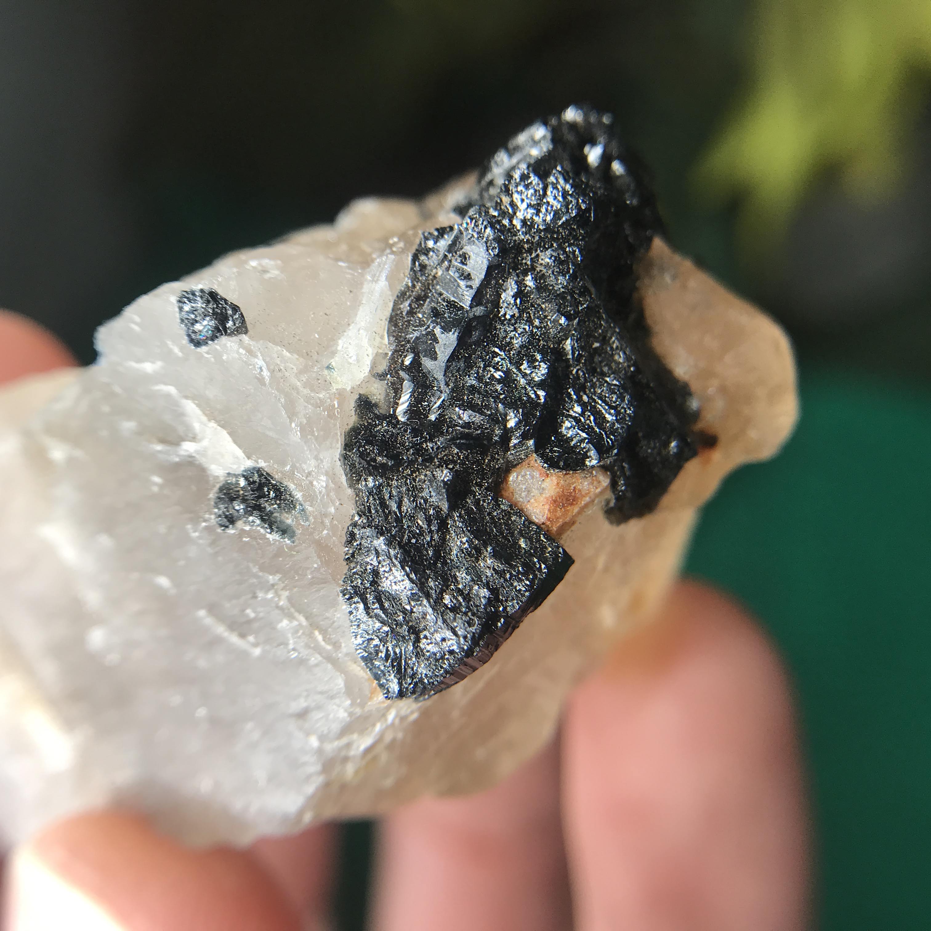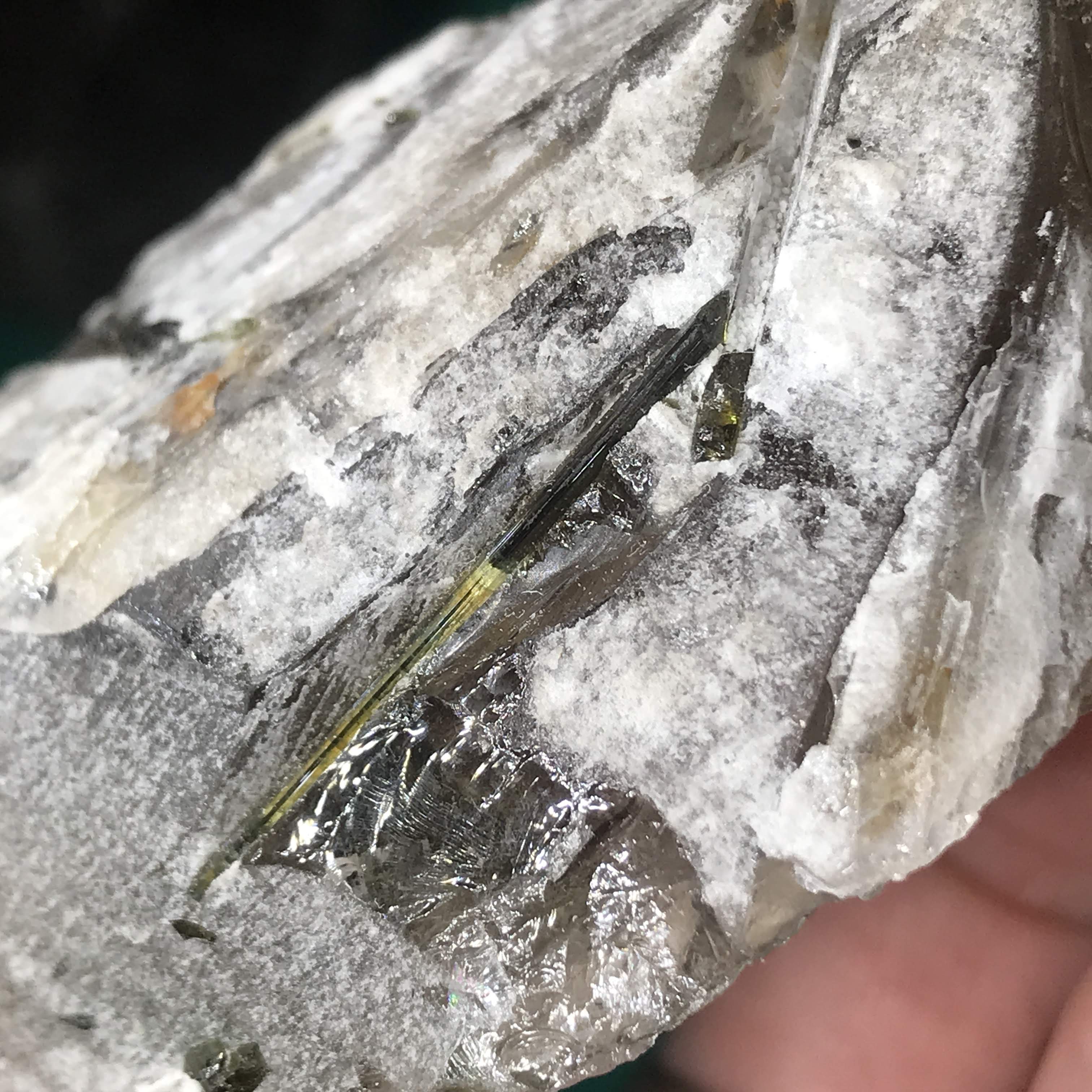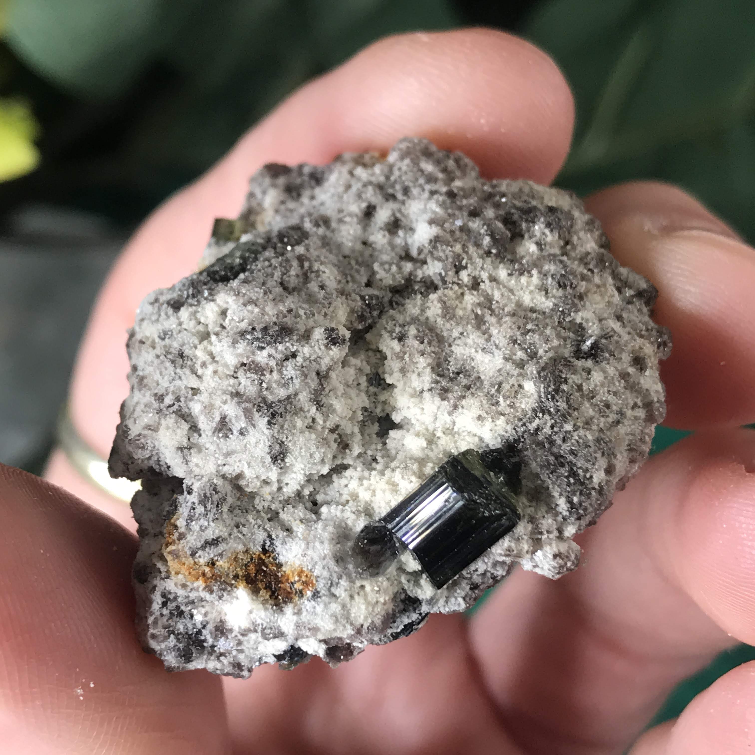 #11 I almost couldn't tell if it was black or green tourmaline because it is SO dark! Looking with a lens it looks like the dust around it is green, so I'm thinking a reaaally dark green tourmaline.