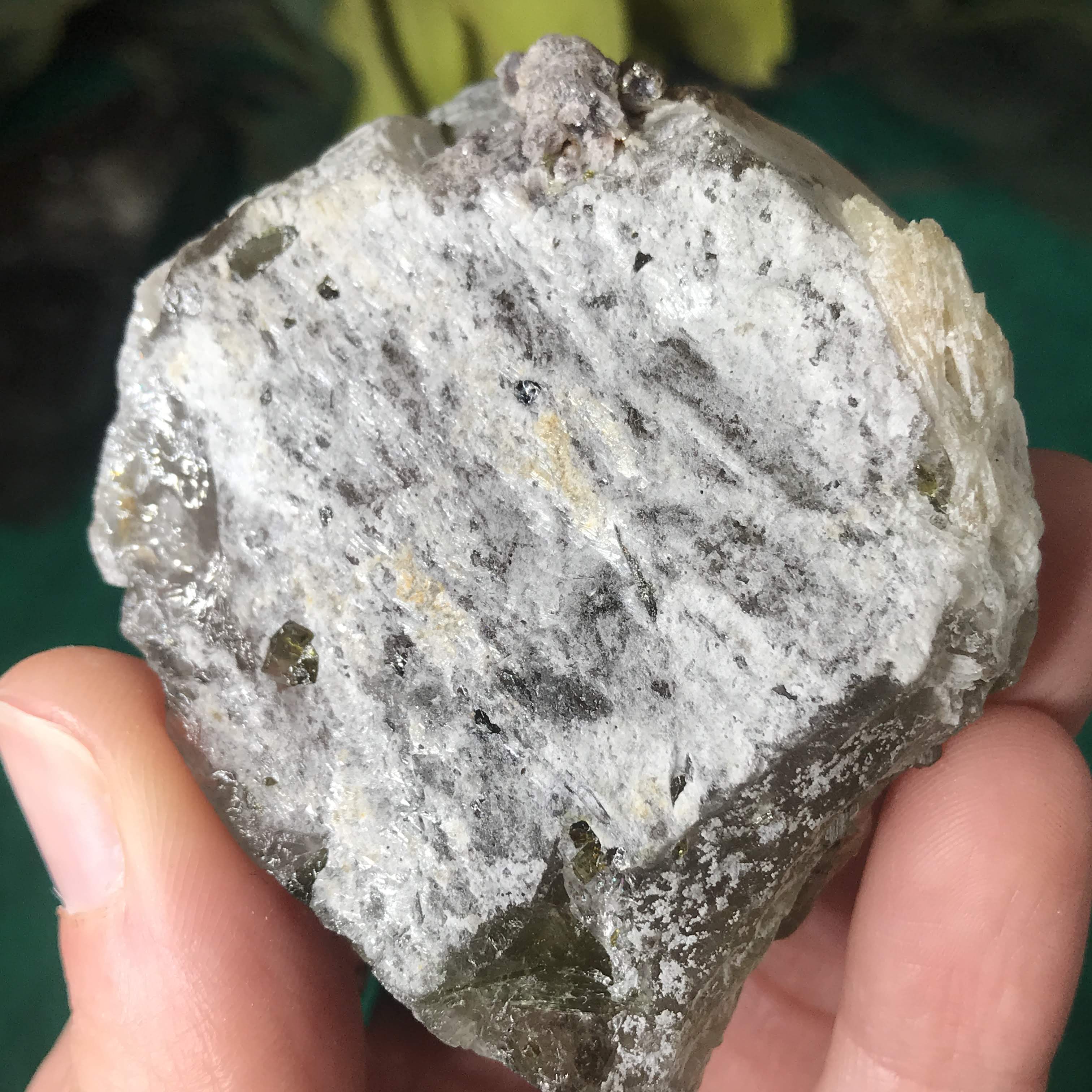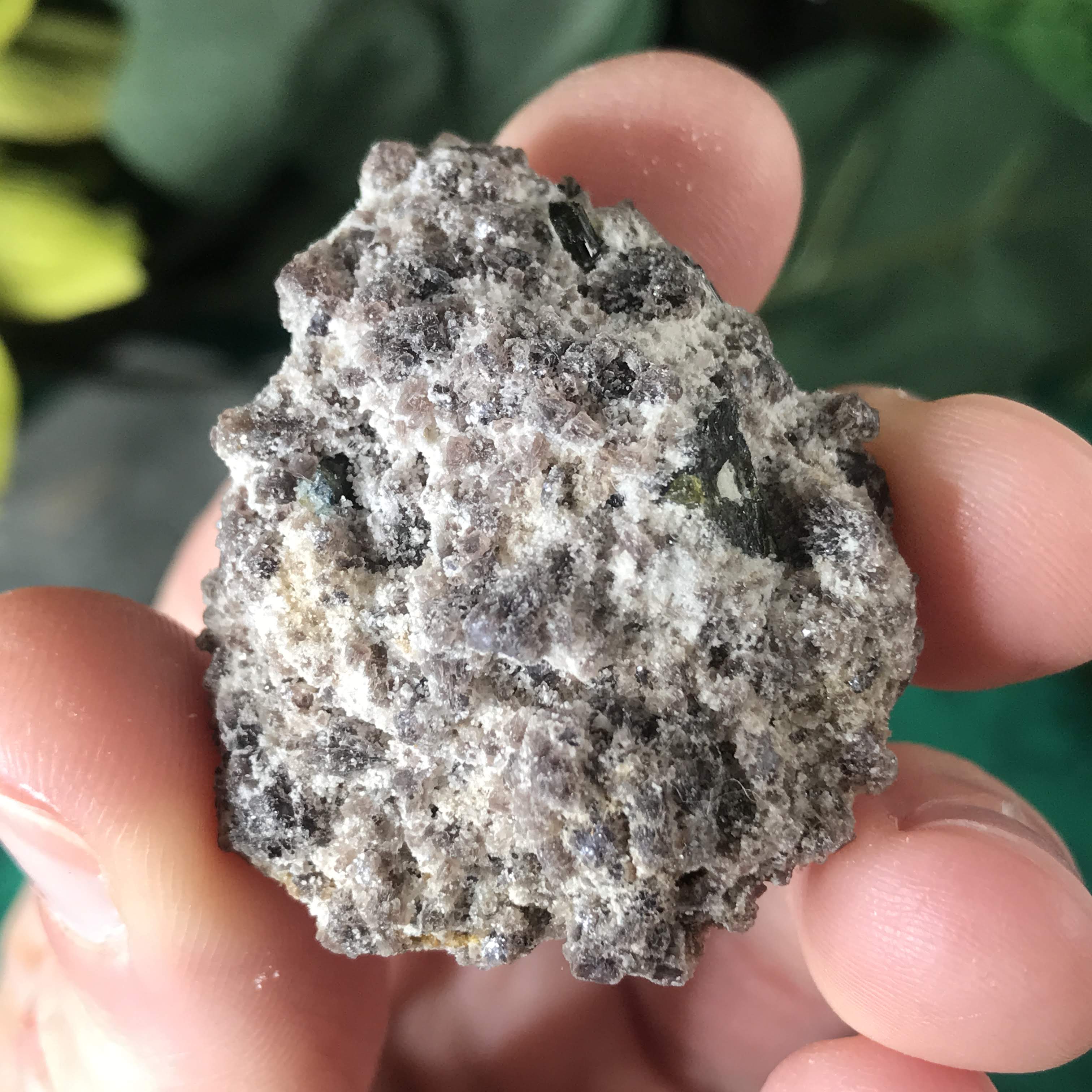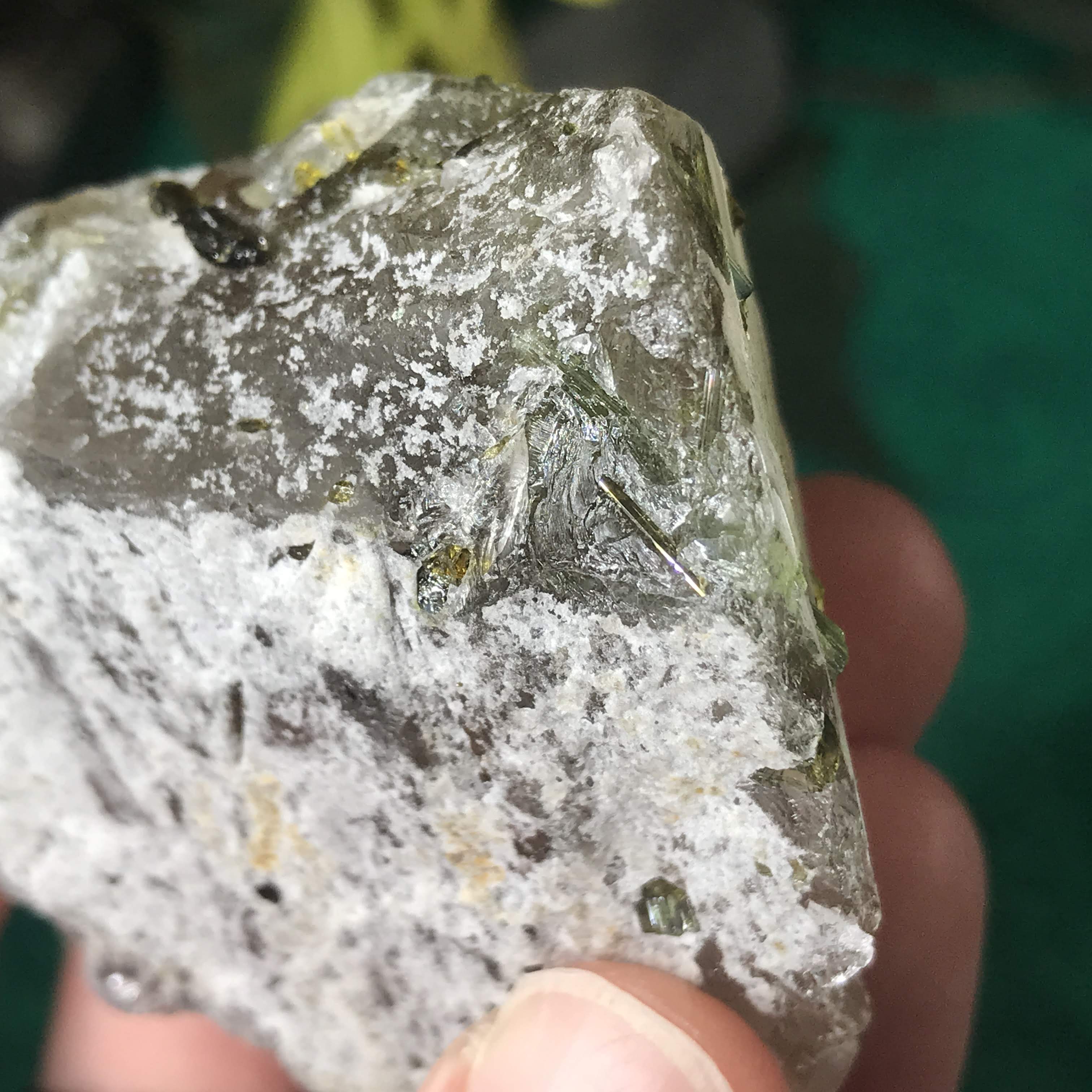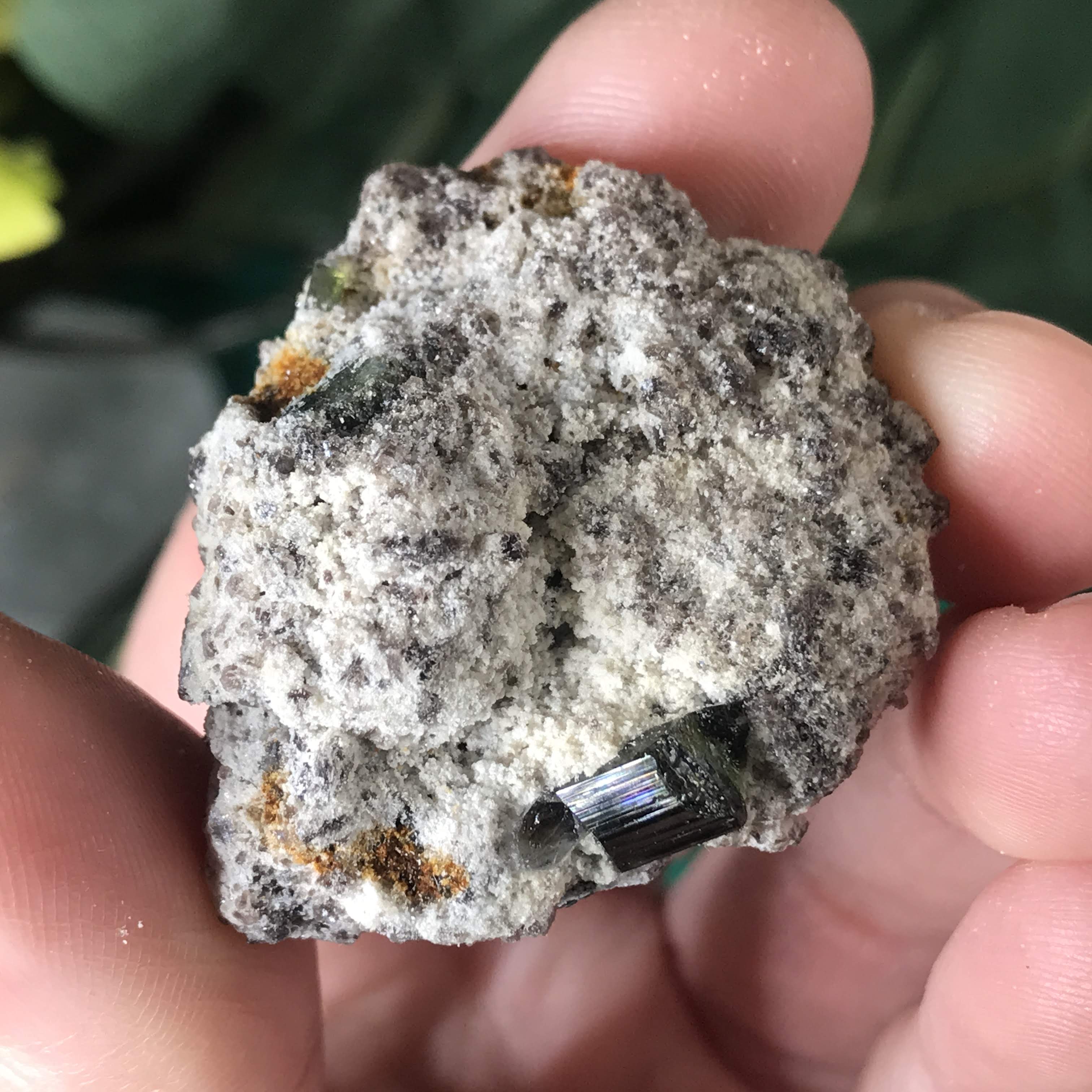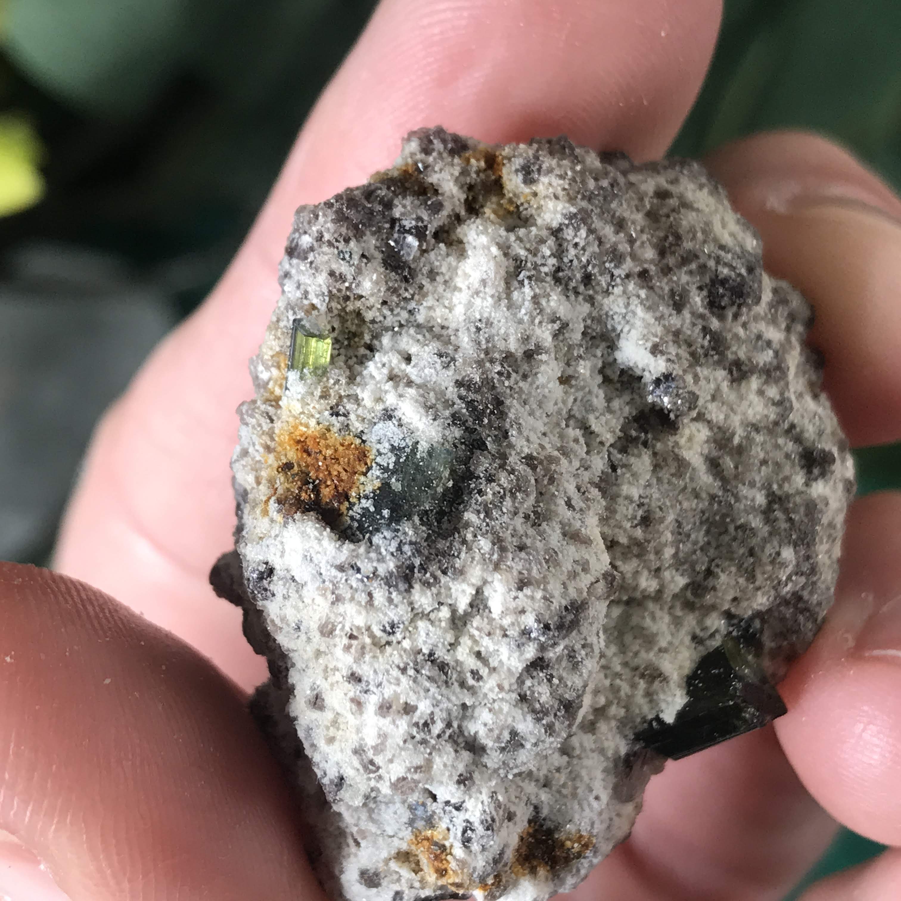 #11 I almost couldn't tell if it was black or green tourmaline because it is SO dark! Looking with a lens it looks like the dust around it is green, so I'm thinking a reaaally dark green tourmaline.