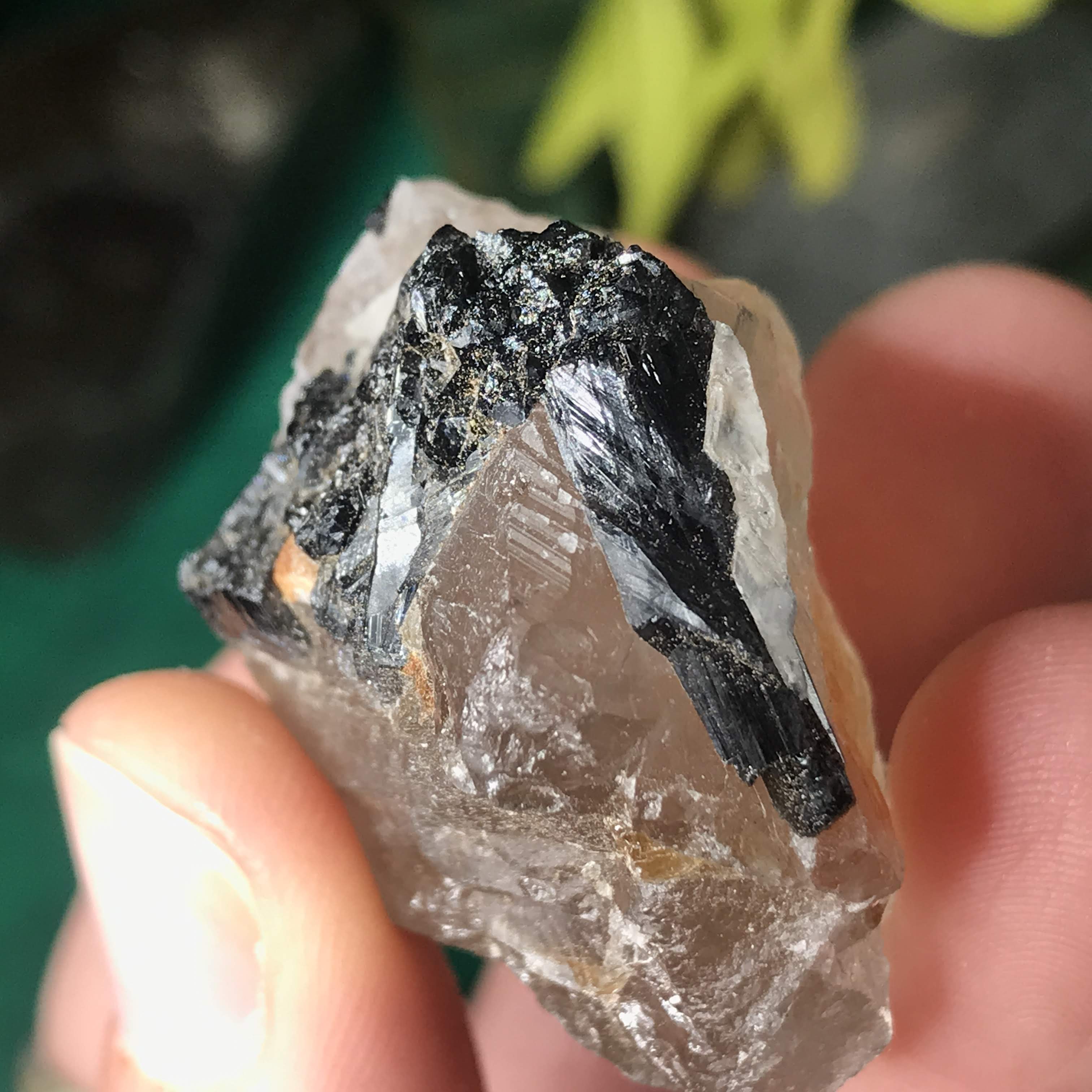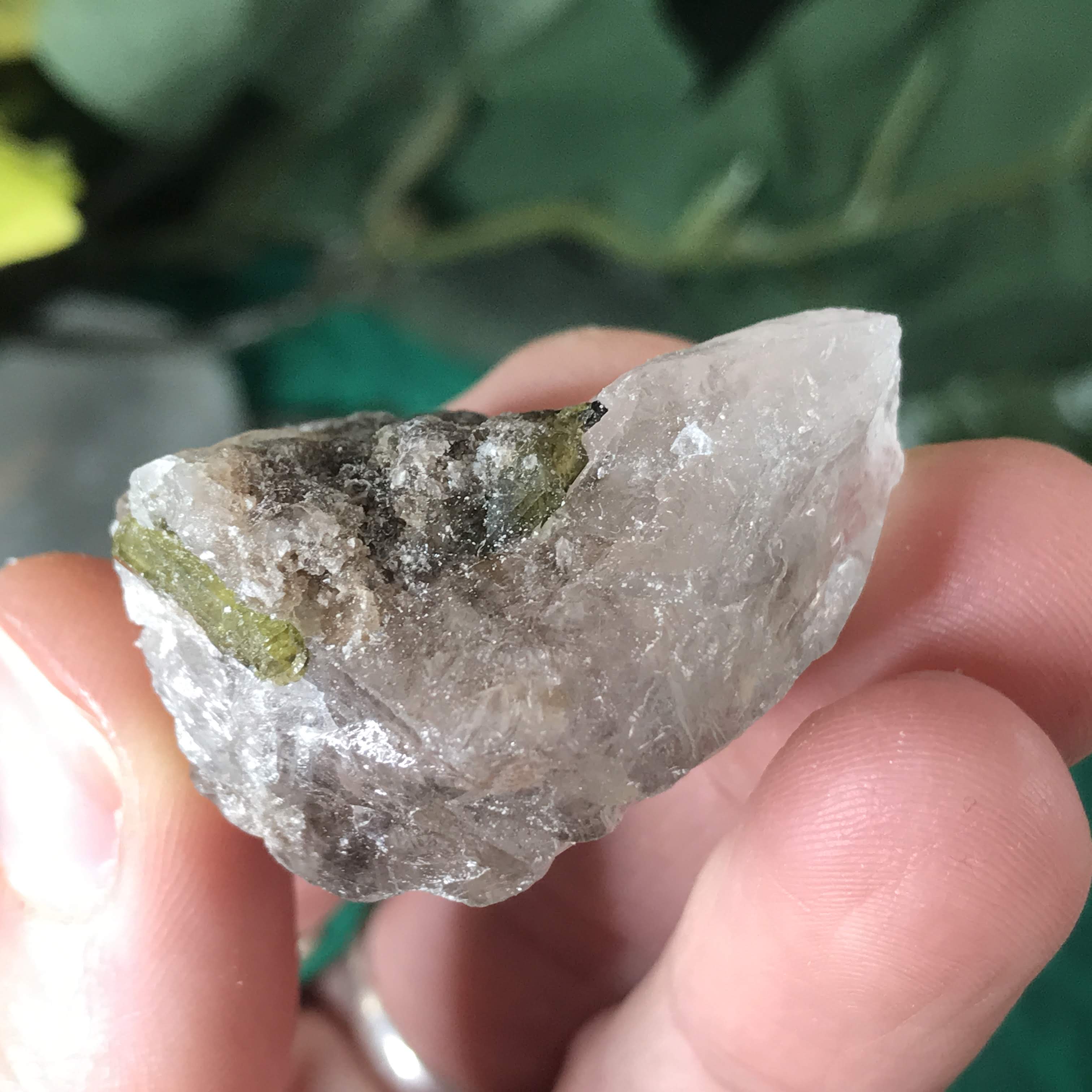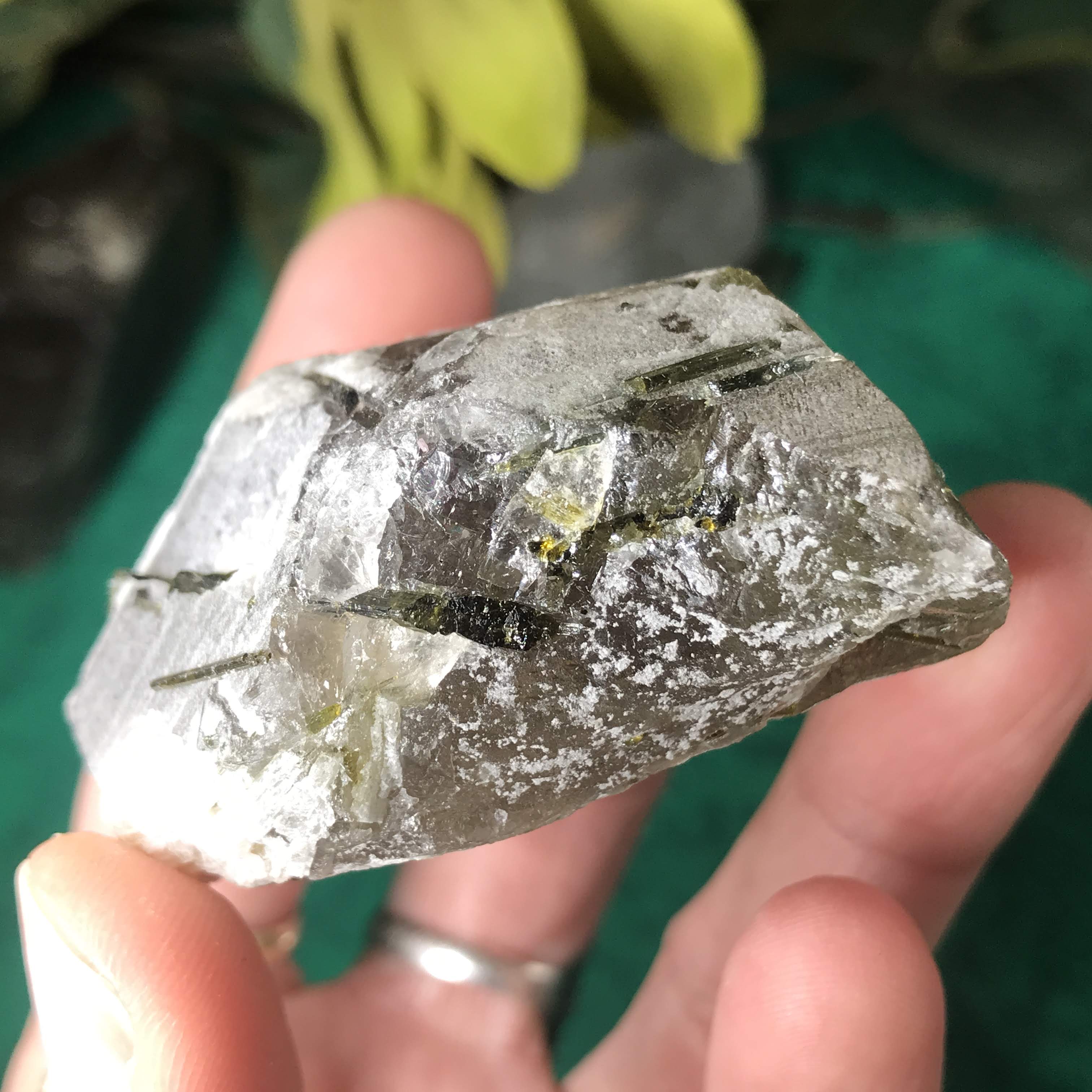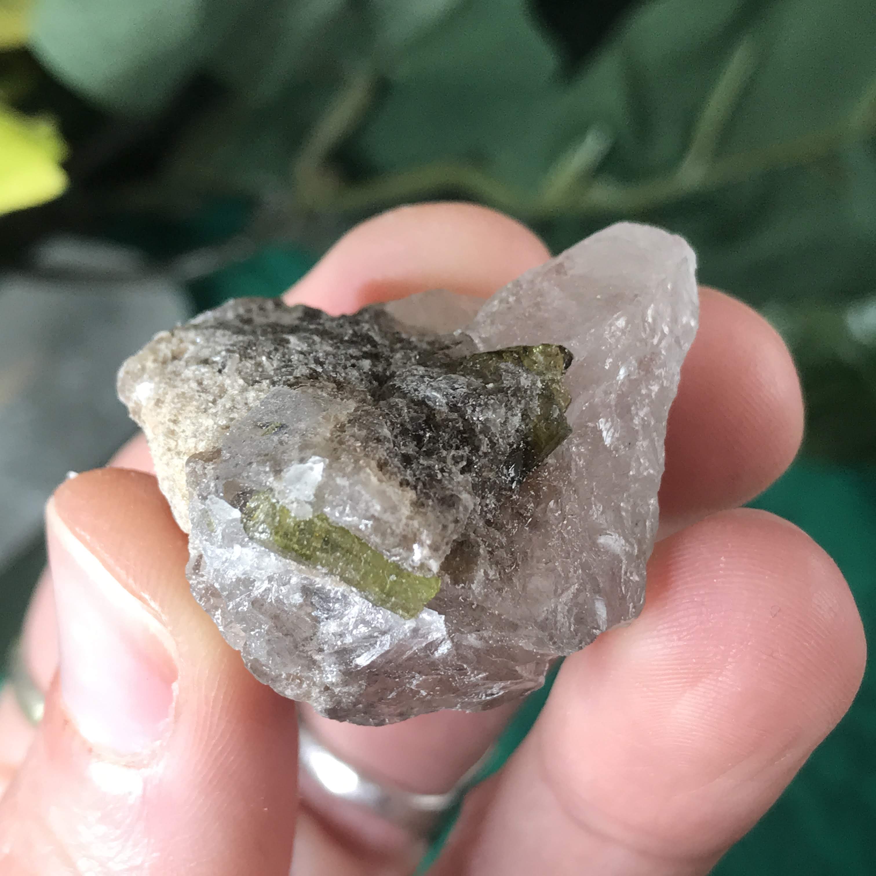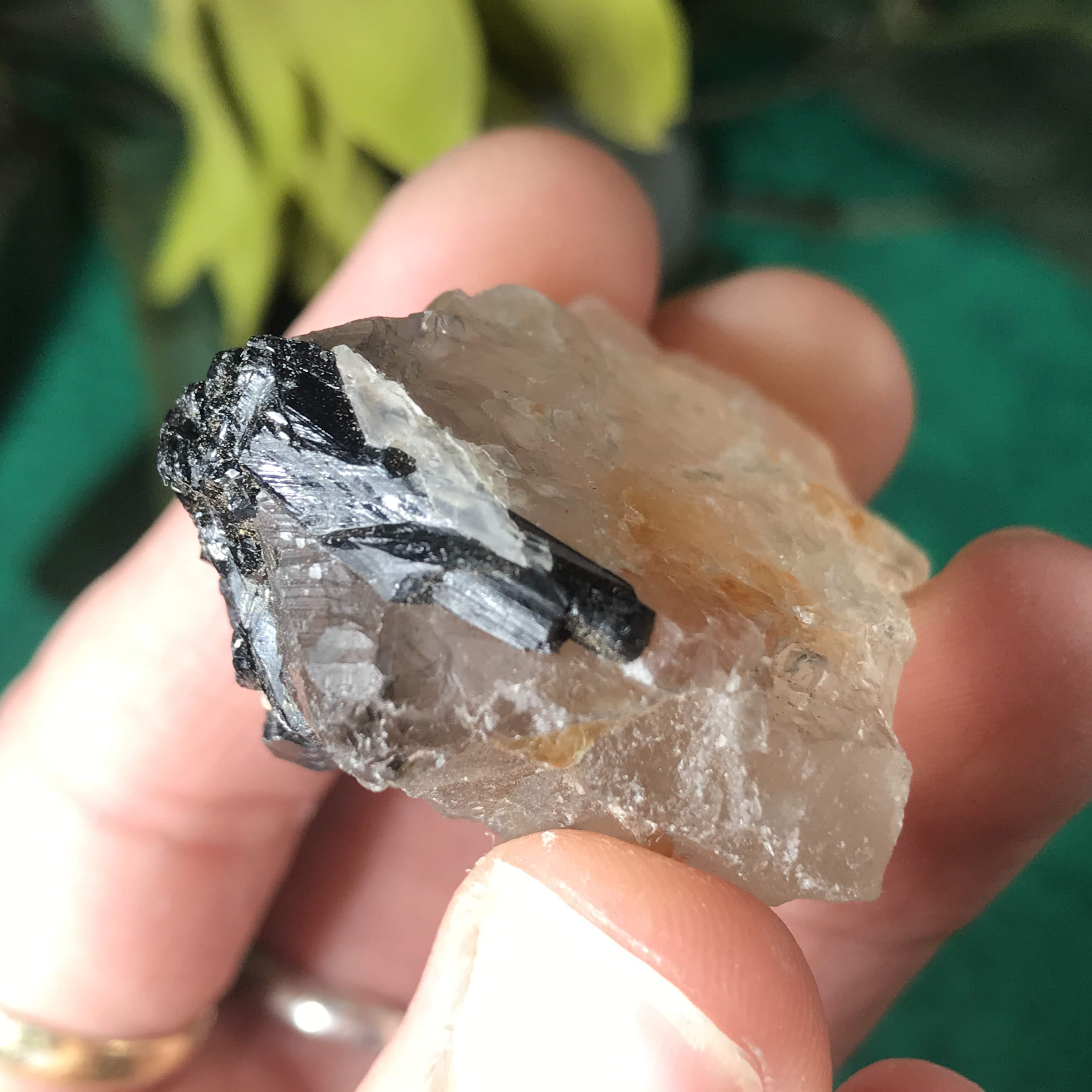 Green Tourmalinated Quartz- Combines the qualities of tourmaline with the qualities of quartz. The quartz (power and wonderful healing crystal!) will amplify the strong properties of the tourmaline. With it being smokey quartz it will also help with grounding, shielding, detoxing negative & dense energies, and helping with an uplift.