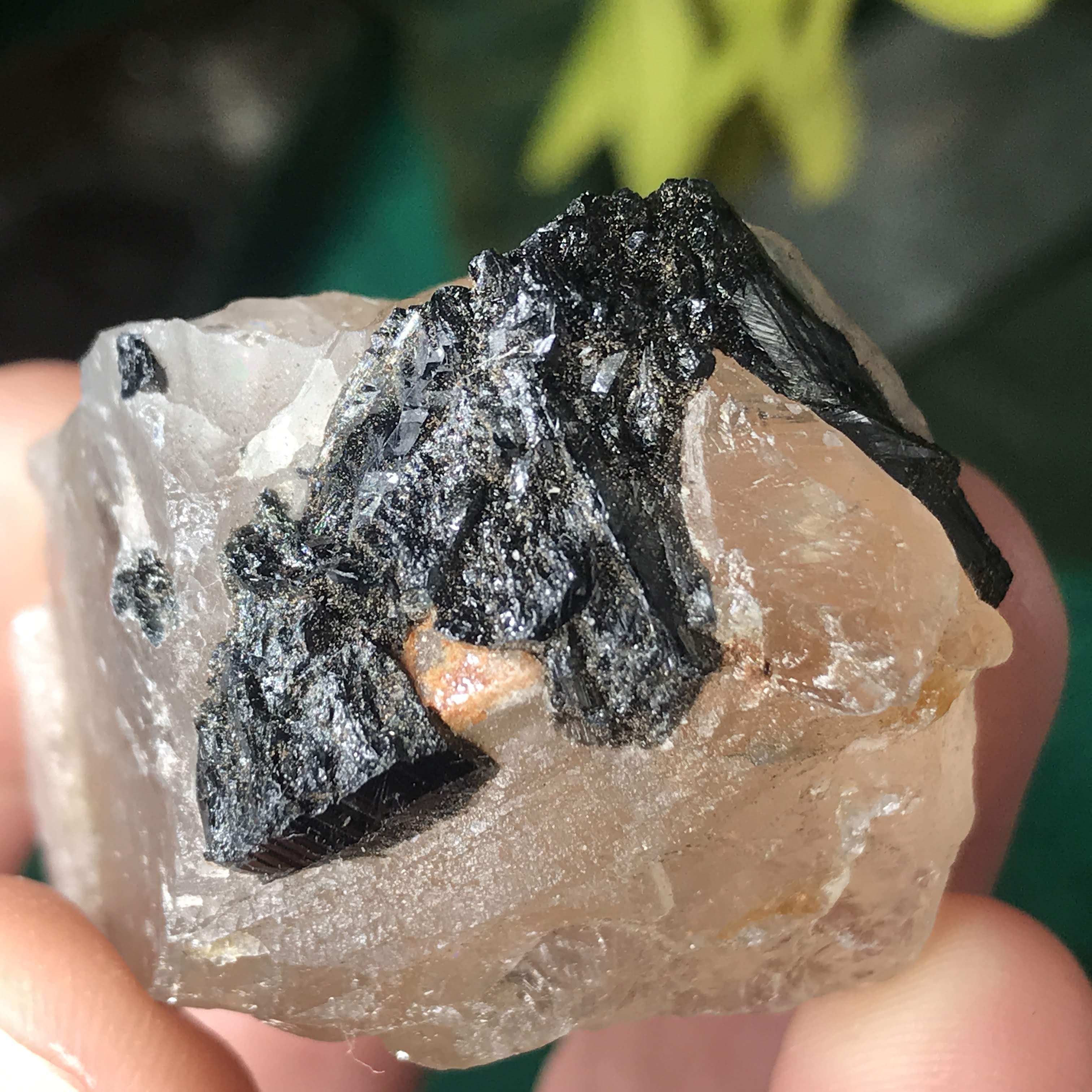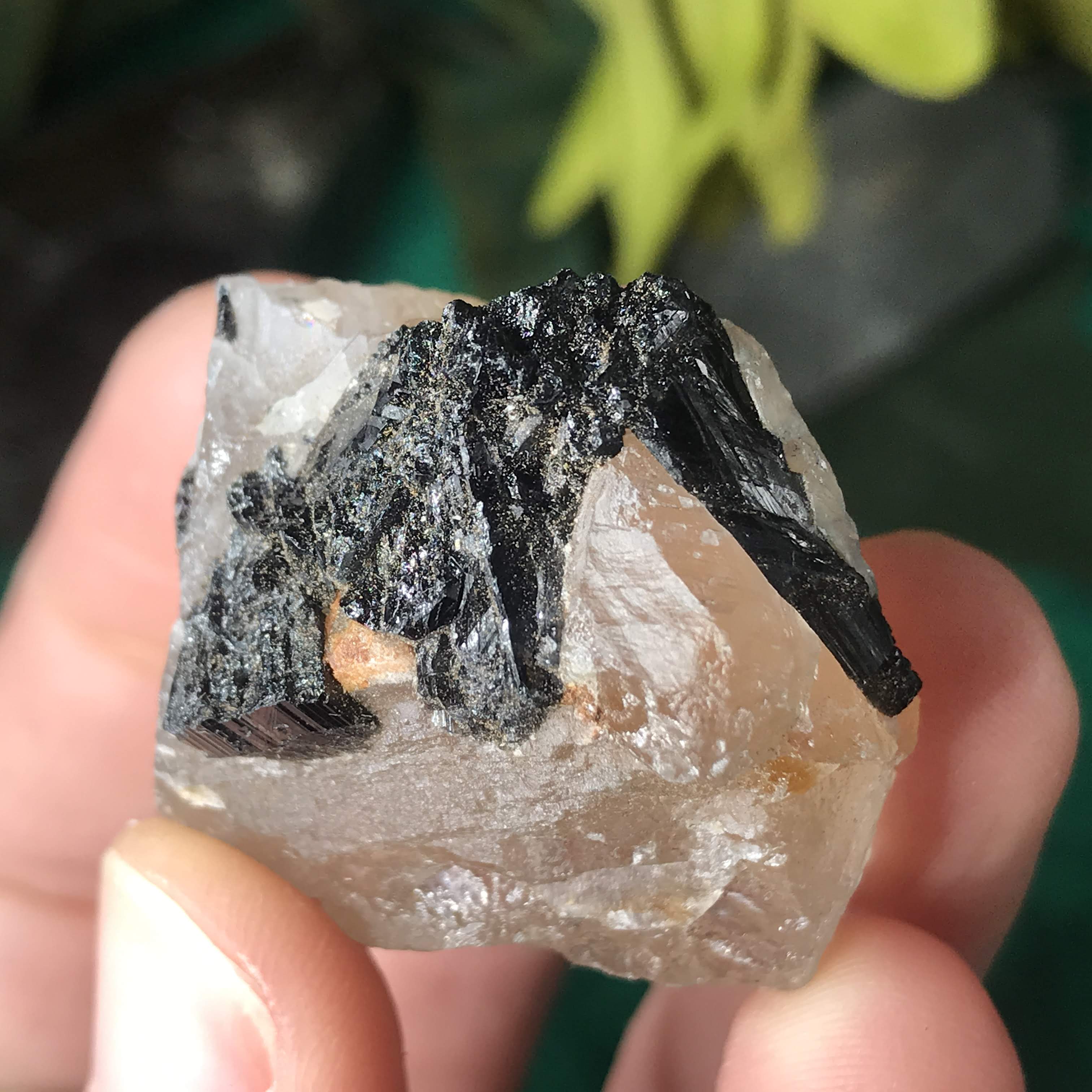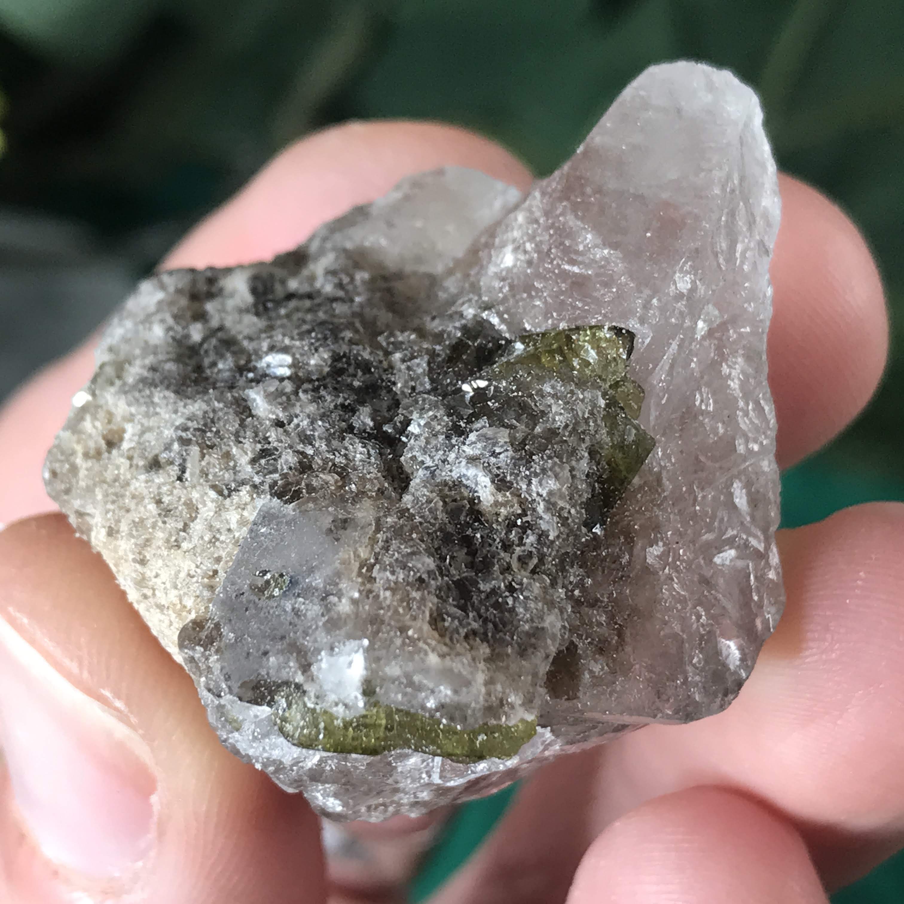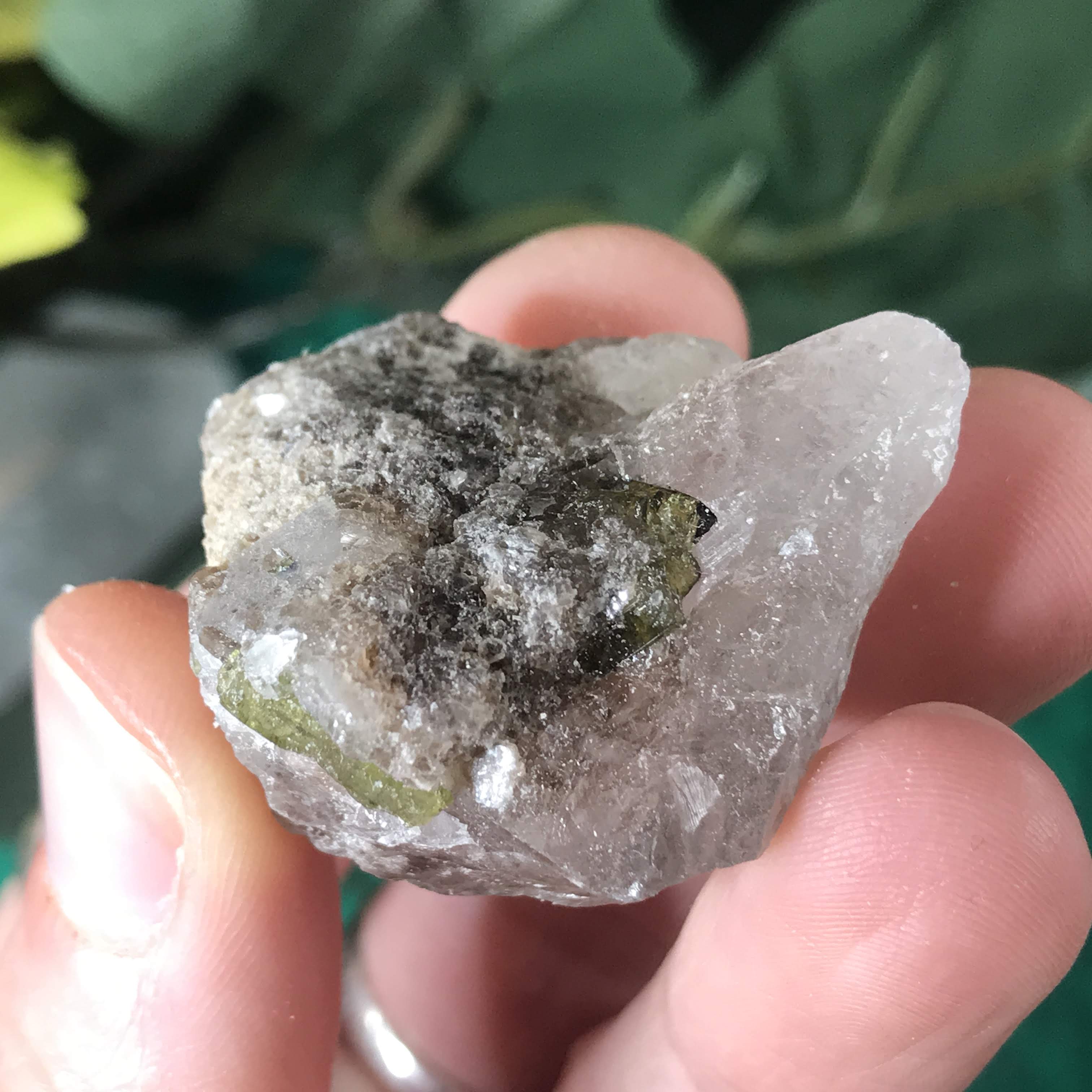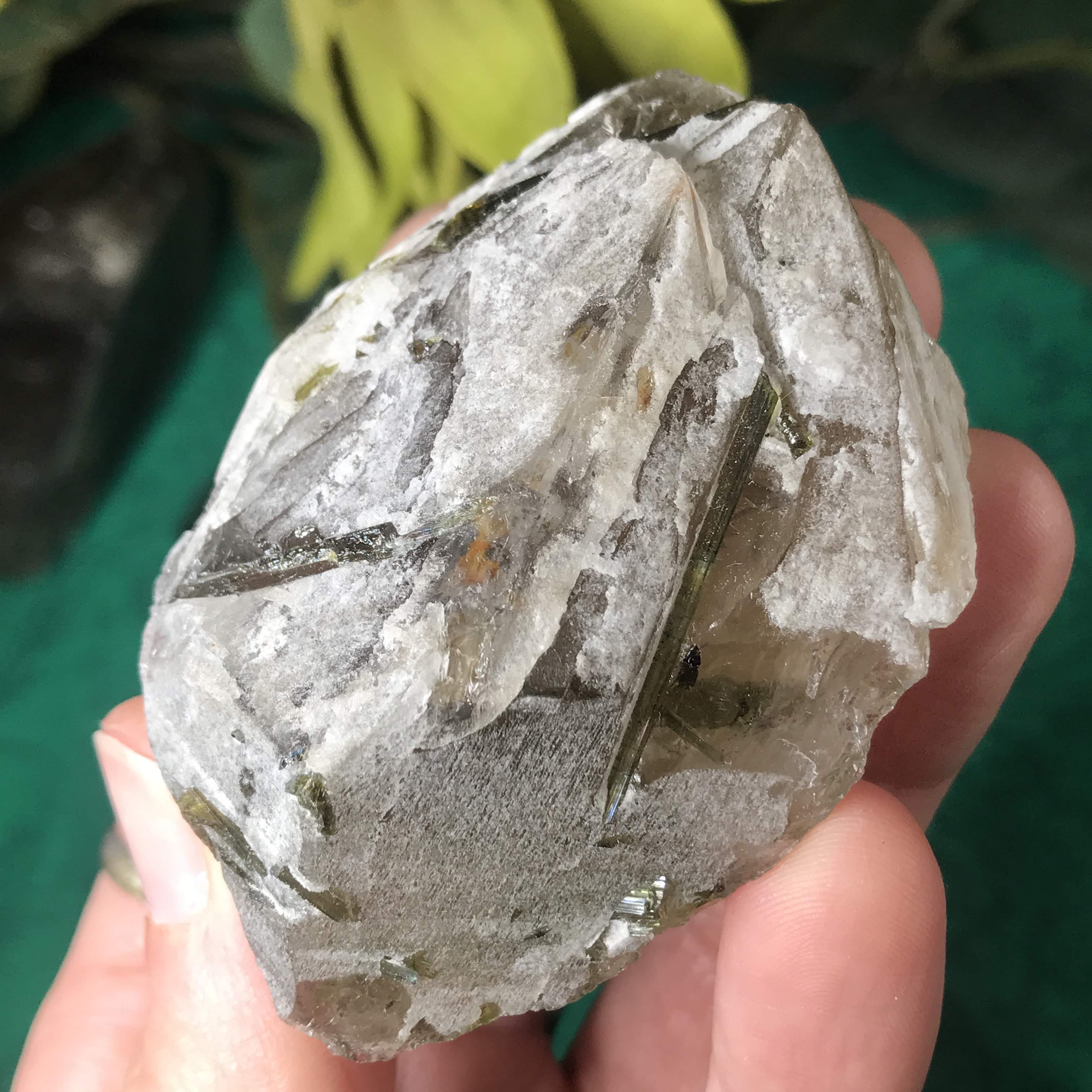 Green Tourmalinated Quartz- Combines the qualities of tourmaline with the qualities of quartz. The quartz (power and wonderful healing crystal!) will amplify the strong properties of the tourmaline. With it being smokey quartz it will also help with grounding, shielding, detoxing negative & dense energies, and helping with an uplift.