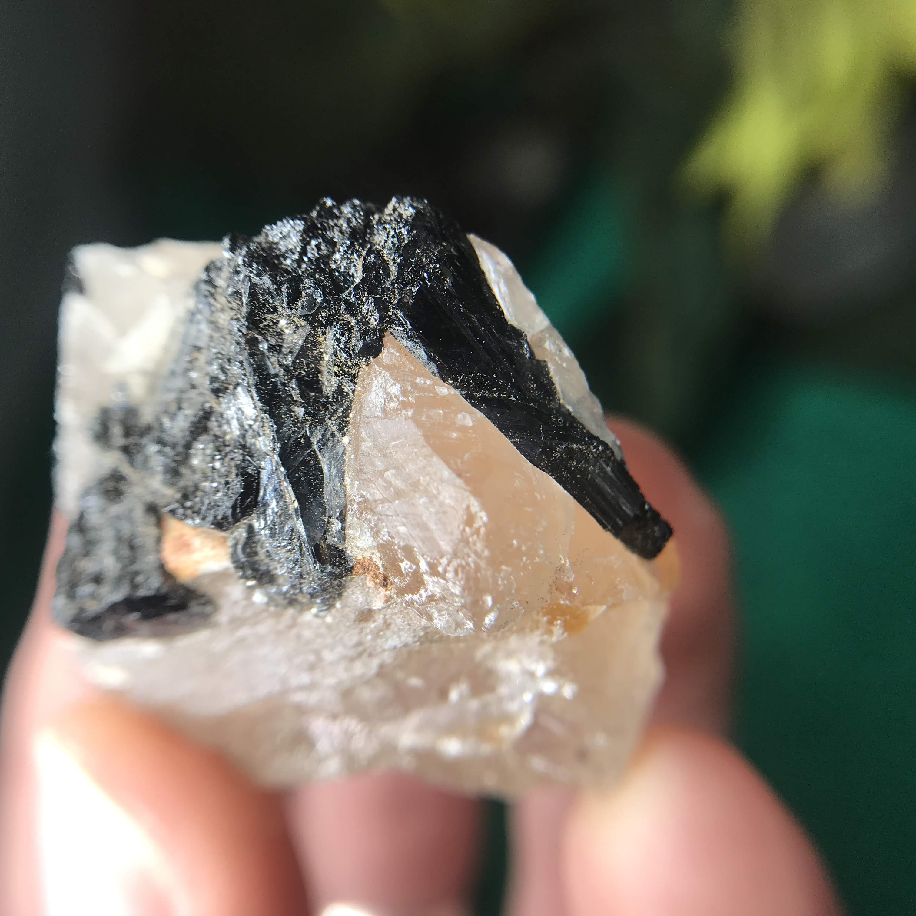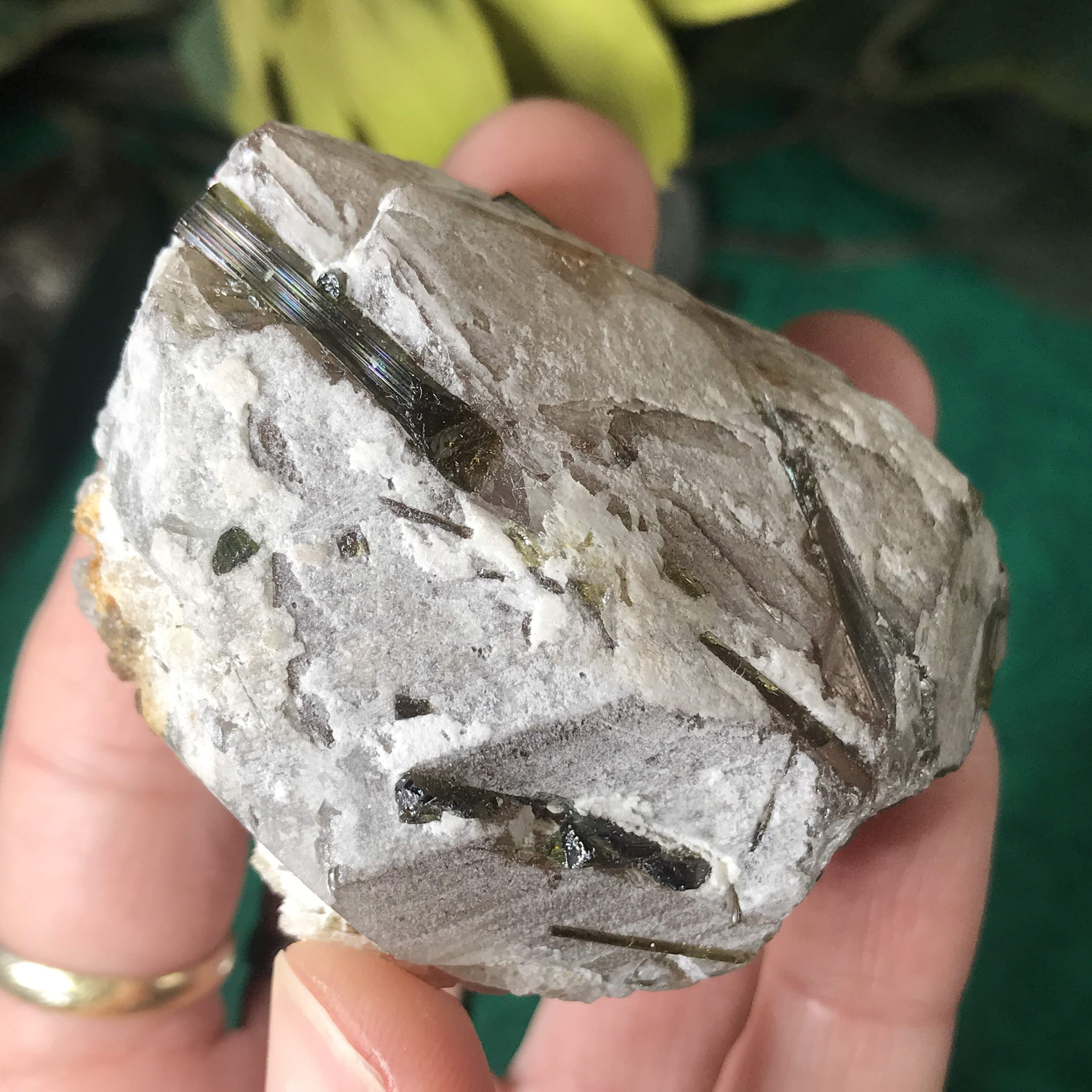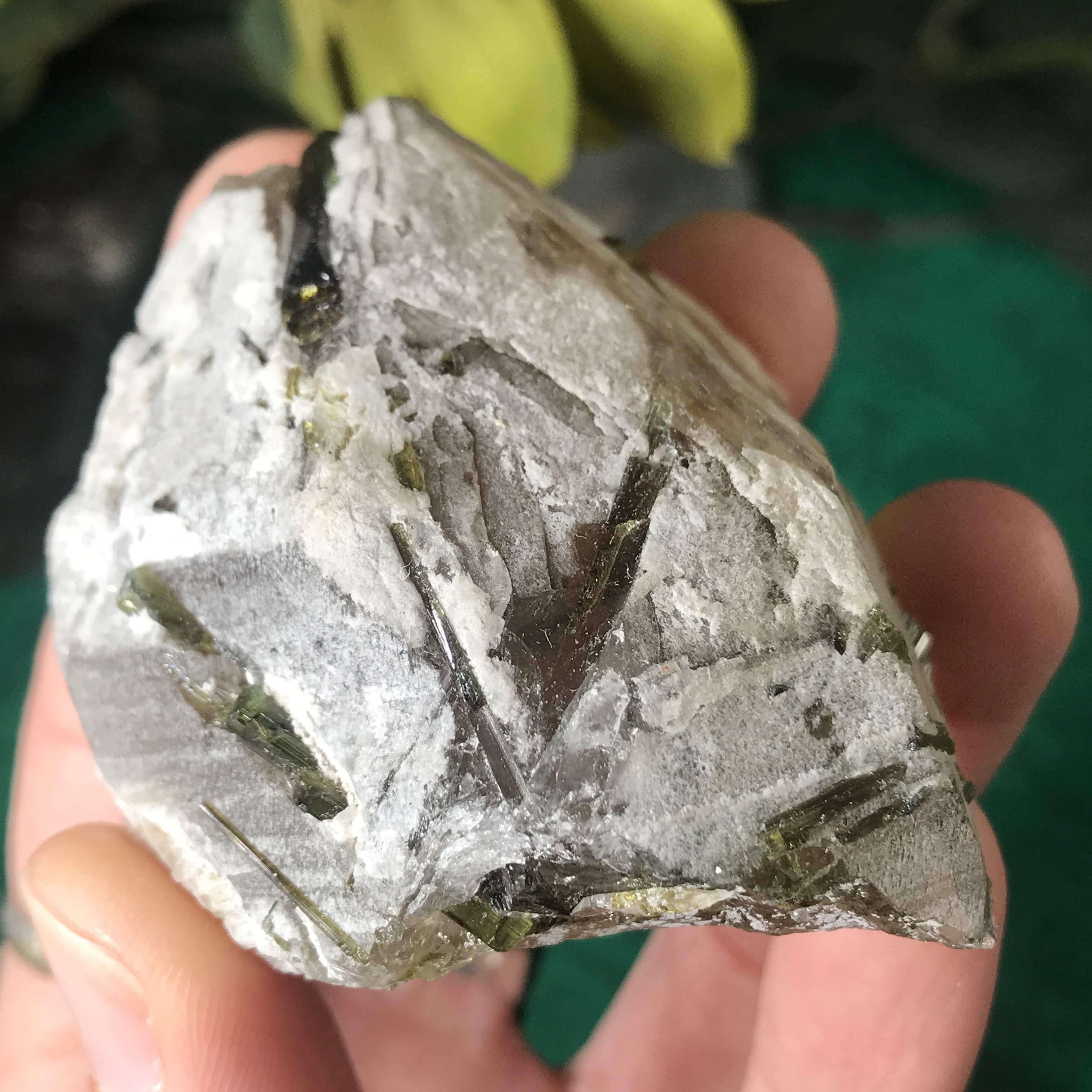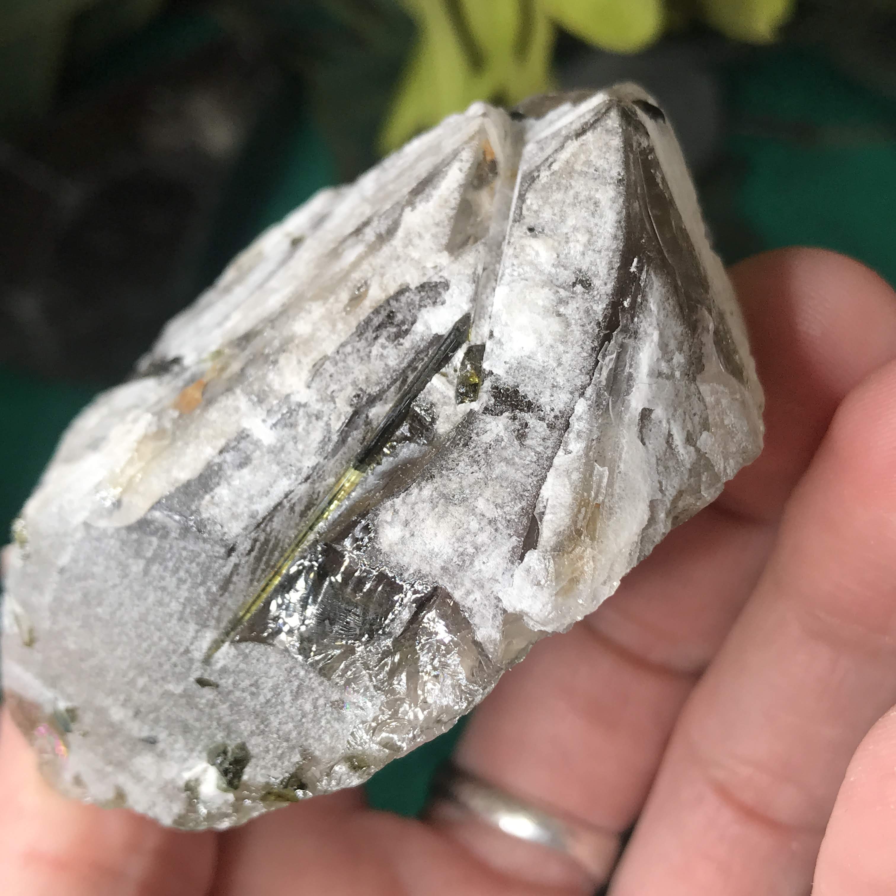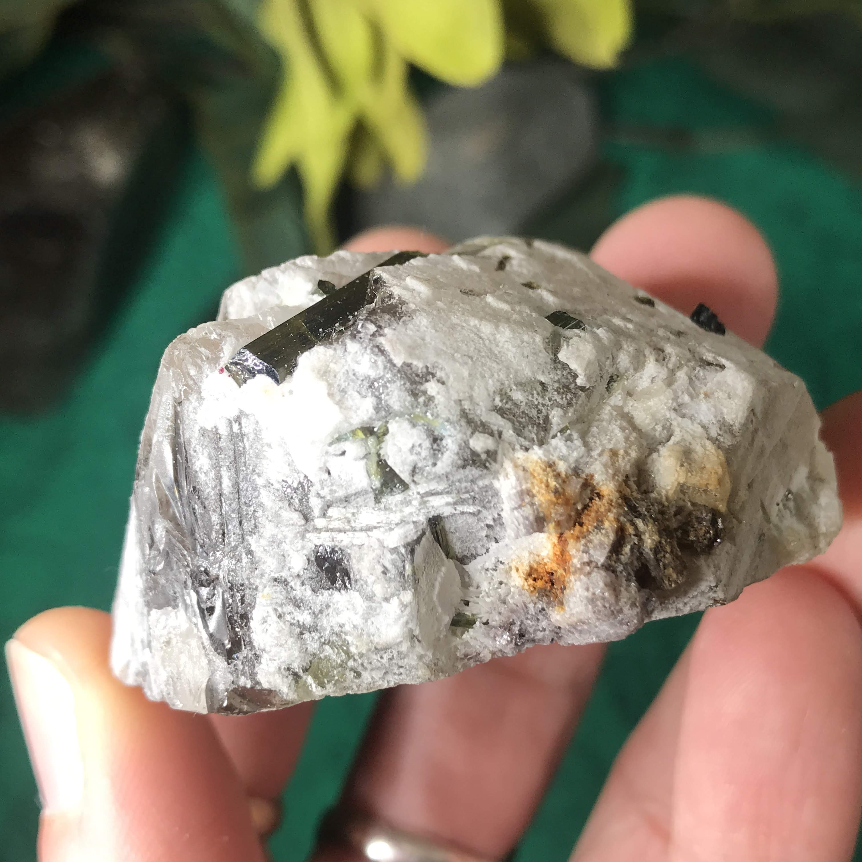 Green Tourmalinated Quartz- Combines the qualities of tourmaline with the qualities of quartz. The quartz (power and wonderful healing crystal!) will amplify the strong properties of the tourmaline. With it being smokey quartz it will also help with grounding, shielding, detoxing negative & dense energies, and helping with an uplift.