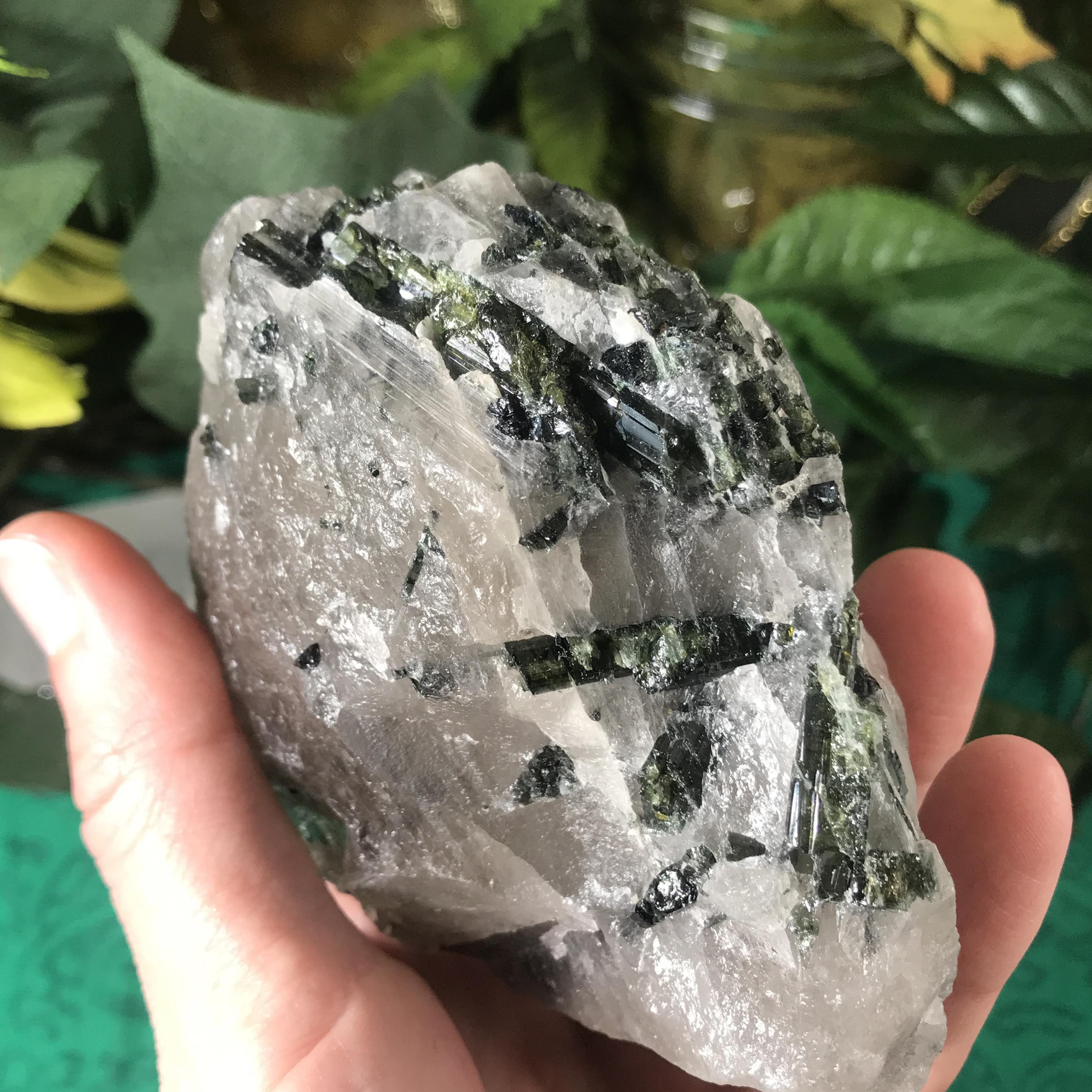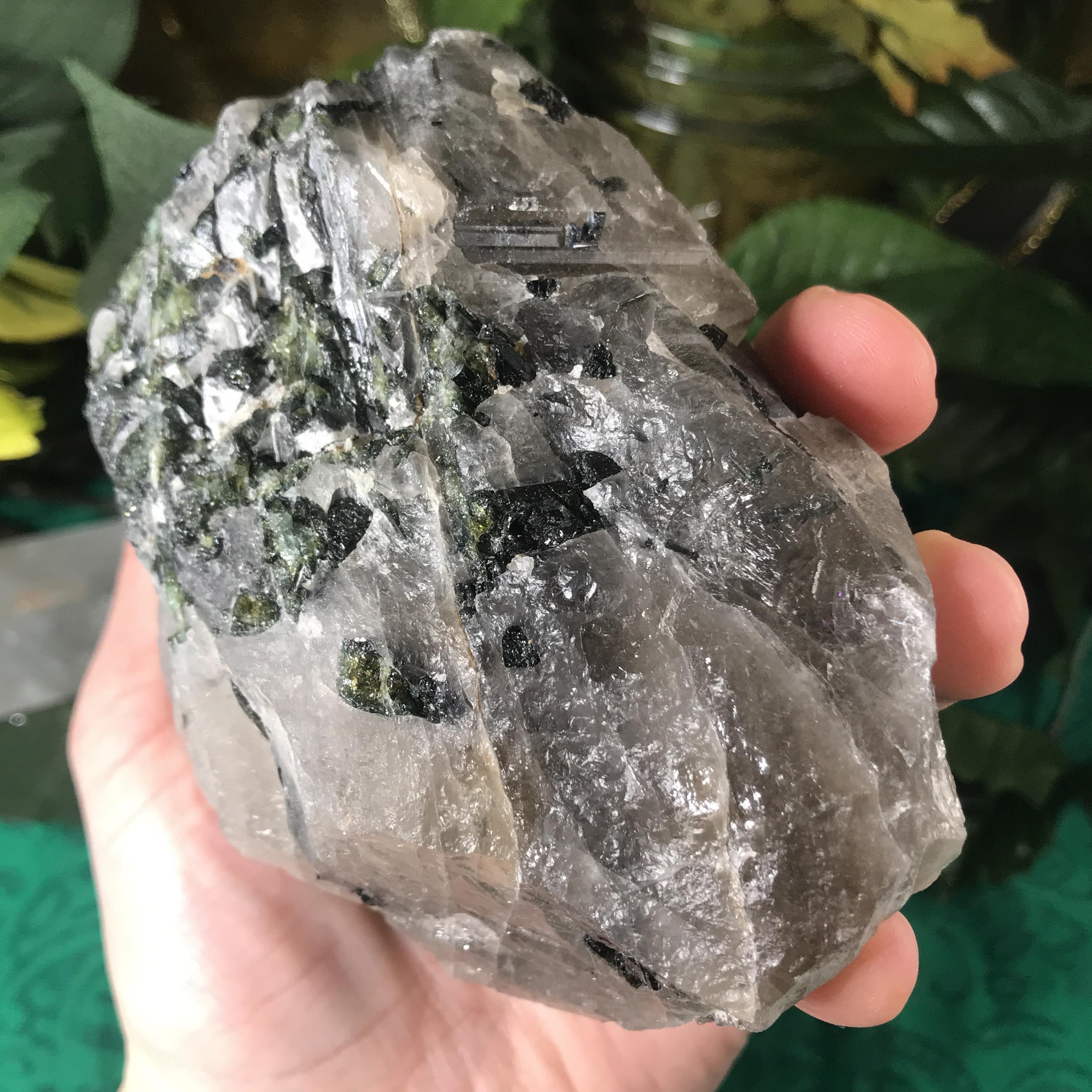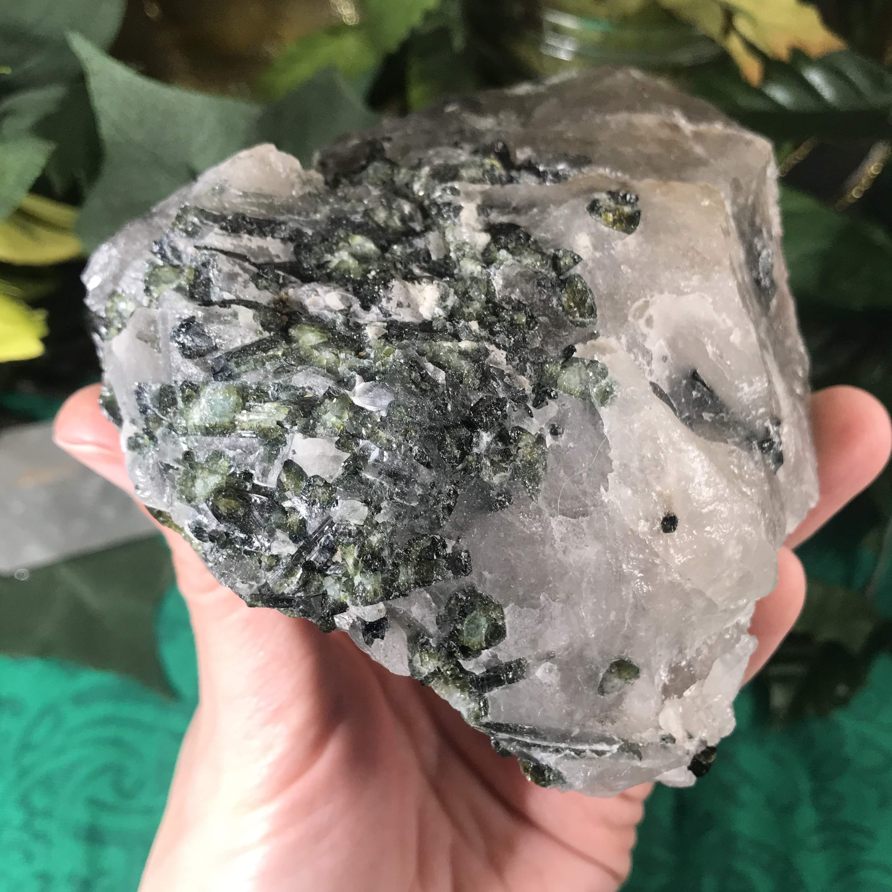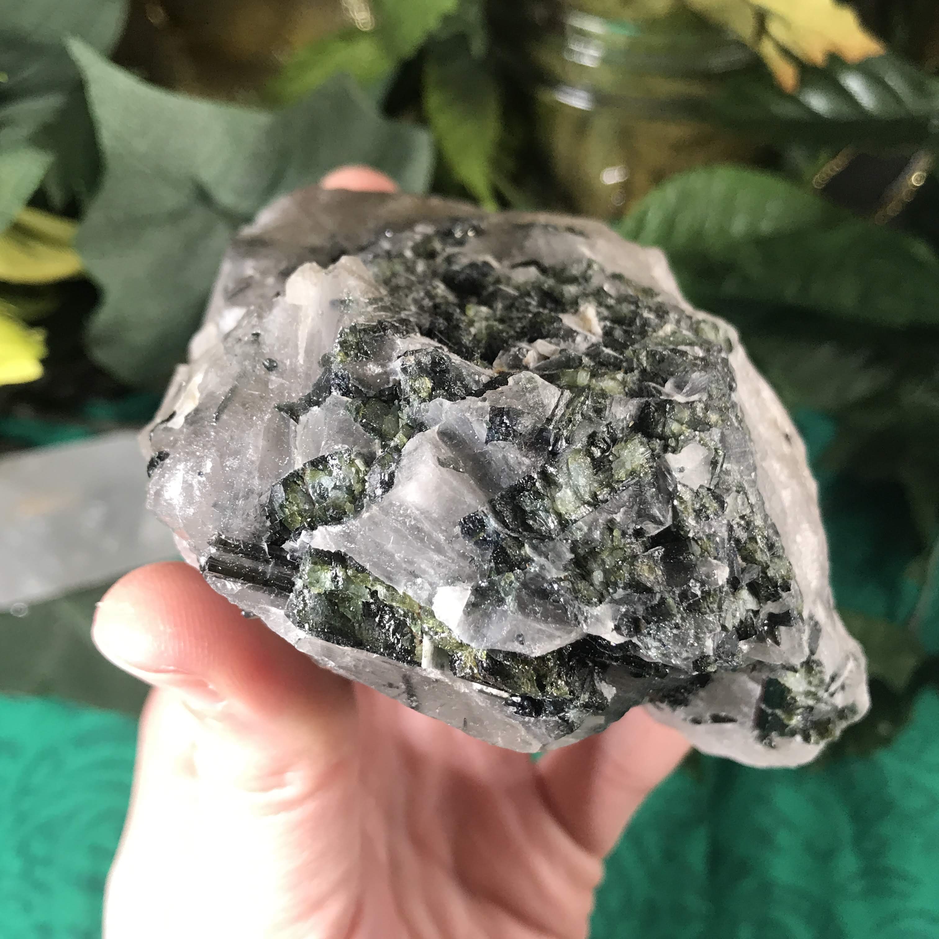 Green Tourmalinated Quartz- Combines the qualities of tourmaline with the qualities of quartz. The quartz (power and wonderful healing crystal!) will amplify the strong properties of the tourmaline. With it being smokey quartz it will also help with grounding, shielding, detoxing negative & dense energies, and helping with an uplift.