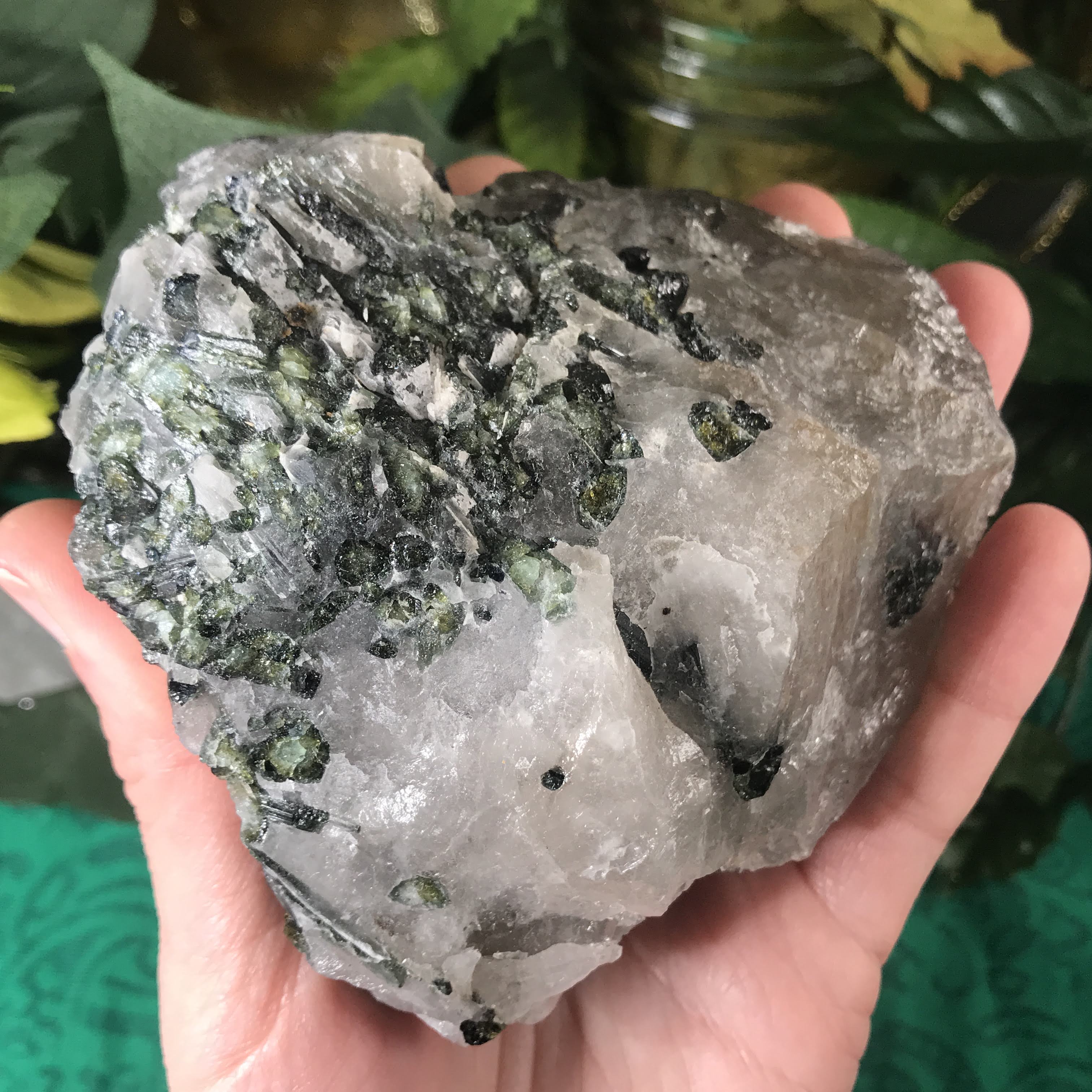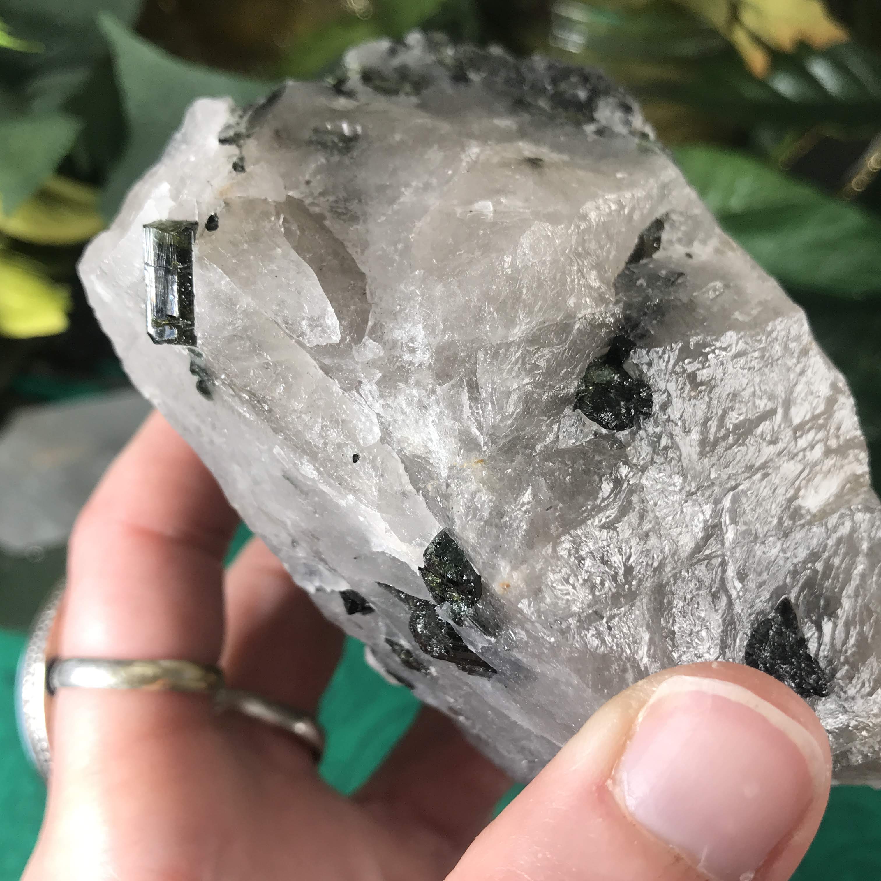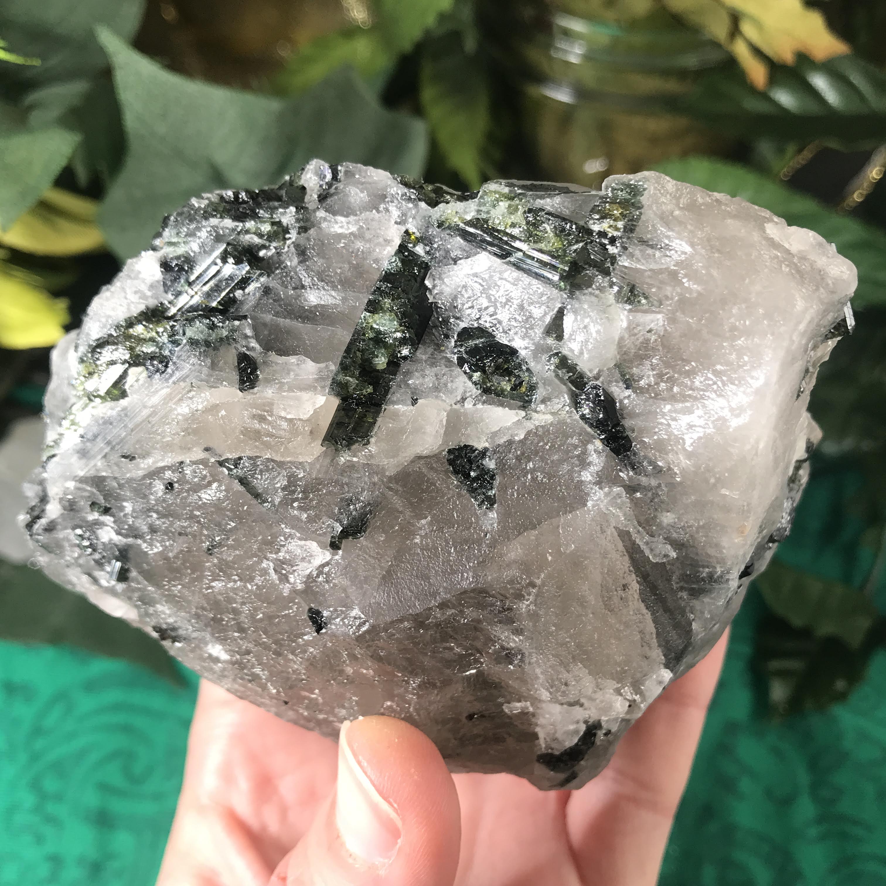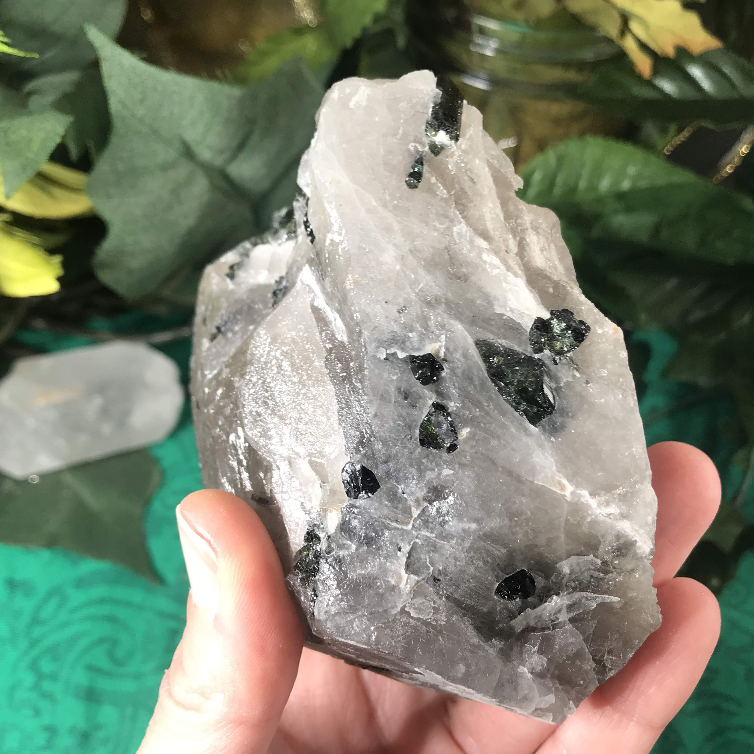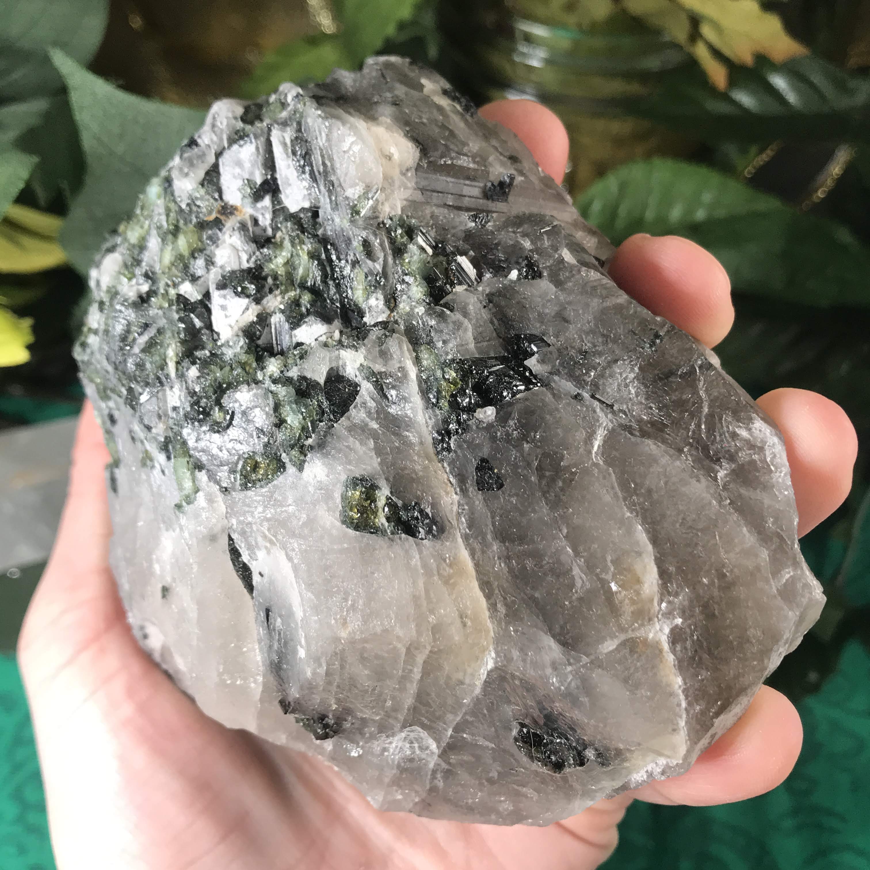 Green Tourmalinated Quartz- Combines the qualities of tourmaline with the qualities of quartz. The quartz (power and wonderful healing crystal!) will amplify the strong properties of the tourmaline. With it being smokey quartz it will also help with grounding, shielding, detoxing negative & dense energies, and helping with an uplift.