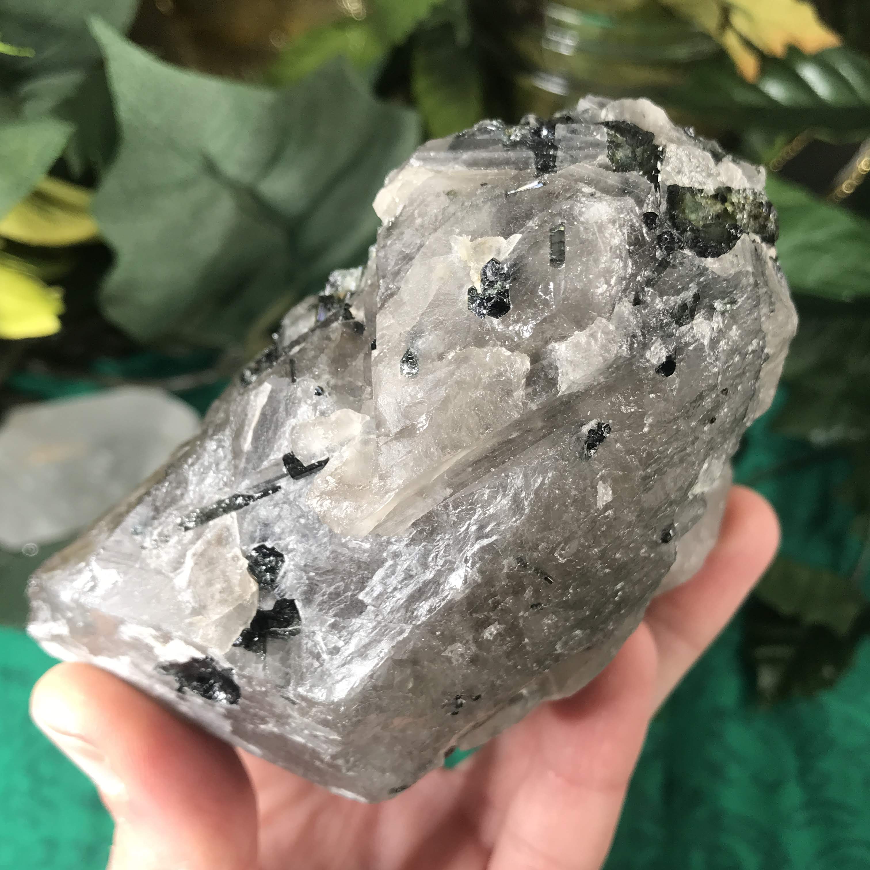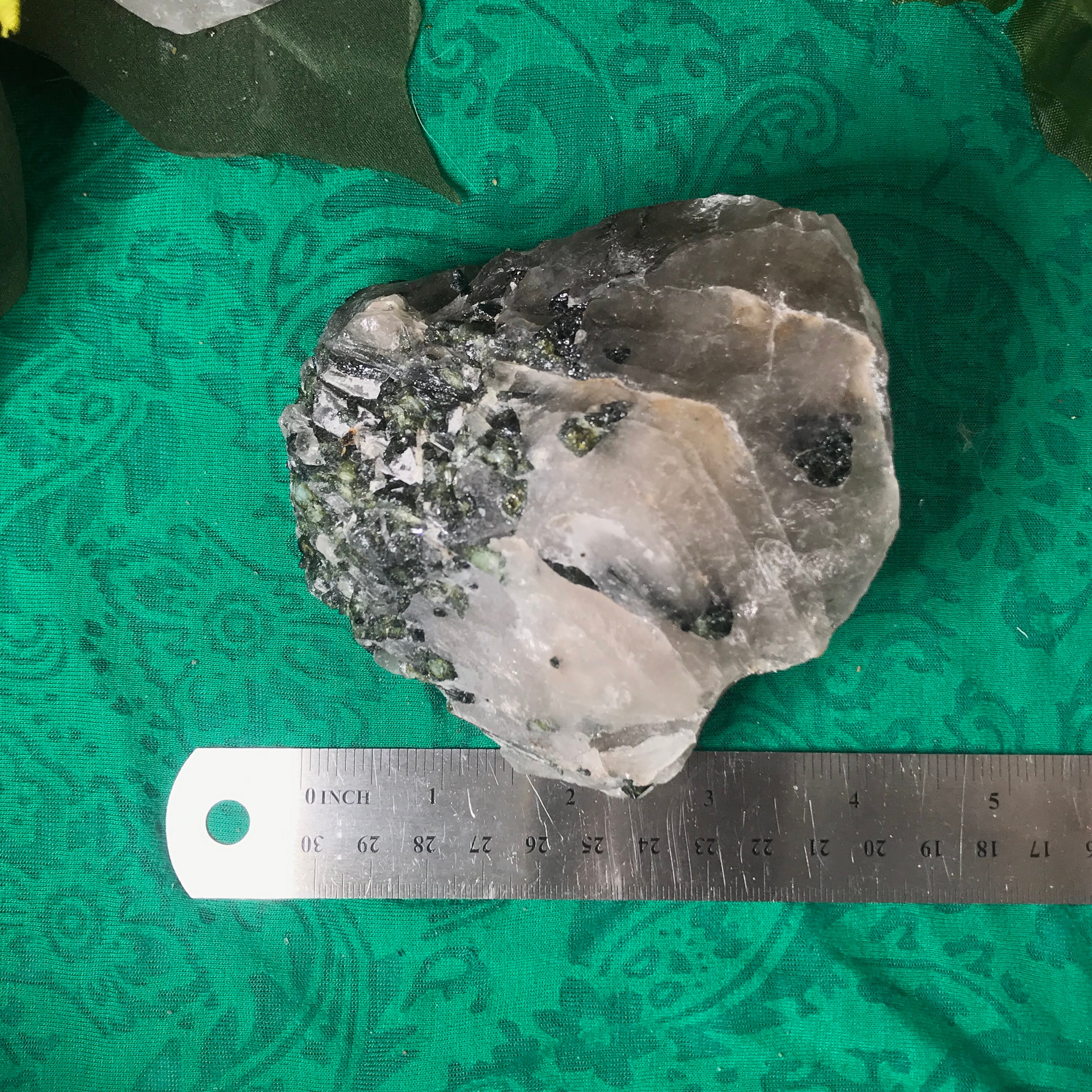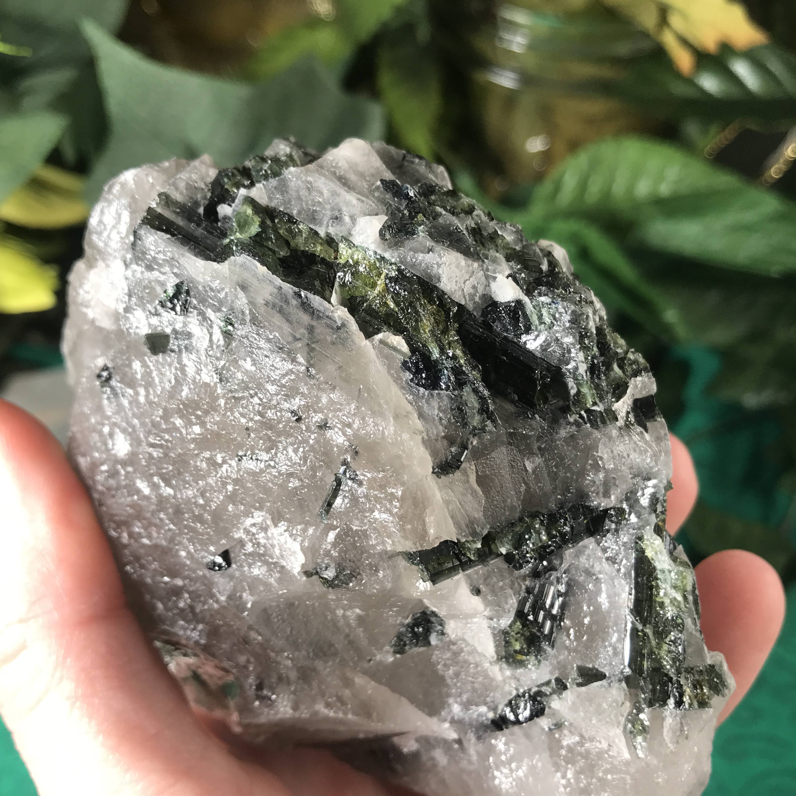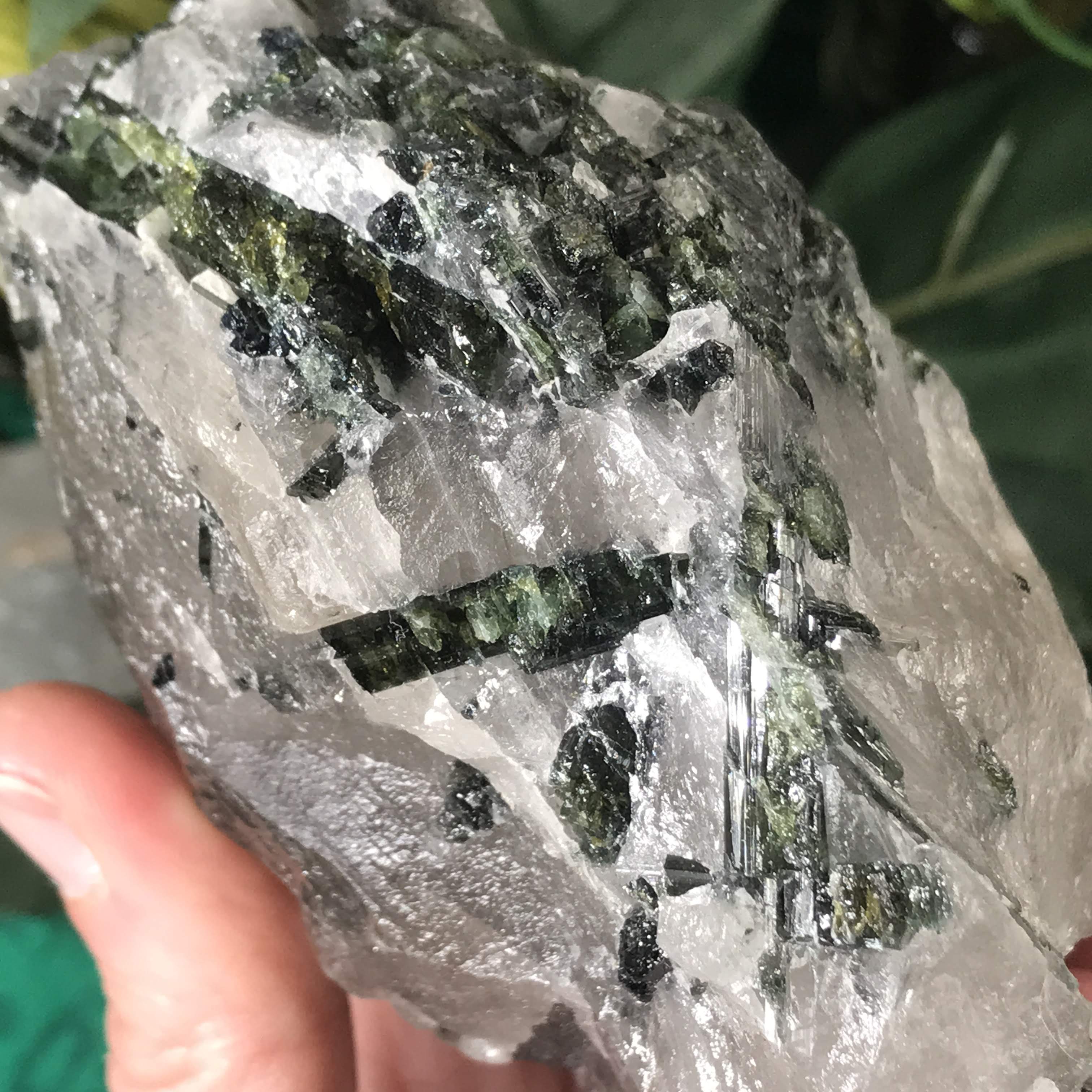 Green Tourmalinated Quartz- Combines the qualities of tourmaline with the qualities of quartz. The quartz (power and wonderful healing crystal!) will amplify the strong properties of the tourmaline. With it being smokey quartz it will also help with grounding, shielding, detoxing negative & dense energies, and helping with an uplift.