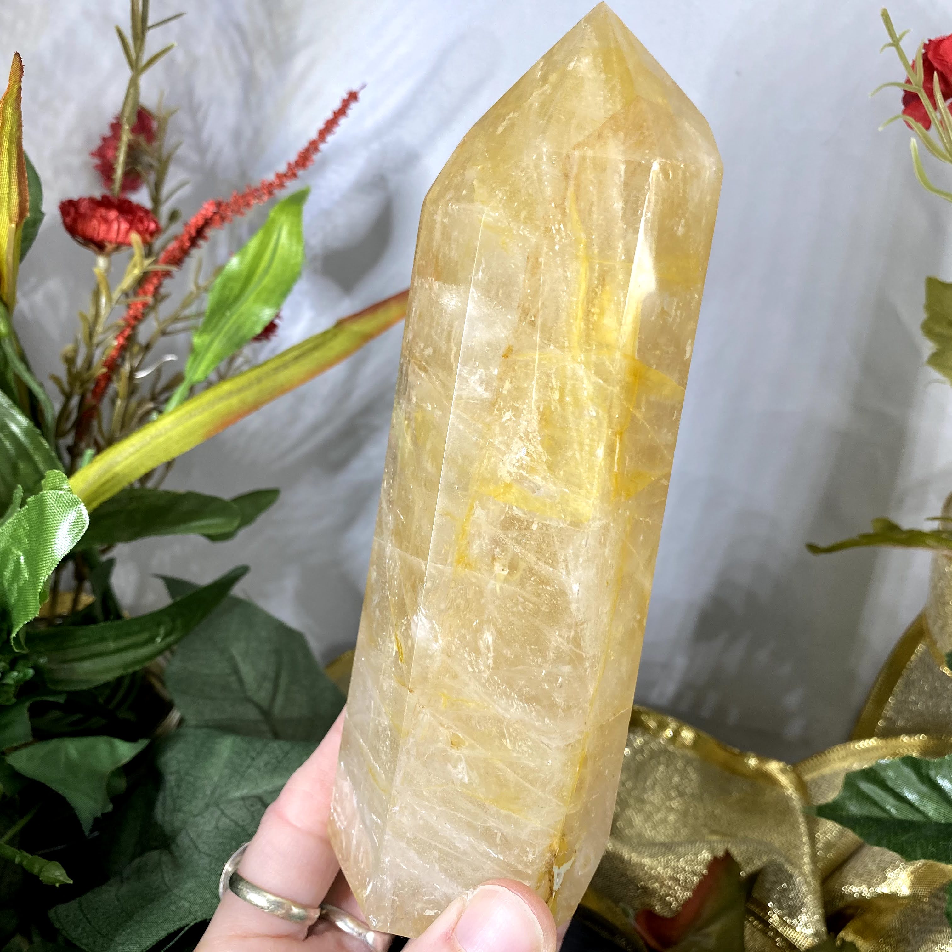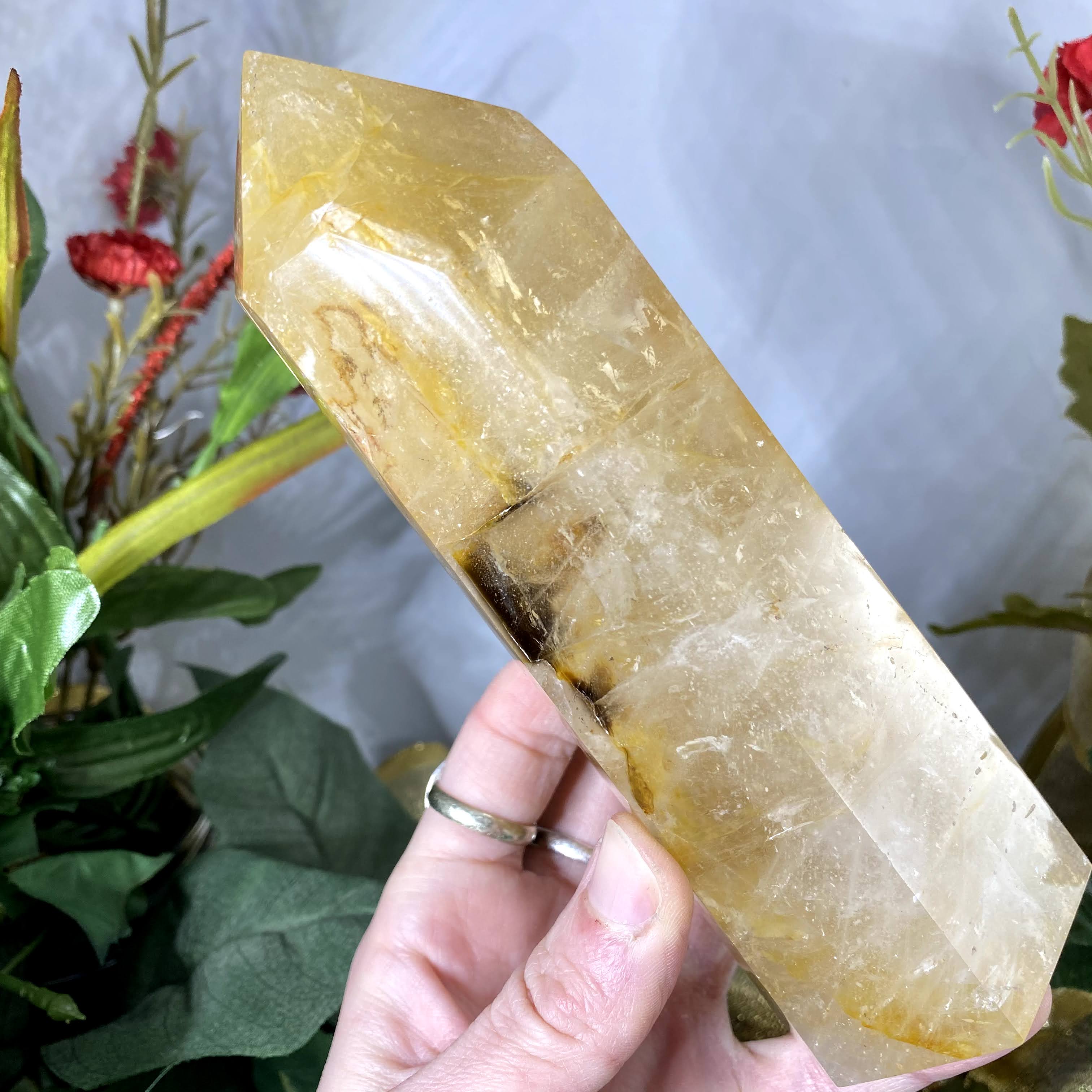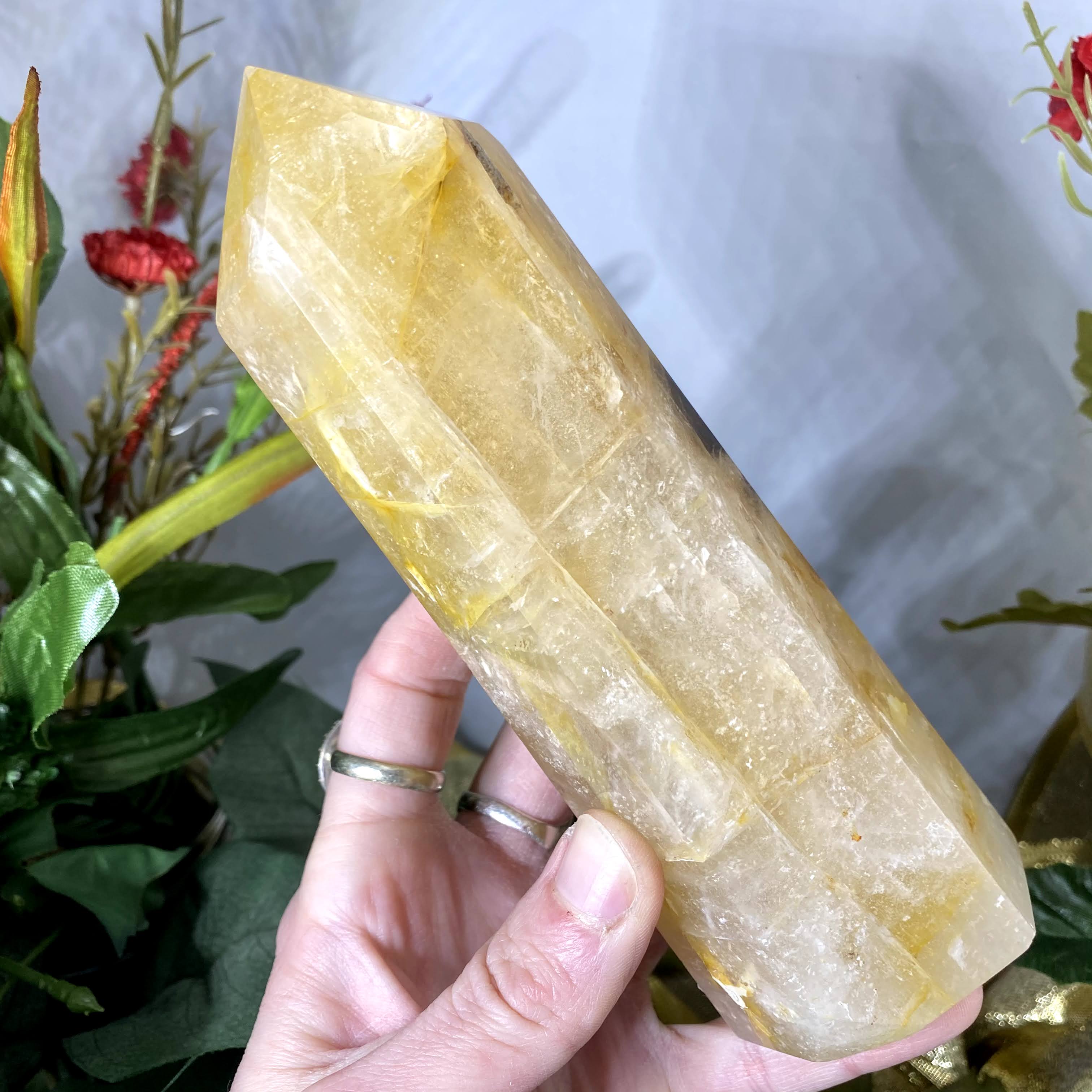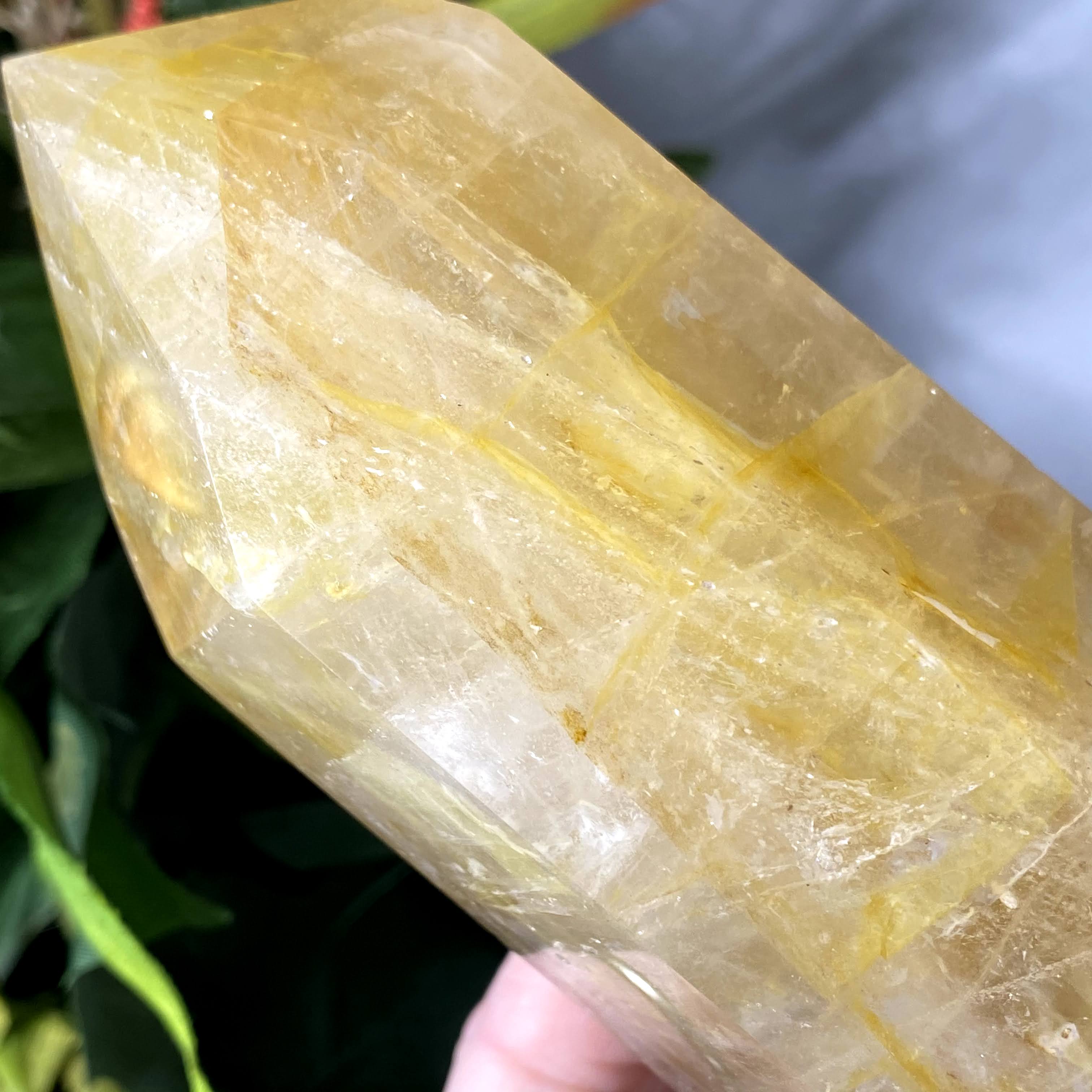 What a golden beauty!. A nice big golden healer tower that feels so good in my hands I don't want to put it down! Great to hold and for a space or grid (power grid!!!!). These golden layers are so easy to get hypnotized by. There is a noticeable lil hole towards the top, I honestly can't tell if it's a natural hole or chipped, see the video for the reference there. Either way it is an incredible additional to a collection or healing toolbox! I spot some good rainbows too, I'm always have a soft spot for those myself.