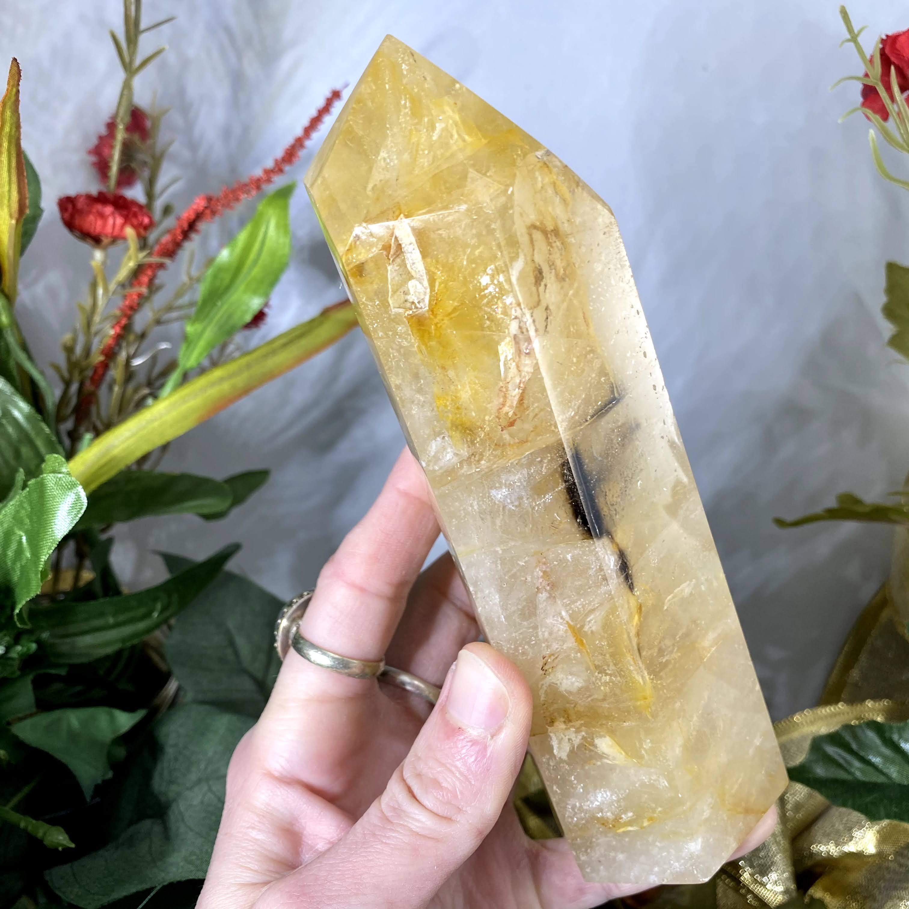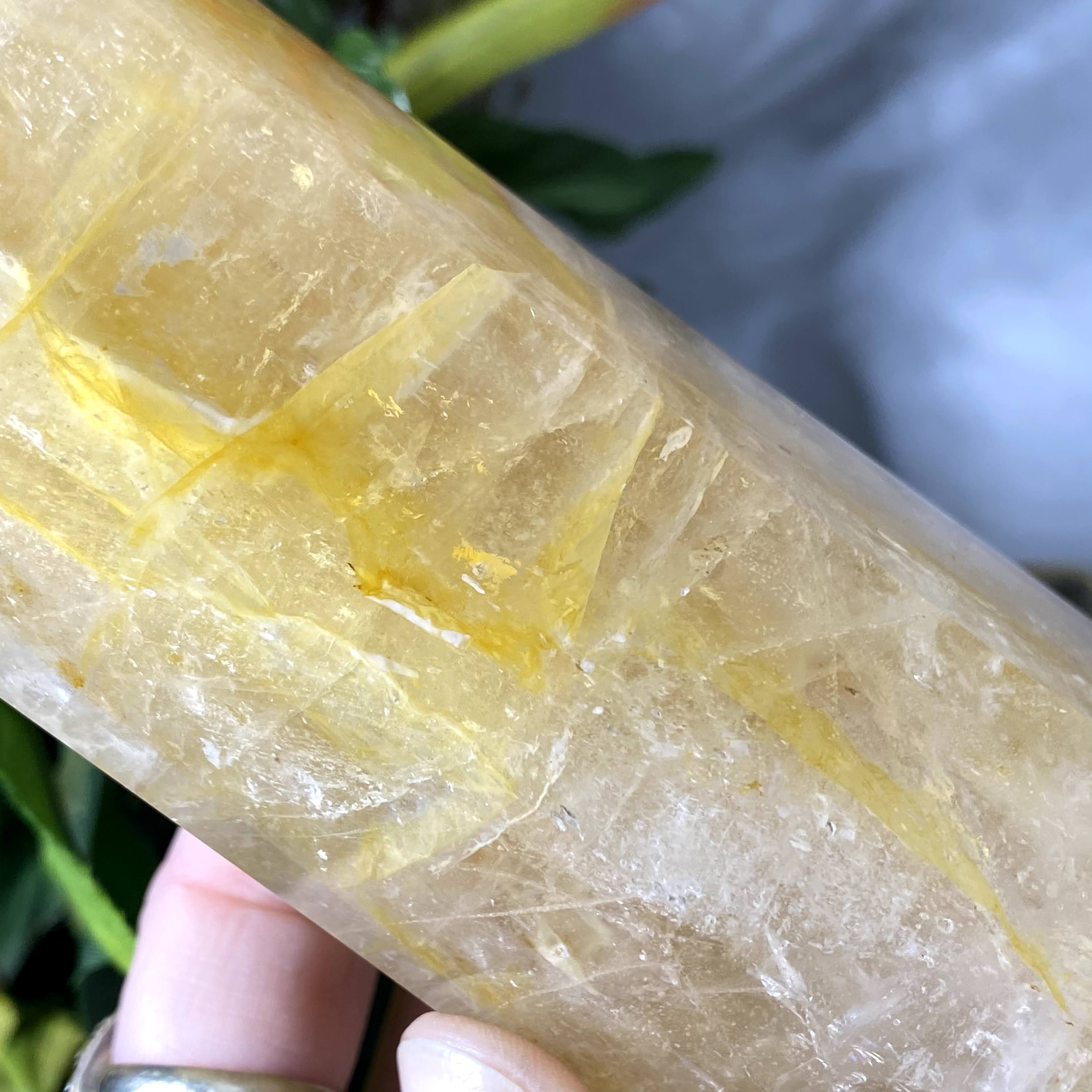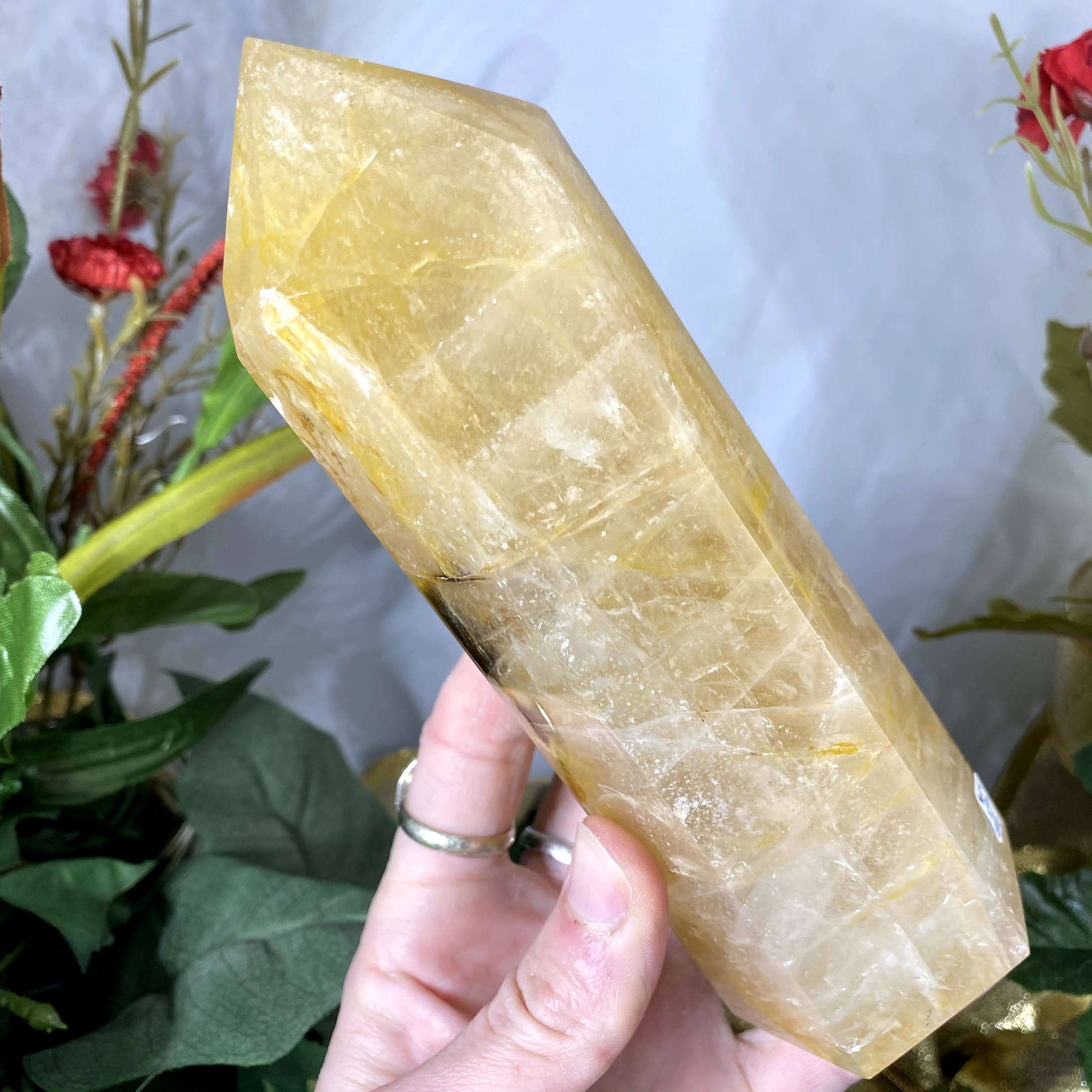 What a golden beauty!. A nice big golden healer tower that feels so good in my hands I don't want to put it down! Great to hold and for a space or grid (power grid!!!!). These golden layers are so easy to get hypnotized by. There is a noticeable lil hole towards the top, I honestly can't tell if it's a natural hole or chipped, see the video for the reference there. Either way it is an incredible additional to a collection or healing toolbox! I spot some good rainbows too, I'm always have a soft spot for those myself.