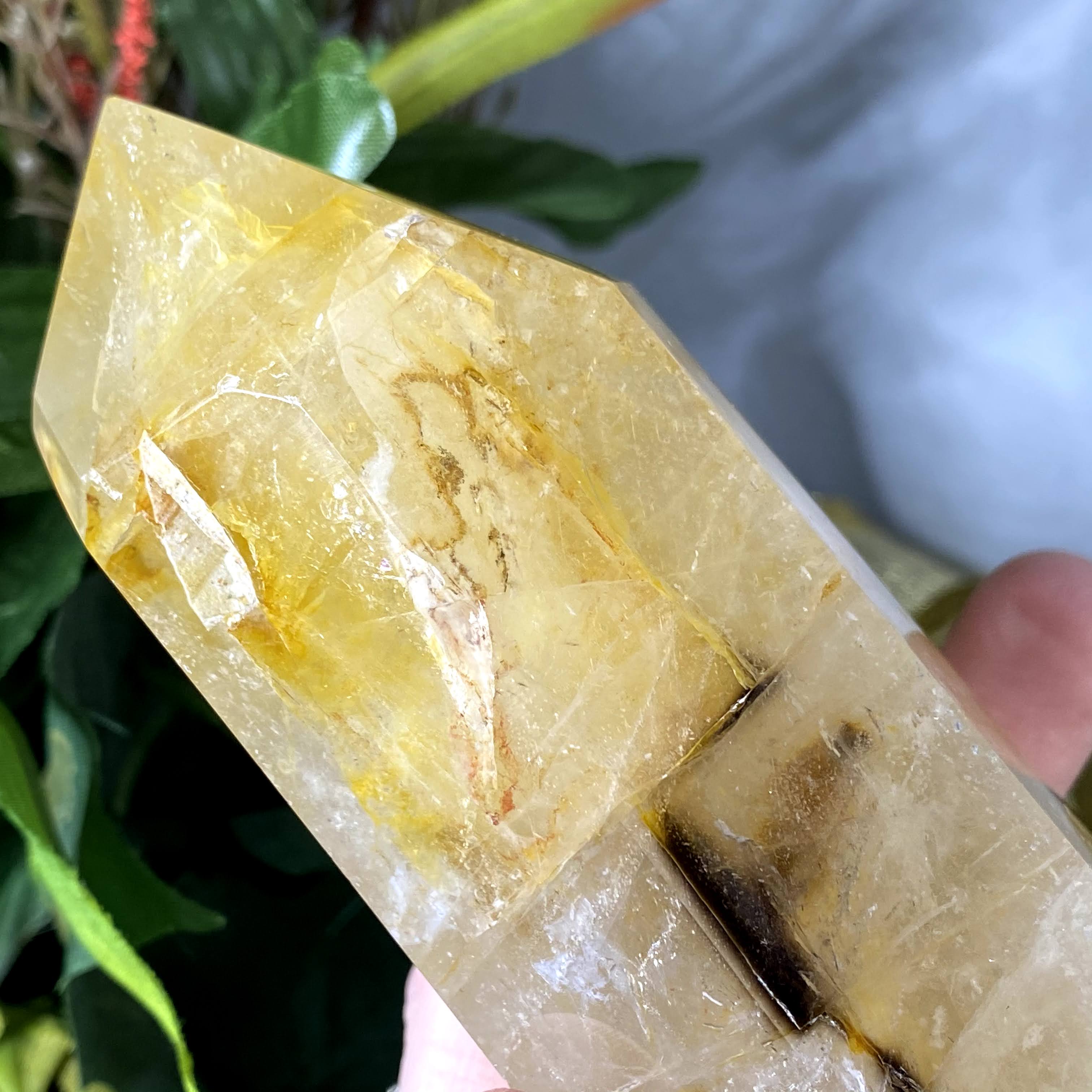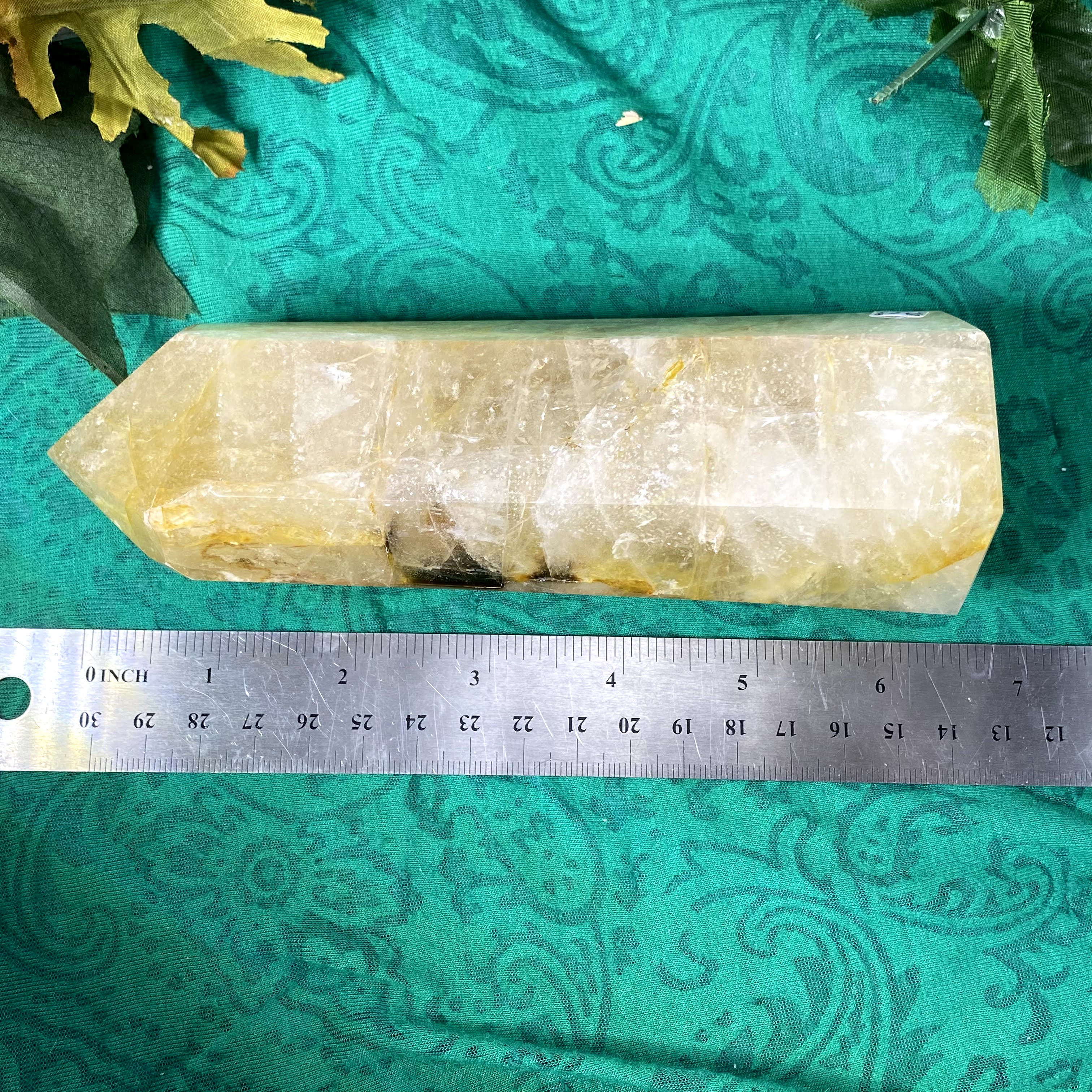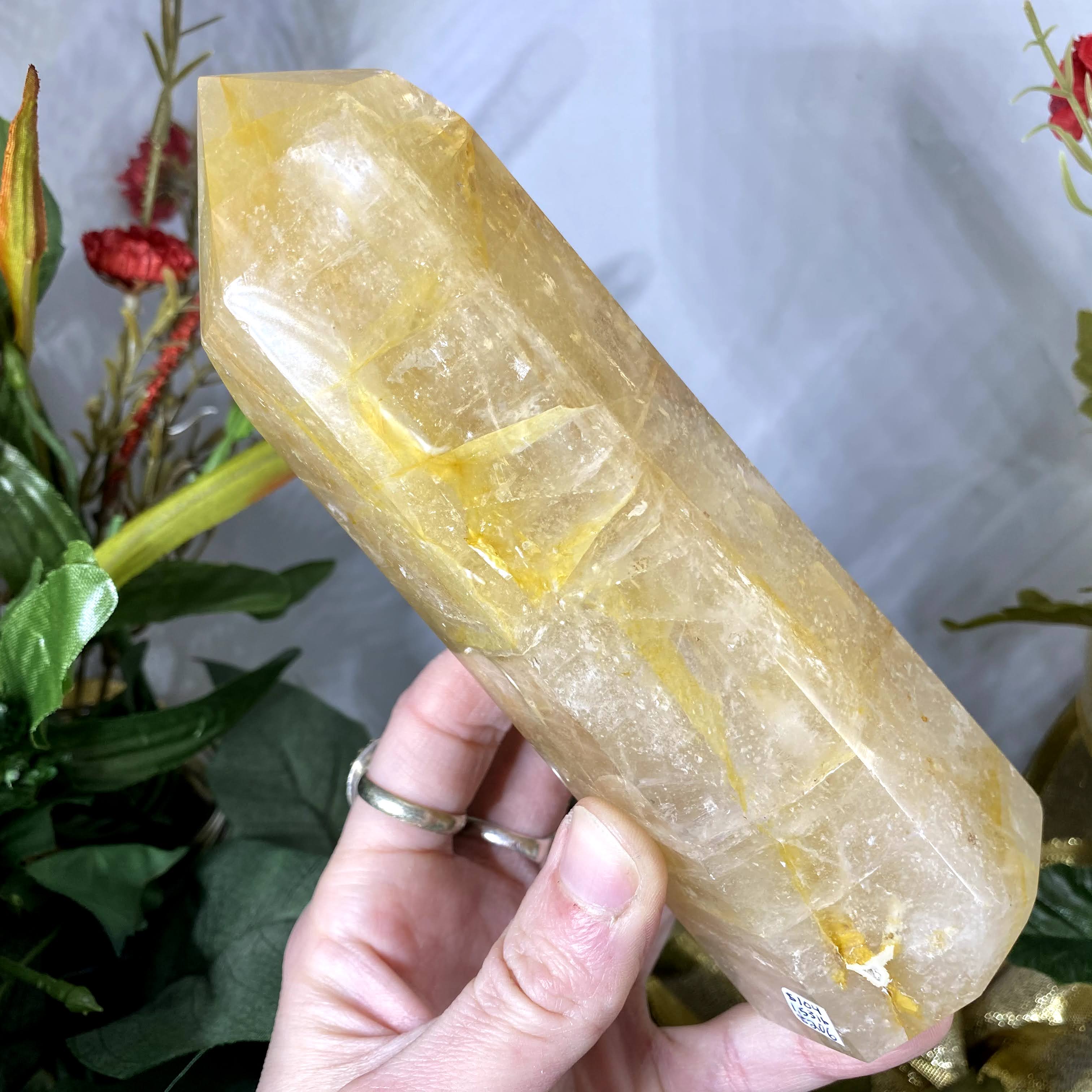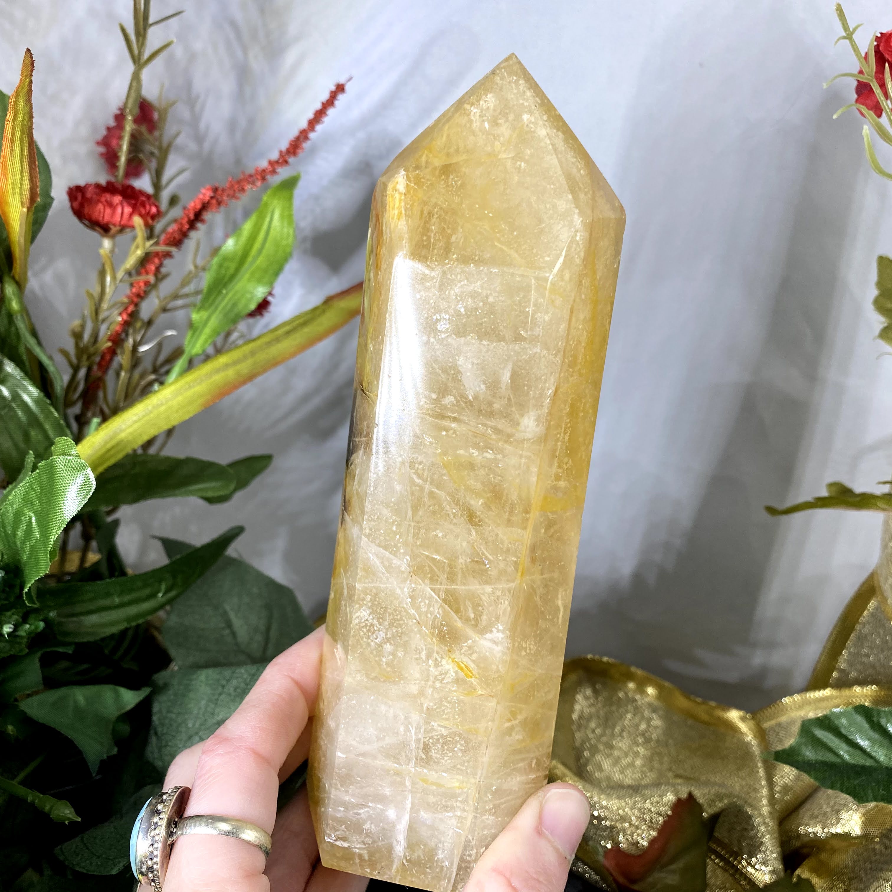 What a golden beauty!. A nice big golden healer tower that feels so good in my hands I don't want to put it down! Great to hold and for a space or grid (power grid!!!!). These golden layers are so easy to get hypnotized by. There is a noticeable lil hole towards the top, I honestly can't tell if it's a natural hole or chipped, see the video for the reference there. Either way it is an incredible additional to a collection or healing toolbox! I spot some good rainbows too, I'm always have a soft spot for those myself.