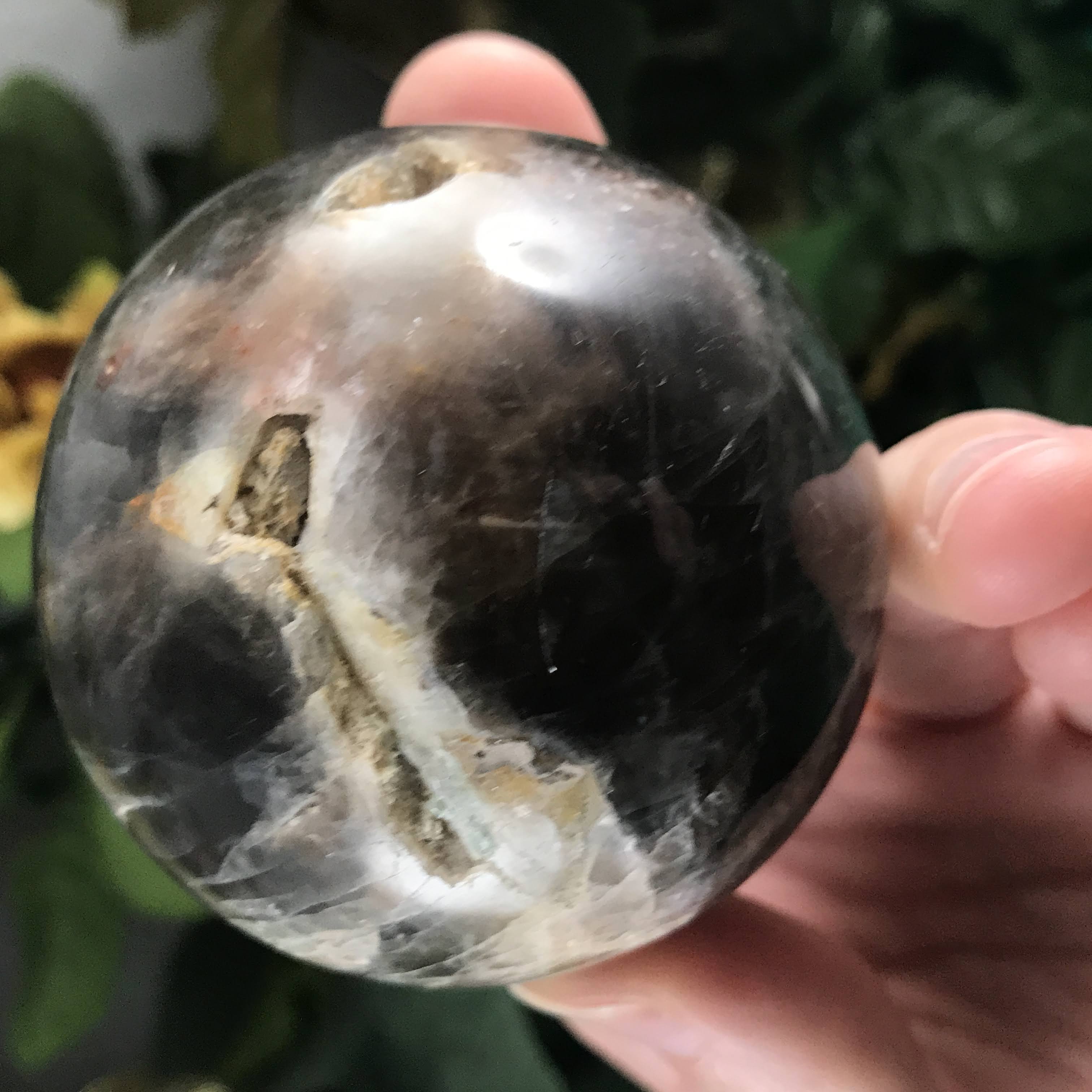 Gorgeous black & peach moonstone sphere! Sphere is 59mm and 9.84oz.
