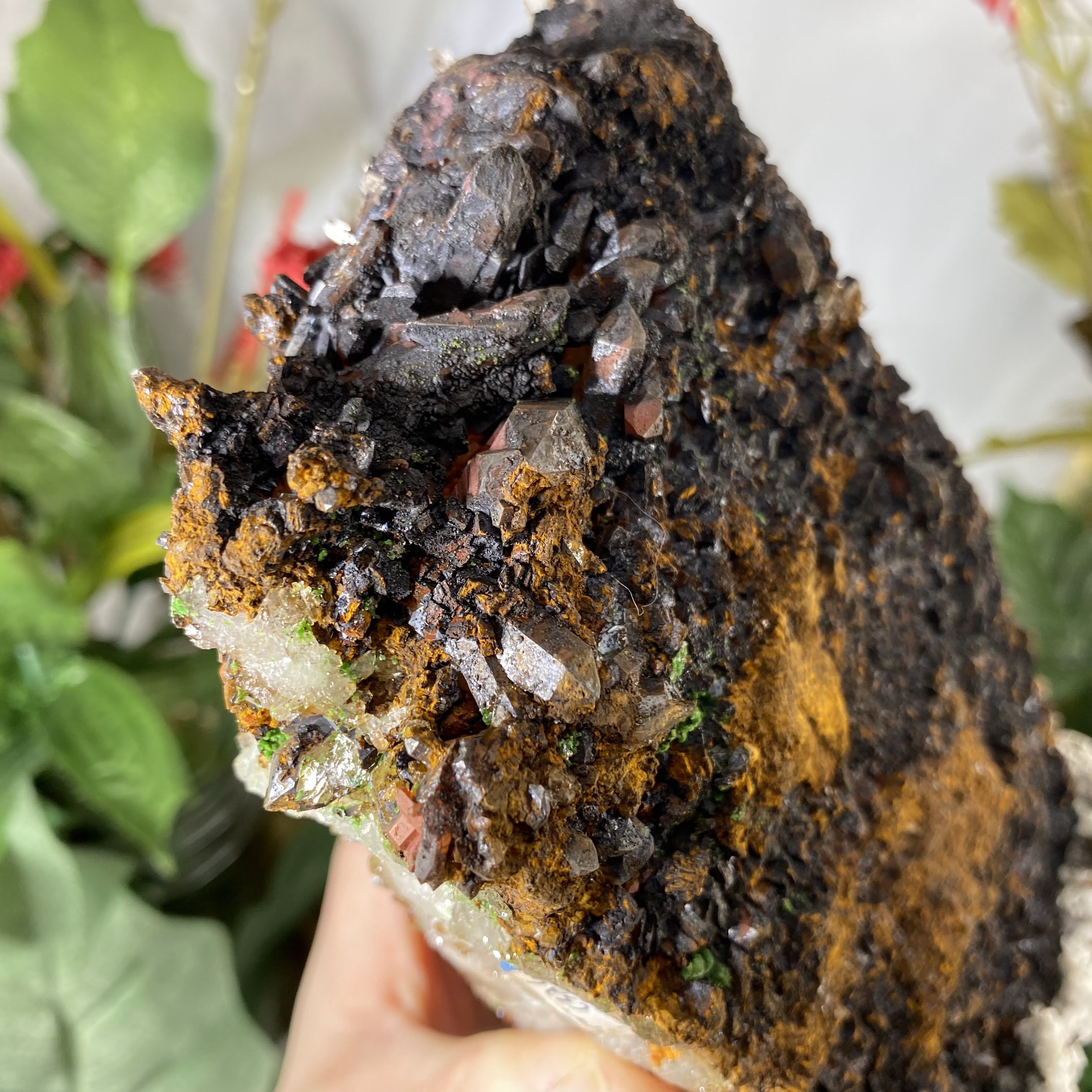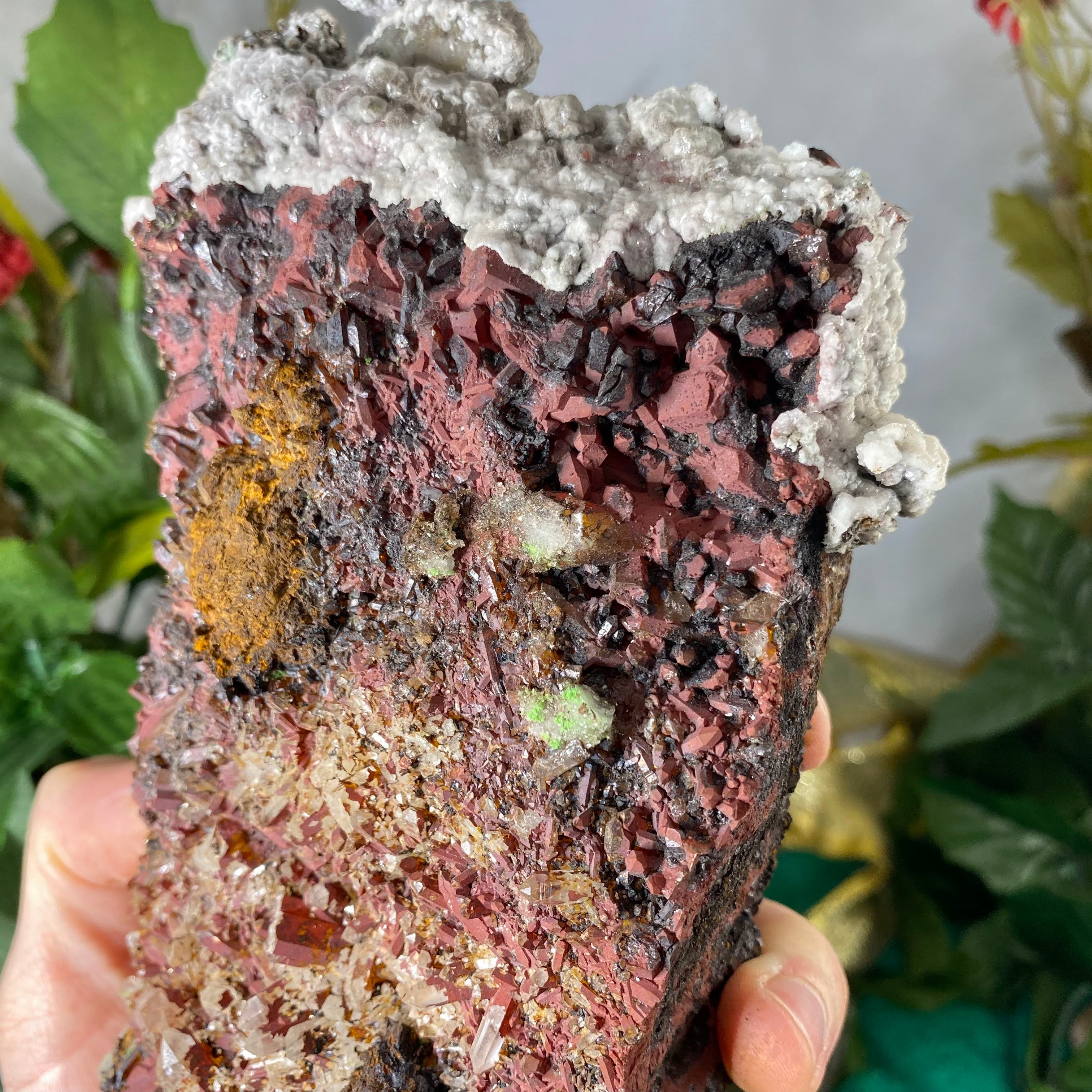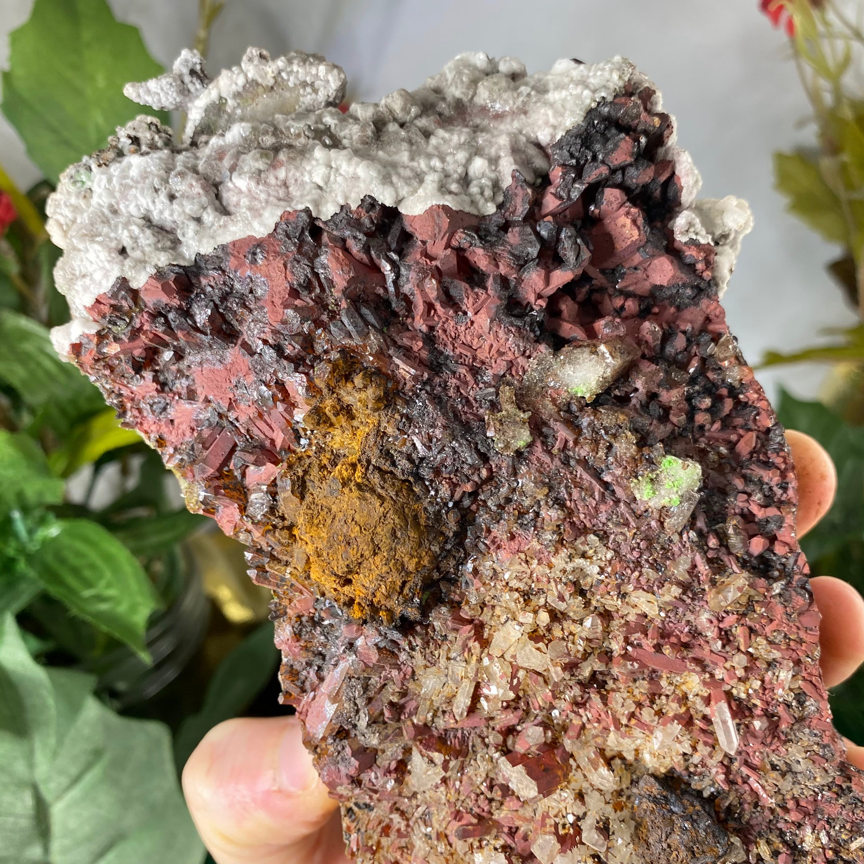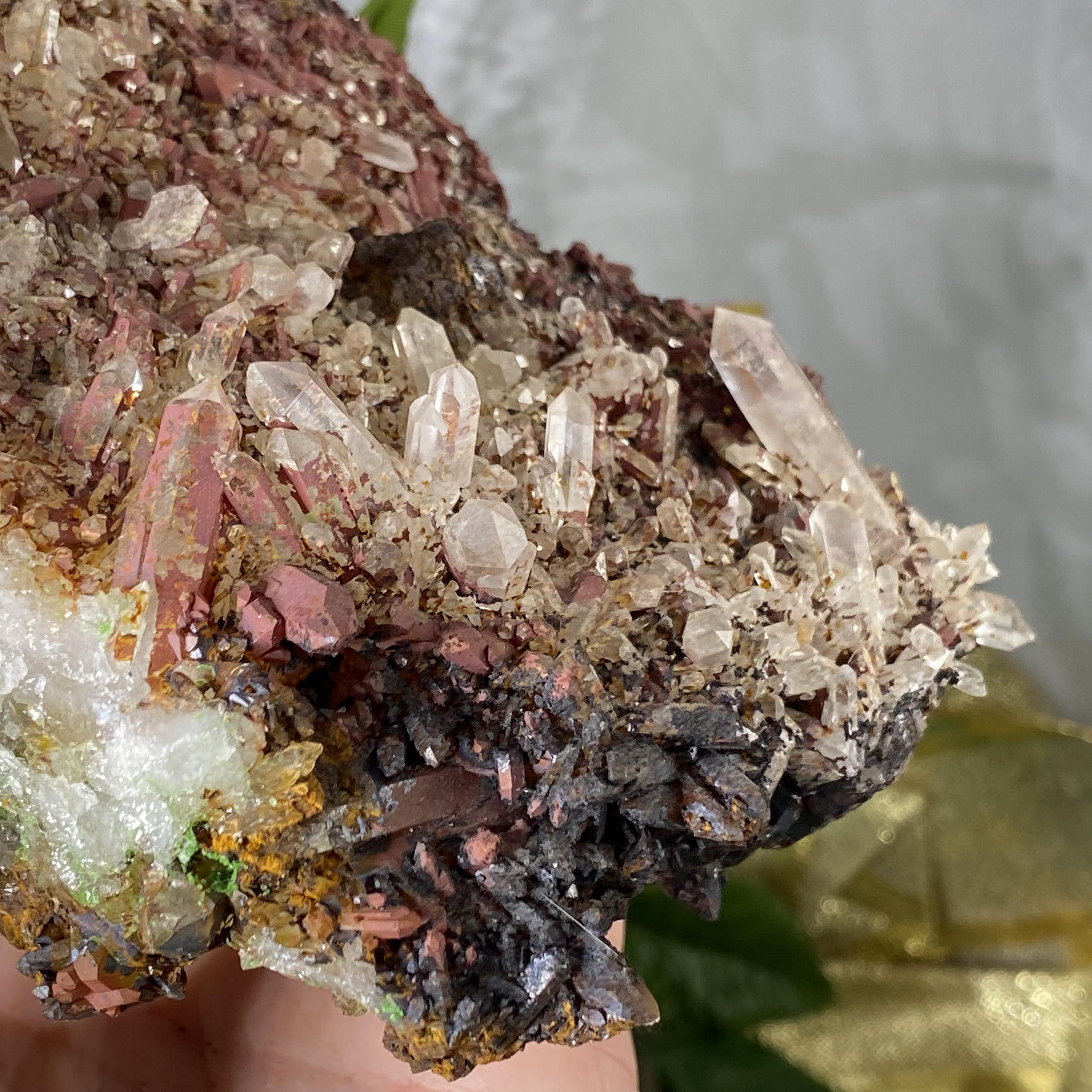 Lots to see and admire on this beauty! The hematite ranges the colors on this one from gold, to red, to deep blacks. There's TONS of quartz crystals all over in many directions, and calcite (white-ish) along with conichalcite (bright green) joining the party. This wild cluster is from Morocco and about 1.21 LBS.