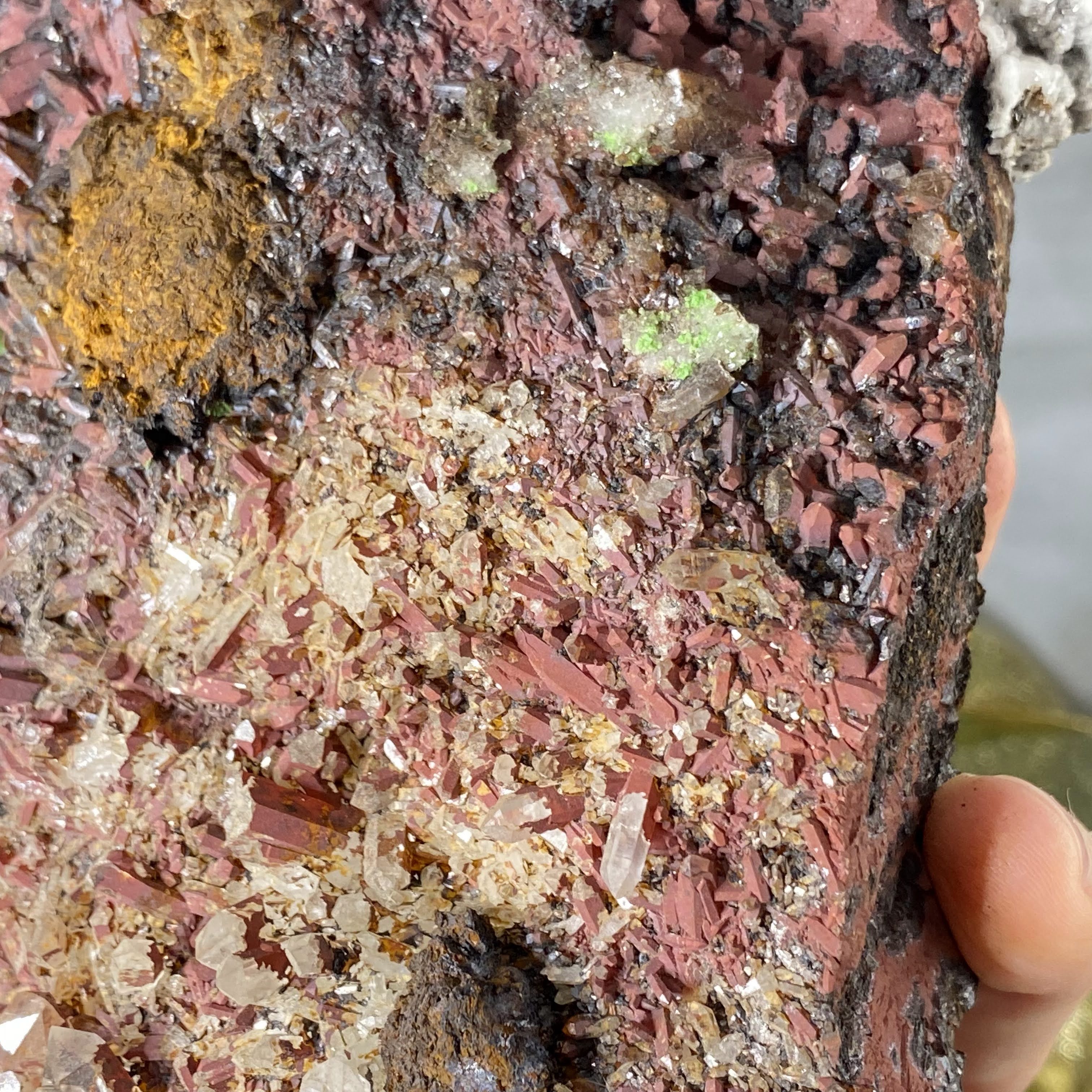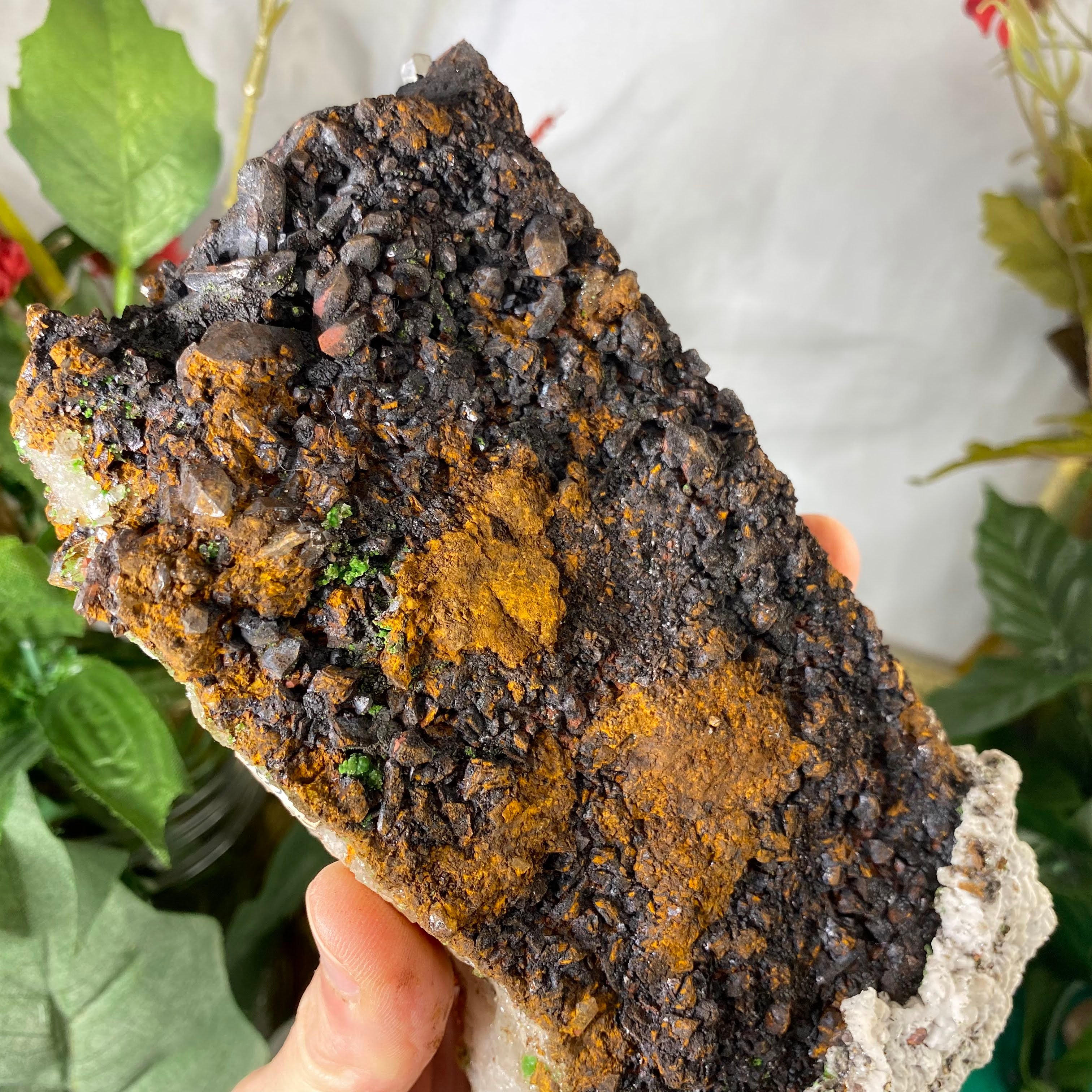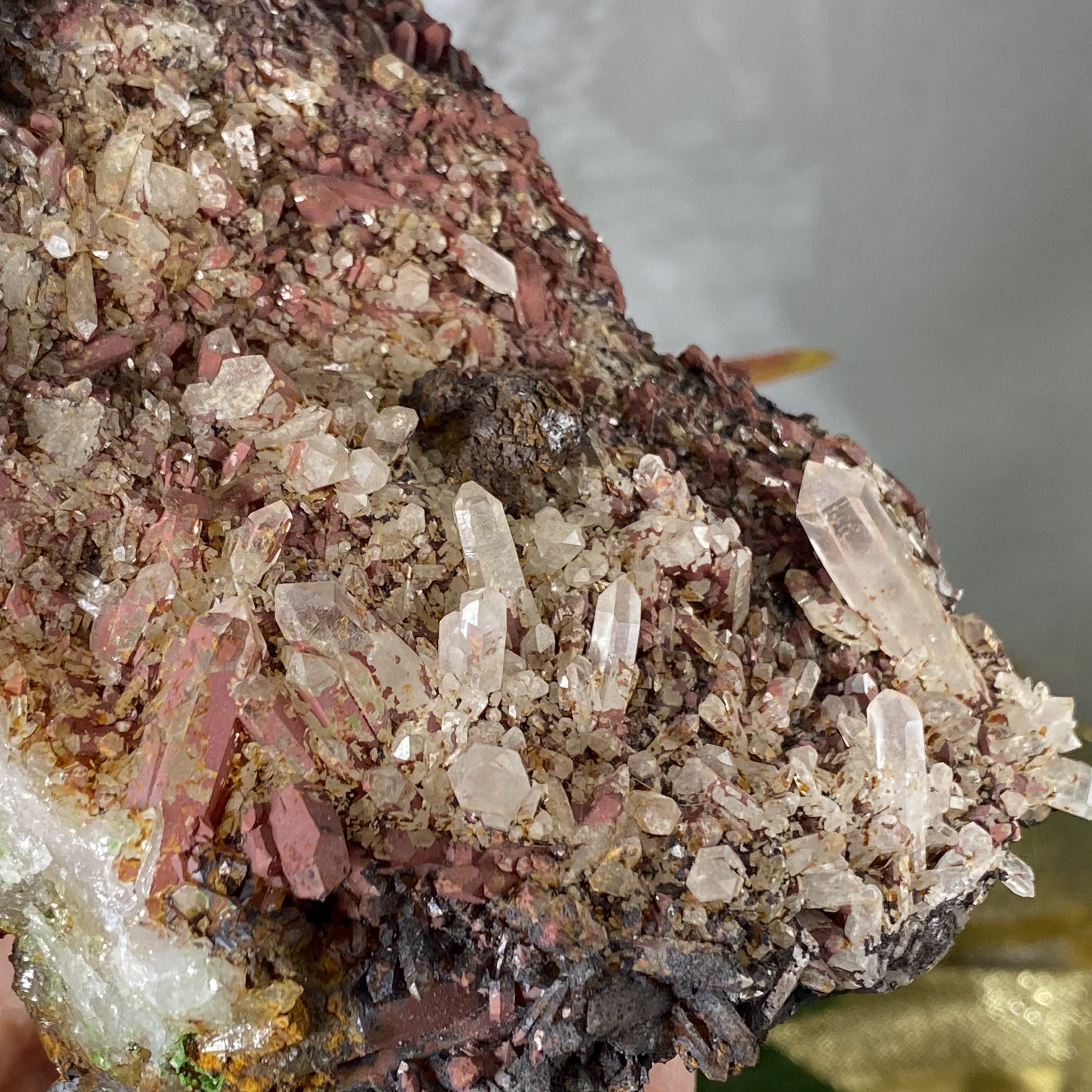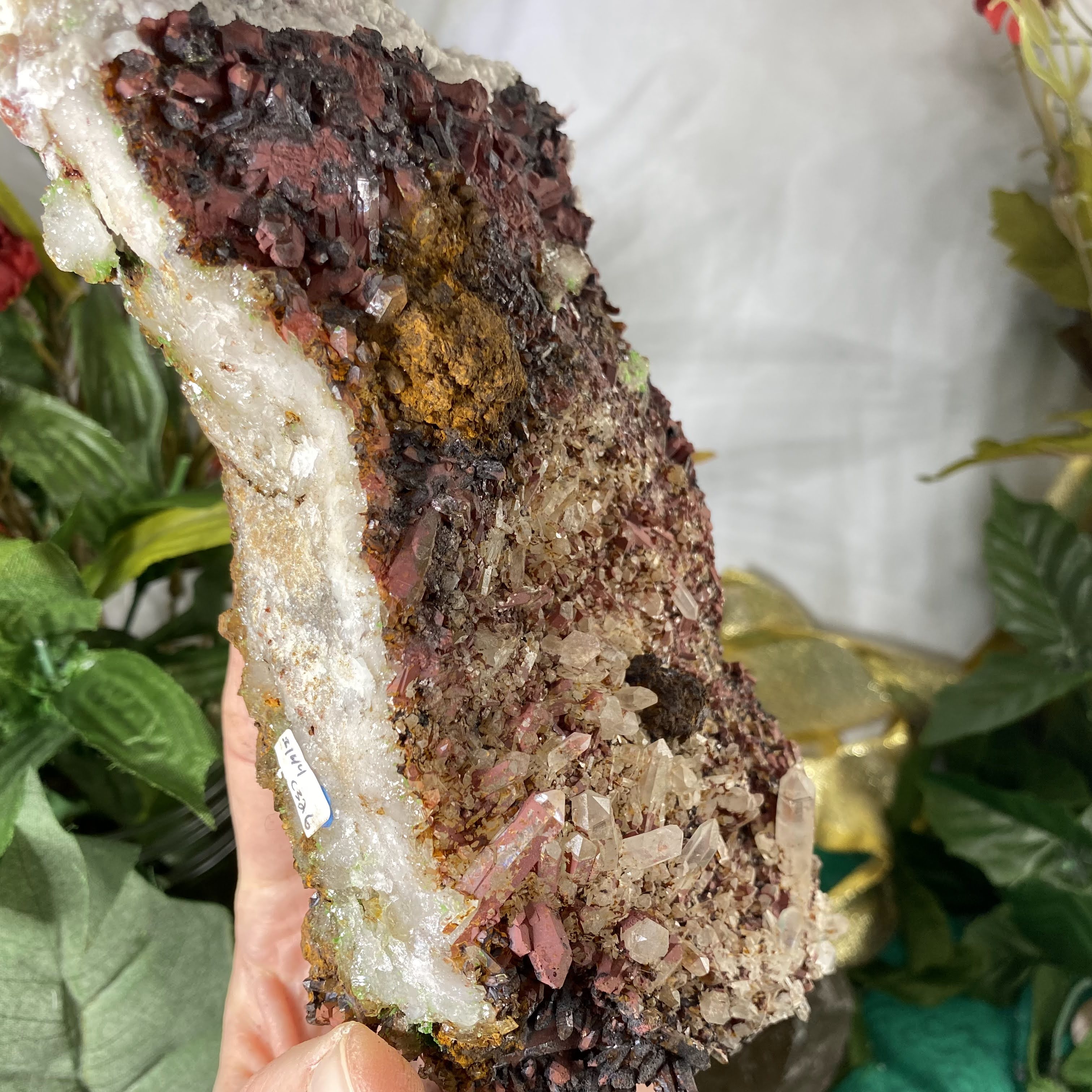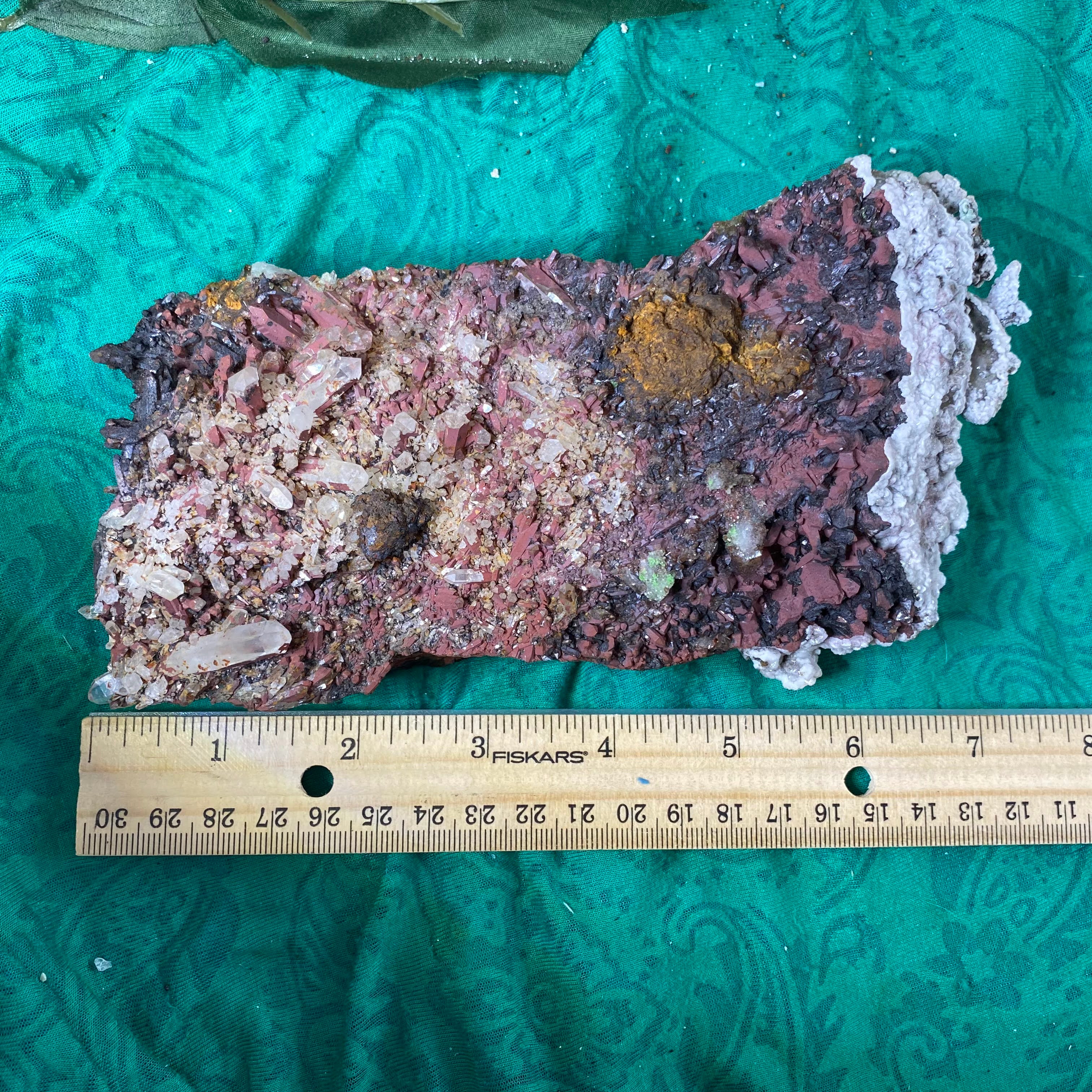 Lots to see and admire on this beauty! The hematite ranges the colors on this one from gold, to red, to deep blacks. There's TONS of quartz crystals all over in many directions, and calcite (white-ish) along with conichalcite (bright green) joining the party. This wild cluster is from Morocco and about 1.21 LBS.