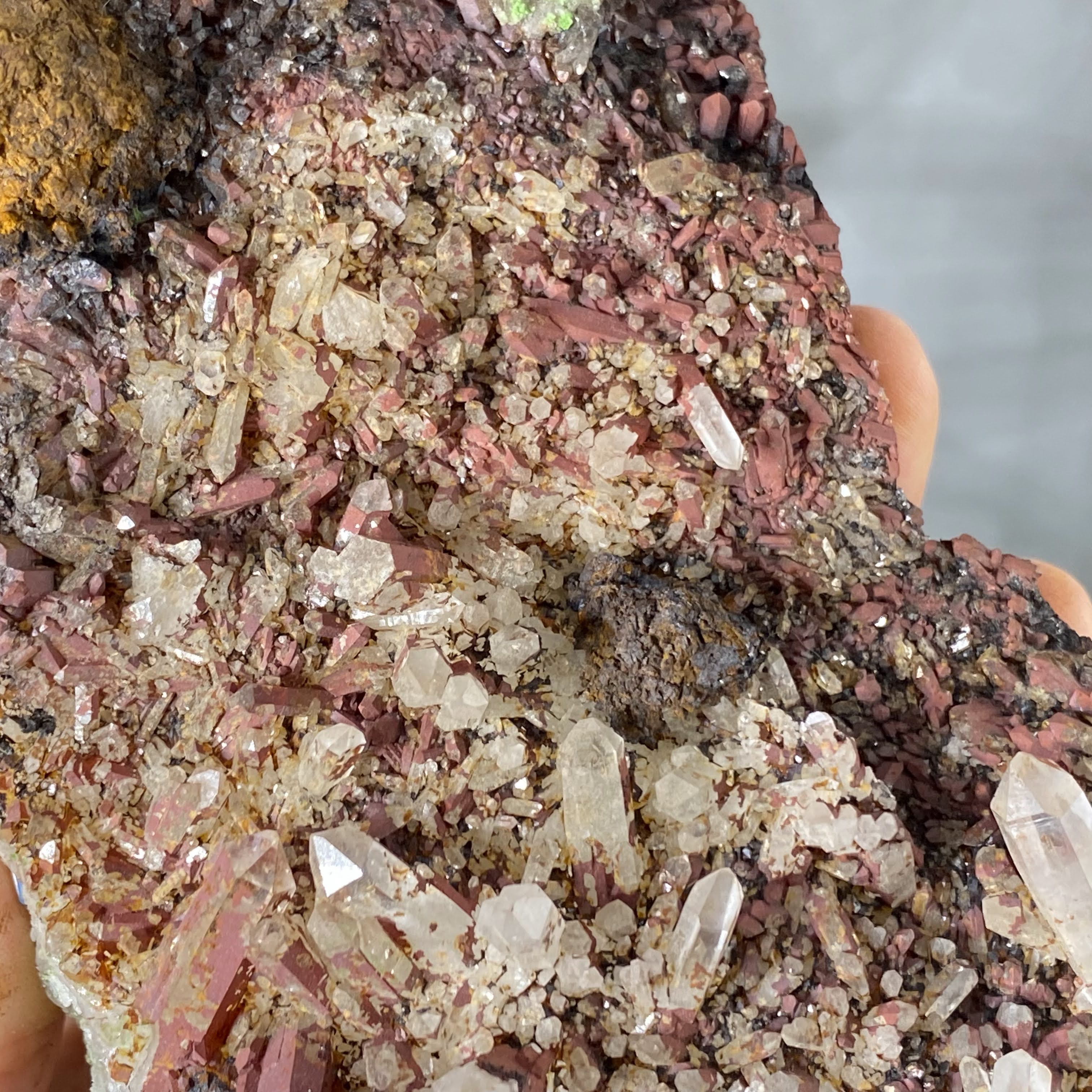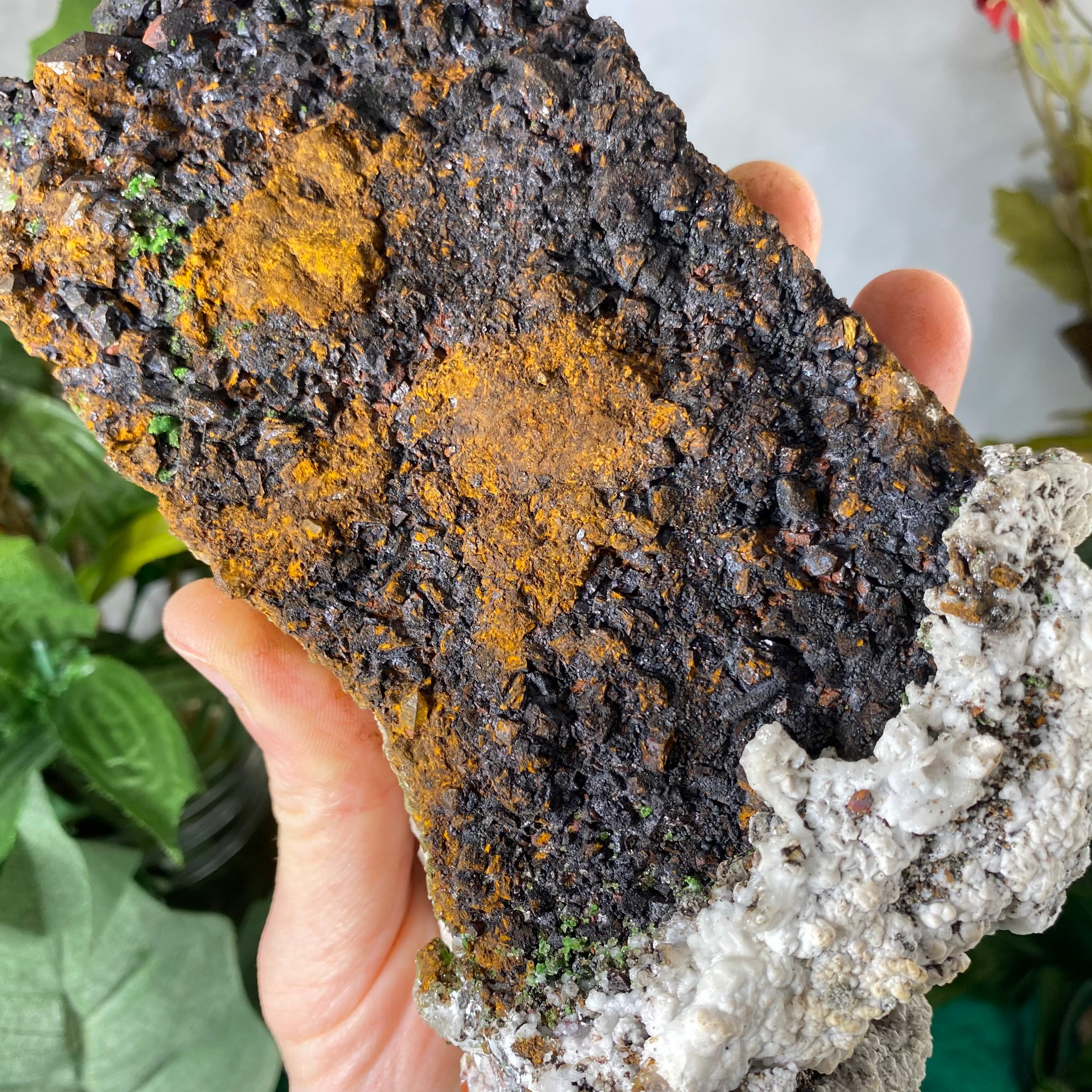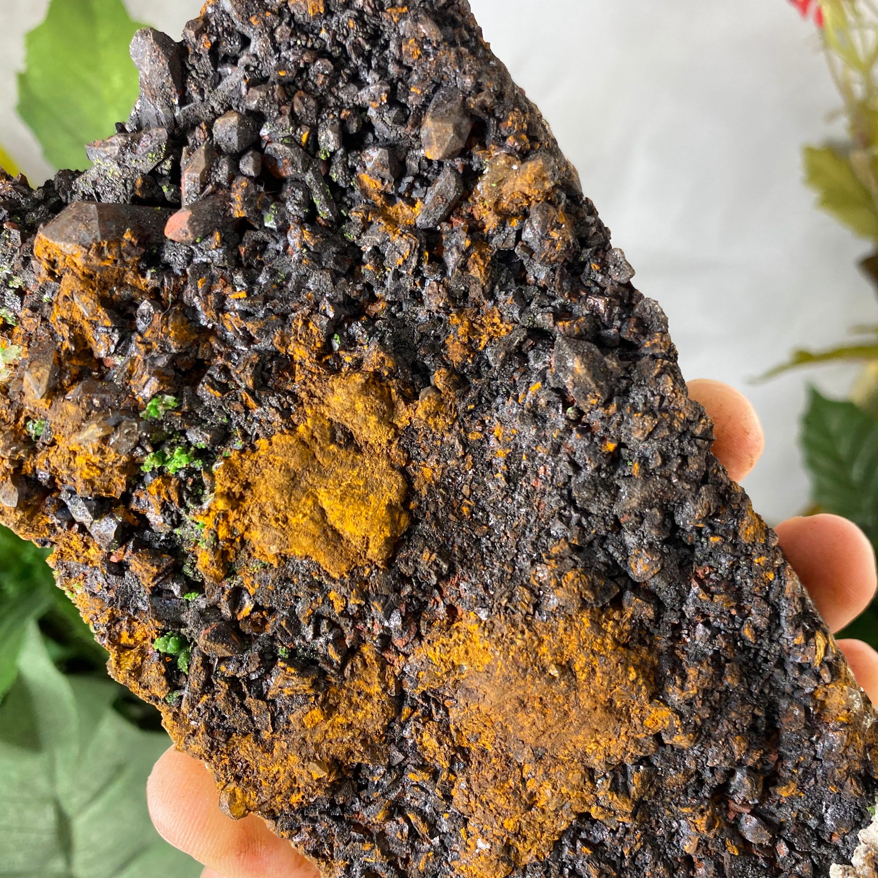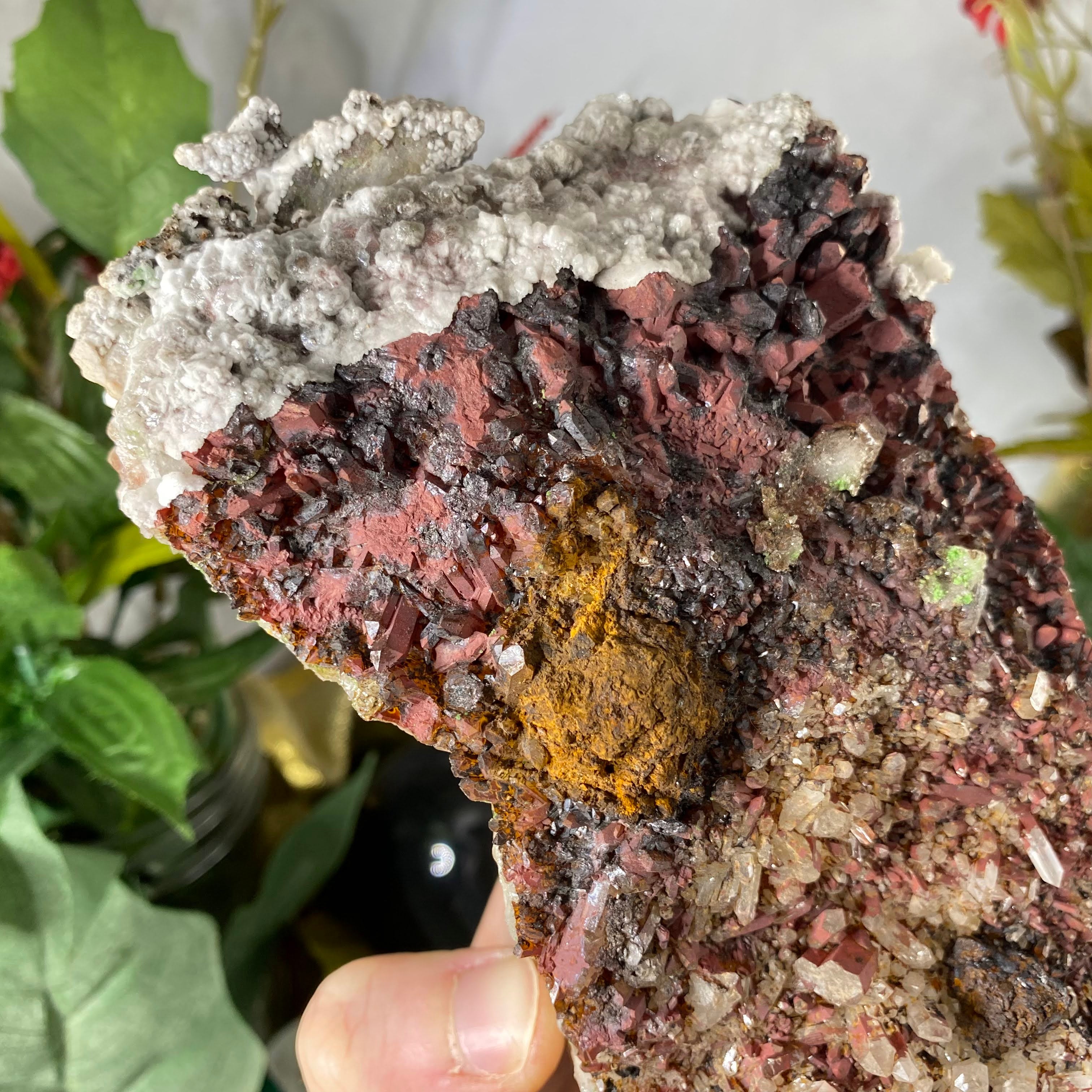 Lots to see and admire on this beauty! The hematite ranges the colors on this one from gold, to red, to deep blacks. There's TONS of quartz crystals all over in many directions, and calcite (white-ish) along with conichalcite (bright green) joining the party. This wild cluster is from Morocco and about 1.21 LBS.