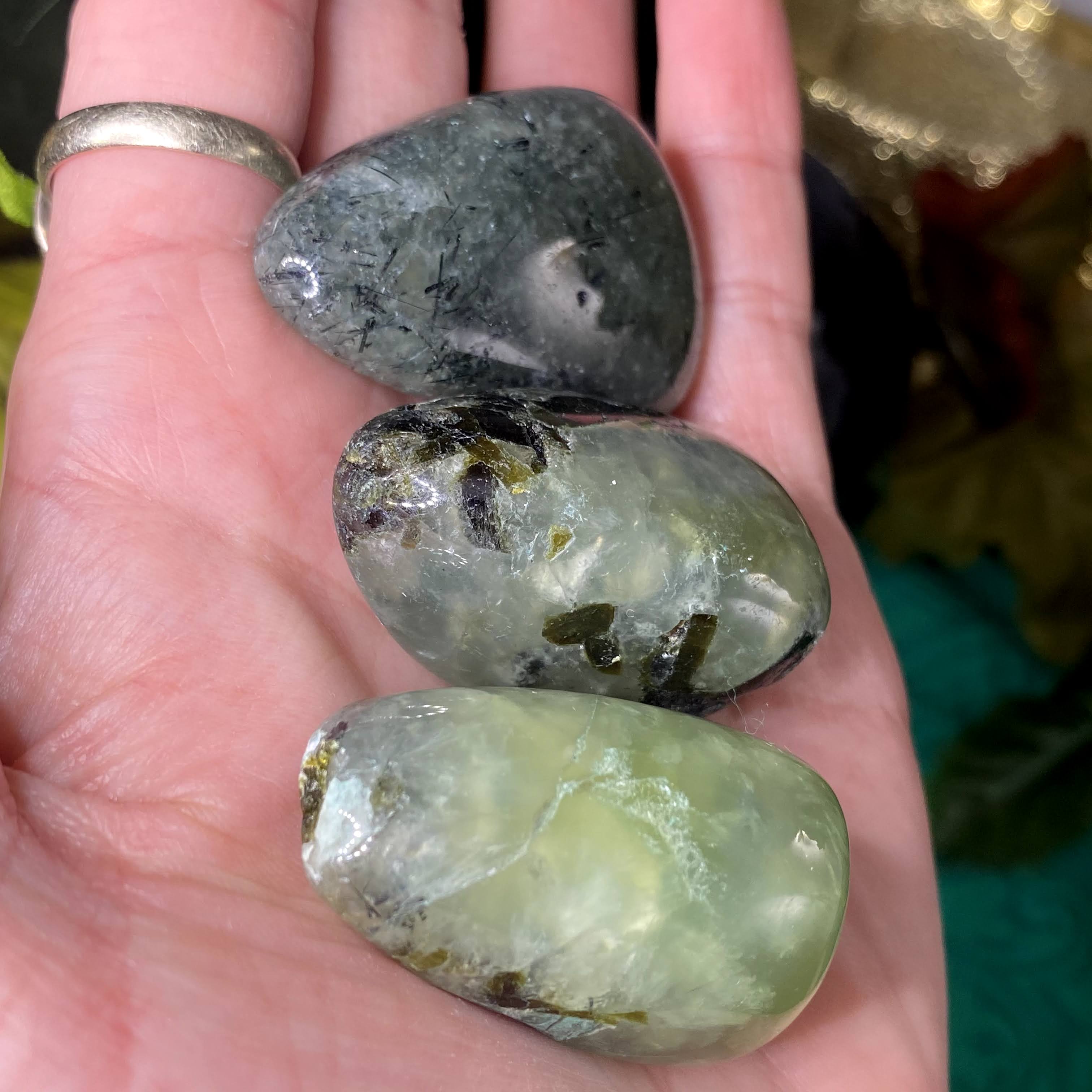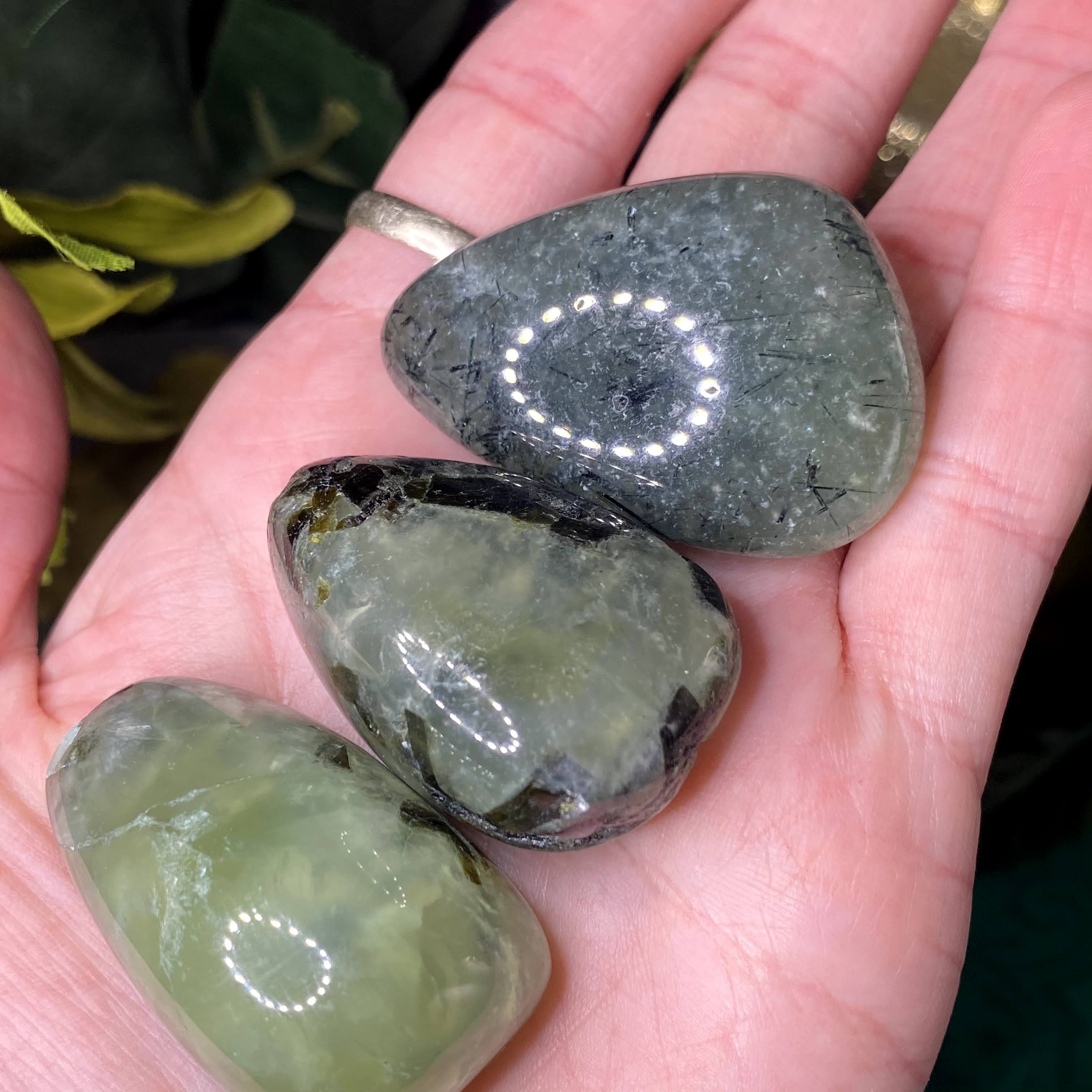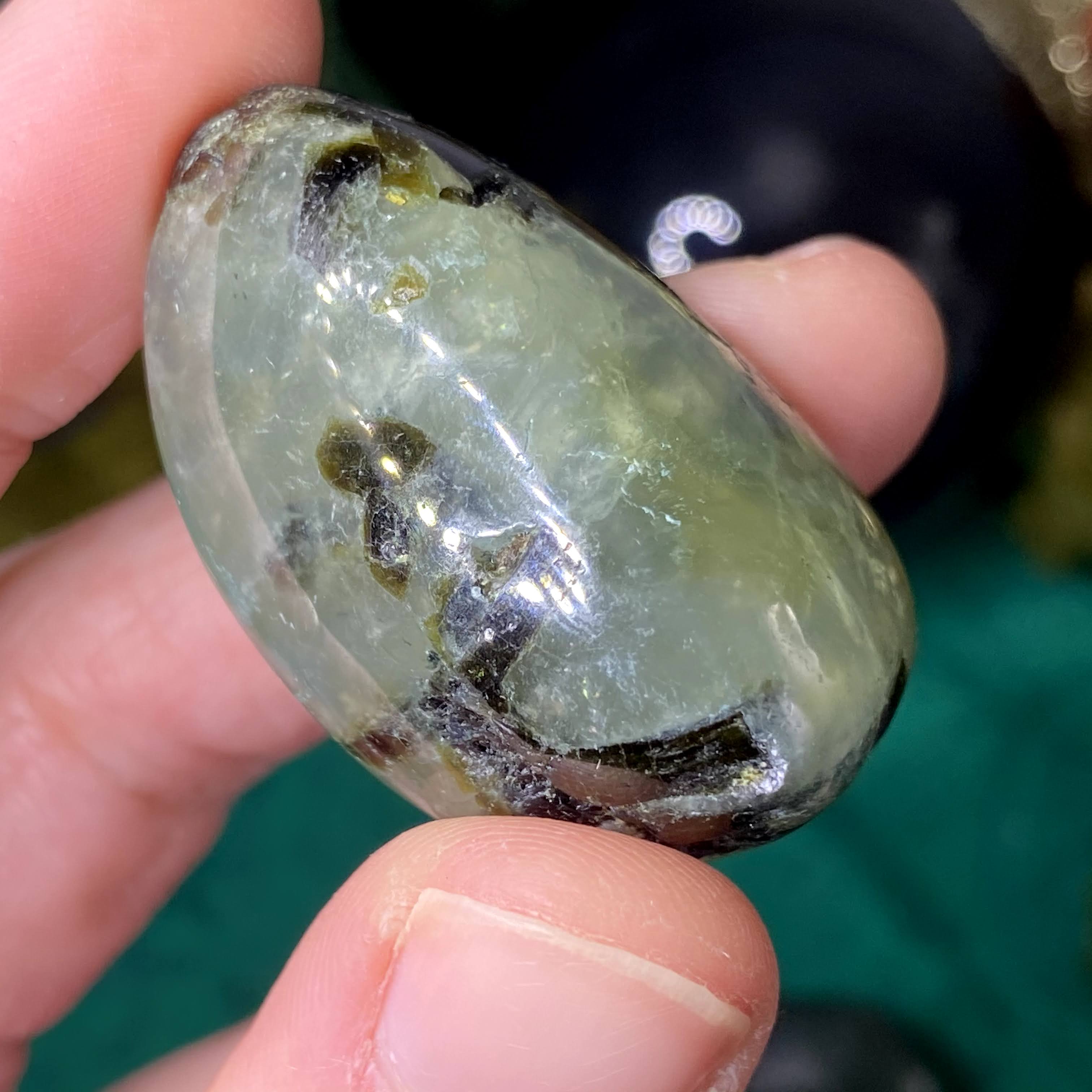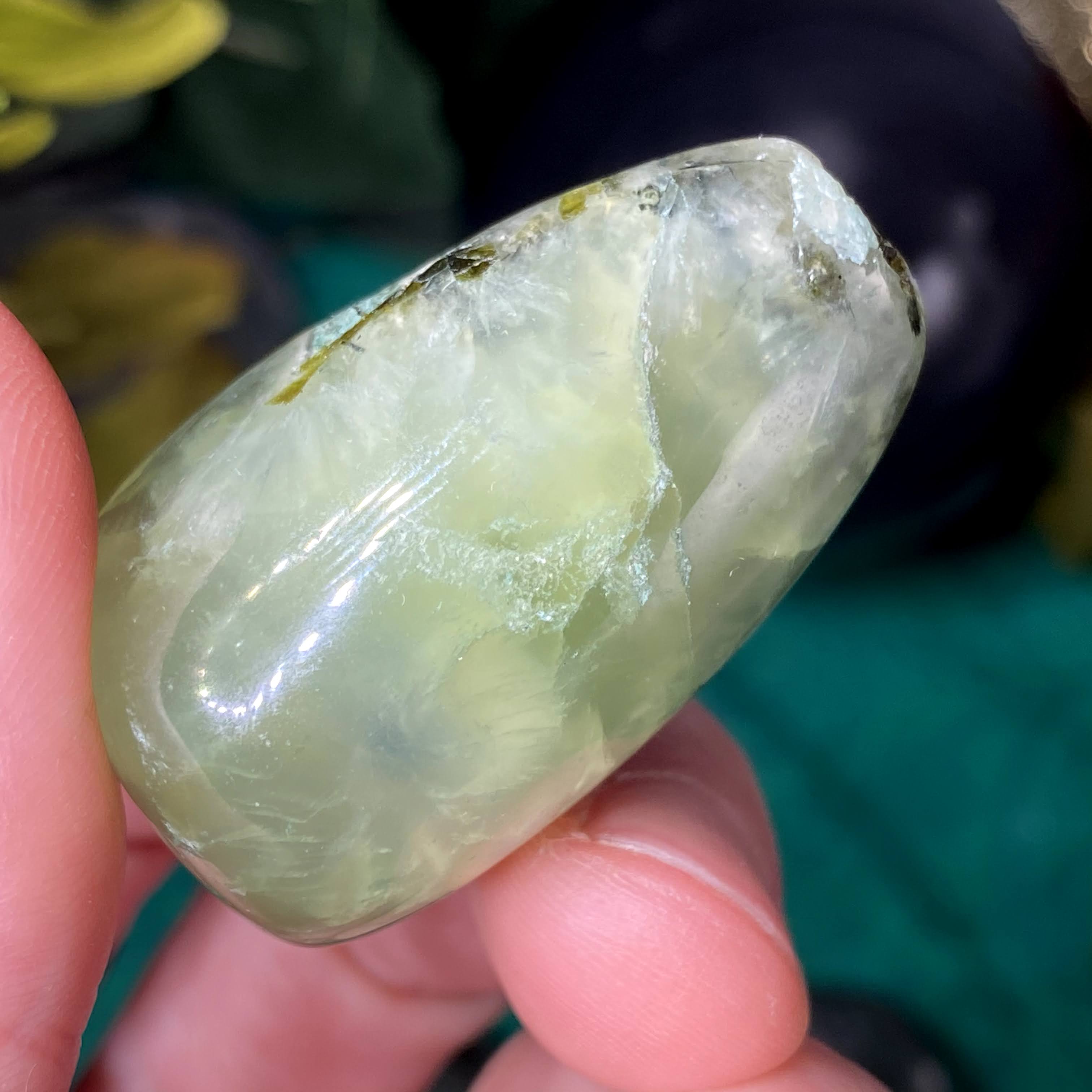 Prehnite is a good one to help one let go of things, especially material possessions & get get organized. When one feels the need to fill the “empty spaces inside” with things, prehnite can help us connect to divine and self love to realize we don’t need those things, see that your cup is full & let go what we no longer need. You can manifest anything that you truly do need.
