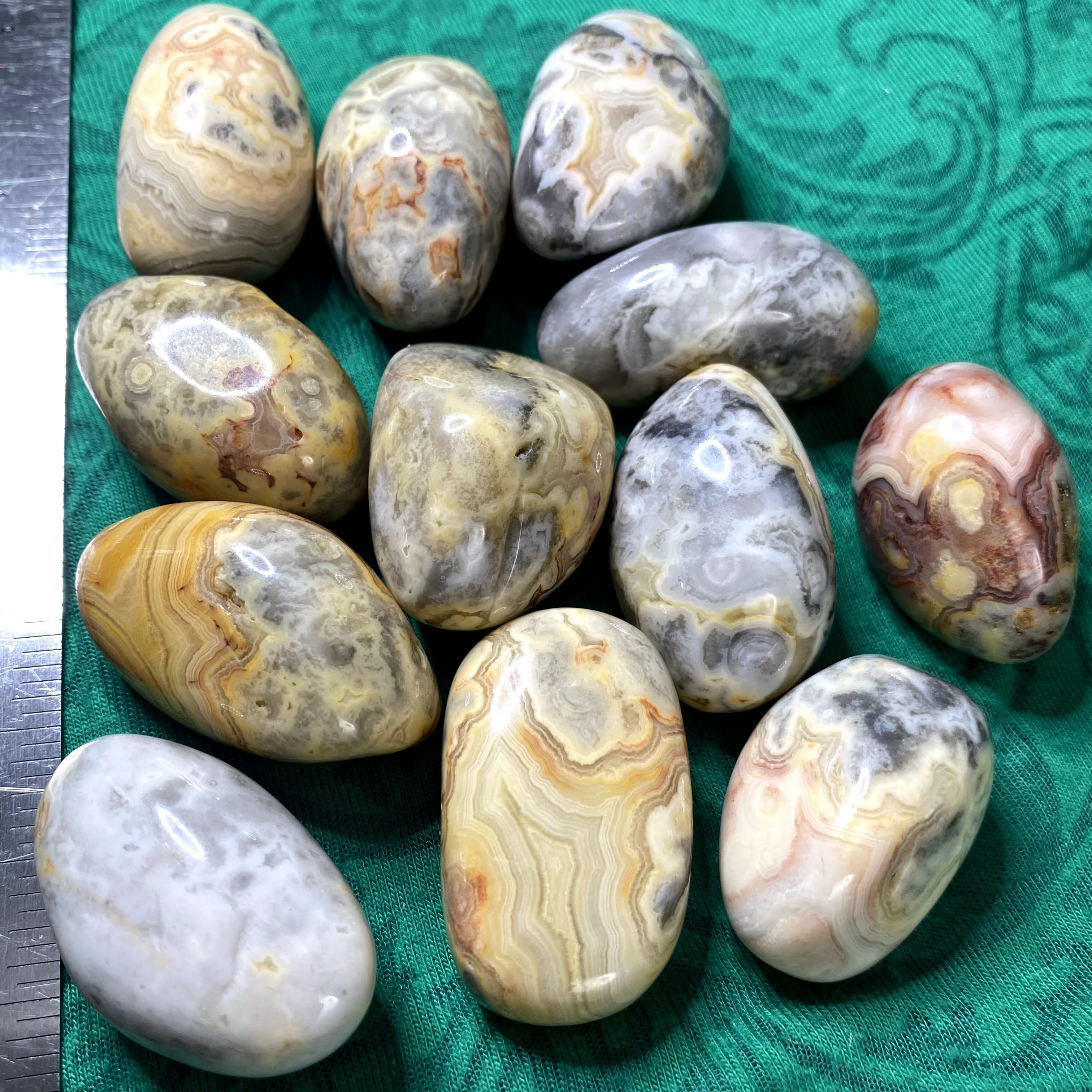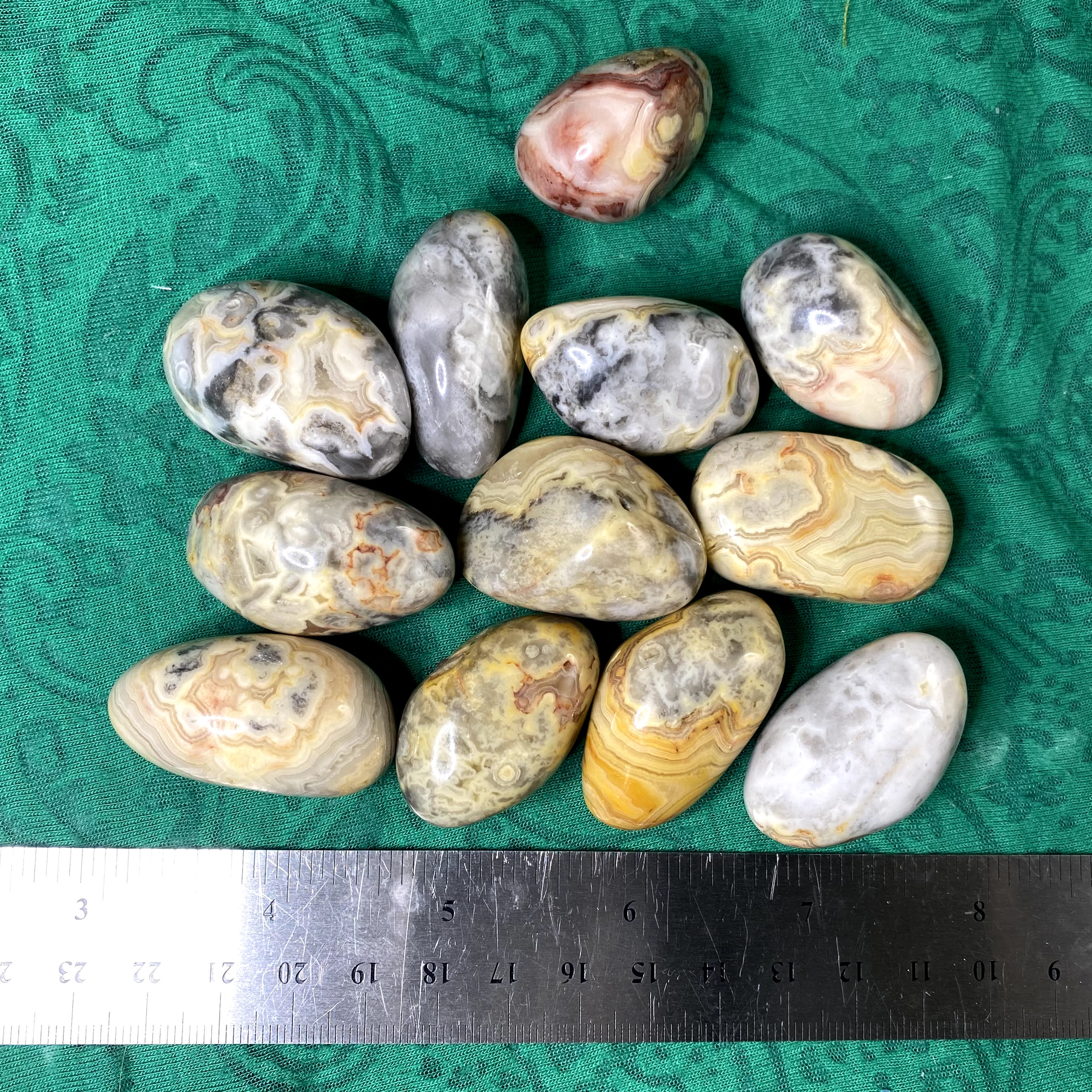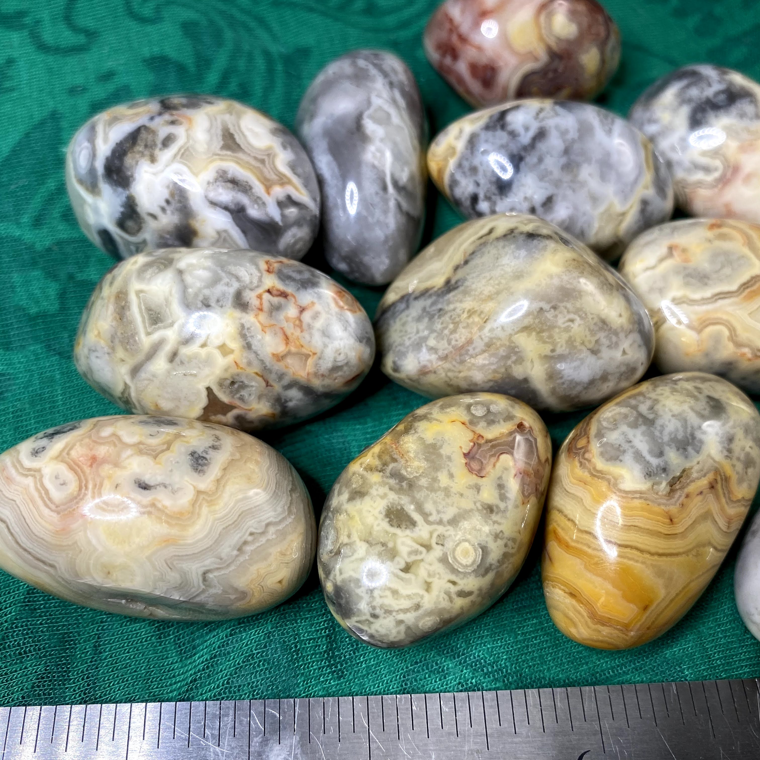 Crazy Lace Agate /Mexican Lace Agate - This type of agate has inclusions of aluminum & iron, & shows off hypnotizing lace and paisley patterns, usually including some of the colors of red, white, grey, brown, black, and yellow. Other colors may be present too!  Lace agate is excellent to help bring balance, strength, and steadiness to the physical body, especially when currently in a “lower” physical state. May help us to understand the perfection that we can be, and the steps and paths available to us to reach the heights of awareness. It’s a soother, calmer, grounder, but also & very uplifting and happy stone! It’s especially clearing & uplifting out of the agates, helping one to laugh & find joy in what’s around us. Also excellent for inspiring creativity and getting in the flow of creation states.